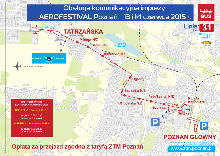 Santocka Obsługa komunikacyjna imprezy AEROFESTIVAL Poznań 13 i 14 czerwca 2015 r. Dąbrowskie go BUS Linia: Line: TATRZAŃSKA 31 PRZYSTANEK KOŃCOWY PRZYSTANEK KOŃCOWO POCZĄTKOWY Pilotów N/Ż Jezioro Rusałka Przelot N/Ż R Bużańska N/Ż Dą ieg o Ogrody Sz pit aln a Lotnisko Ławica bro ws k Szpitalna N/Ż w godz. 8.00-22.00 kursy co 10 minut a ka lta Szylinga a ldzk nwa Gru 48, 59, 77 51, 68 63, 69 Bałtyk Rooseve SOBOTA - 13 czerwca 2015 r. Bukow s nd Grodziska N/Ż Rondo Kaponiera la CZĘSTOTLIWOŚCI KURSOWANIA AUTOBUSÓW Poln/Szpital N/Ż Ze y Bukow ska mos t Dw orco wy NIEDZIELA - 14 czerwca 2015 r. w godz. 8.00-20.00 kursy co 10 minut Wujka POZNAŃ GŁÓWNY Opłata za przejazd zgodna z taryfą ZTM Poznań