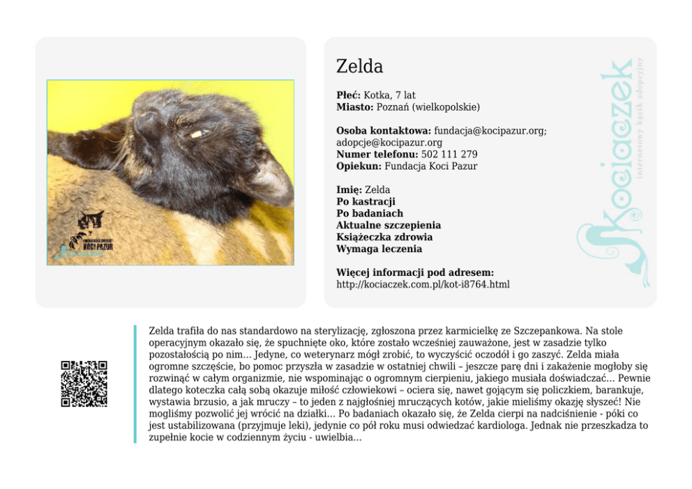 Zelda Płeć: Kotka, 7 lat Miasto: Poznań (wielkopolskie) Osoba kontaktowa: [email protected]; [email protected] Numer telefonu: 502 111 279 Opiekun: Fundacja Koci Pazur Imię: Zelda Po kastracji Po badaniach Aktualne szczepienia Książeczka zdrowia Wymaga leczenia Więcej informacji pod adresem: http://kociaczek.com.pl/kot-i8764.html Zelda trafiła do nas standardowo na sterylizację, zgłoszona przez karmicielkę ze Szczepankowa. Na stole operacyjnym okazało się, że spuchnięte oko, które zostało wcześniej zauważone, jest w zasadzie tylko pozostałością po nim… Jedyne, co weterynarz mógł zrobić, to wyczyścić oczodół i go zaszyć. Zelda miała ogromne szczęście, bo pomoc przyszła w zasadzie w ostatniej chwili – jeszcze parę dni i zakażenie mogłoby się rozwinąć w całym organizmie, nie wspominając o ogromnym cierpieniu, jakiego musiała doświadczać… Pewnie dlatego koteczka całą sobą okazuje miłość człowiekowi – ociera się, nawet gojącym się policzkiem, barankuje, wystawia brzusio, a jak mruczy – to jeden z najgłośniej mruczących kotów, jakie mieliśmy okazję słyszeć! Nie mogliśmy pozwolić jej wrócić na działki… Po badaniach okazało się, że Zelda cierpi na nadciśnienie - póki co jest ustabilizowana (przyjmuje leki), jedynie co pół roku musi odwiedzać kardiologa. Jednak nie przeszkadza to zupełnie kocie w codziennym życiu - uwielbia…