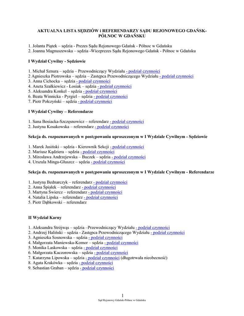 AKTUALNA LISTA SĘDZIÓW i REFERENDARZY SĄDU REJONOWEGO GDAŃSKPÓŁNOC W GDAŃSKU 1. Jolanta Piątek – sędzia - Prezes Sądu Rejonowego Gdańsk - Północ w Gdańsku 2. Joanna Magnuszewska – sędzia -Wiceprezes Sądu Rejonowego Gdańsk - Północ w Gdańsku I Wydział Cywilny - Sędziowie 1. Michał Sznura – sędzia – Przewodniczący Wydziału - podział czynności 2 Agnieszka Piotrowska – sędzia – Zastępca Przewodniczącego Wydziału - podział czynności 3. Anna Cichocka – sędzia - podział czynności 4. Aneta Szałkiewicz - Łosiak – sędzia - podział czynności 5. Aleksandra Konkel – sędzia - podział czynności 6. Beata Winnicka - Pyrgiel – sędzia - podział czynności 7. Piotr Połczyński – sędzia - podział czynności I Wydział Cywilny – Referendarze 1. Sana Bosiacka-Szczęsnowicz – referendarz - podział czynności 2. Justyna Kosakowska – referendarz - podział czynności Sekcja ds. rozpoznawanych w postępowaniu uproszczonym w I Wydziale Cywilnym - Sędziowie 1. Marek Jasiński – sędzia - Kierownik Sekcji - podział czynności 2. Mariusz Kądziera – sędzia - podział czynności 3. Mirosława Andrzejewska – Buczek – sędzia - podział czynności 4. Urszula Minga-Głuszcz – sędzia - podział czynności Sekcja ds. rozpoznawanych w postępowaniu uproszczonym w I Wydziale Cywilnym - Referendarze 1. Justyna Bednarczyk – referendarz - podział czynności 2. Anna Śpiałek – referendarz - podział czynności 3. Martyna Świercz – referendarz - podział czynności 4. Natalia Lipska – referendarz - podział czynności 5. Piotr Dąbkowski – referendarz II Wydział Karny 1. Aleksandra Strójwąs – sędzia –Przewodniczący Wydziału - podział czynności 2. Andrzej Haliński – sędzia - Zastępca Przewodniczącego Wydziału - podział czynności 3. Agnieszka Sosnowska – sędzia - podział czynności 4. Małgorzata Maniewska-Komor – sędzia - podział czynności 5. Monika Laskowska – sędzia - podział czynności 6. Małgorzata Kaczorowska – sędzia - podział czynności 7. Katarzyna Lipowska – sędzia - podział czynności (długotrwała nieobecność) 8. Agata Krakówka – sędzia - podział czynności 9. Sebastian Graban – sędzia - podział czynności 1 Sąd Rejonowy Gdańsk-Północ w Gdańsku III Wydział Ksiąg Wieczystych - Sędziowie Joanna Jaros – sędzia - Przewodniczący Wydziału - podział czynności III Wydział Ksiąg Wieczystych - Referendarze 1. Dariusz Brylowski - referendarz - podział czynności 2. Agnieszka Gorzałczyńska – referendarz - podział czynności 3. Katarzyna Jelińska – Łopacińska - referendarz - podział czynności 4. Iwona Karaszewska - referendarz (długotrwała nieobecność) 5. Stella Korzeniewska – referendarz - podział czynności 6. Marzena Michaelis – referendarz - podział czynności 7. Magdalena Nowicka – Reszka – referendarz (długotrwała nieobecność) 8. Małgorzata Okońska – referendarz (długotrwała nieobecność) 9. Monika Onacka – Leśniczak – referendarz - podział czynności 10.Anna Ostrowska – referendarz - podział czynności 11. Ewelina Staniszewska – referendarz (długotrwała nieobecność) 12. Beata Szymkowiak – referendarz - podział czynności 13. Magdalena Zaleska – Butkiewicz- referendarz - podział czynności 14. Joanna Zaremba – referendarz - podział czynności 15. Katarzyna Zelewska – referendarz - podział czynności 16. Katarzyna Dudojć – referendarz - podział czynności 17. Aleksandra Siniecka-Kotula – referendarz 18. Grażyna Tandek – referendarz IV Wydział Gospodarczy - Sędziowie 1. Artur Wanarski – sędzia - Przewodniczący Wydziału - podział czynności 2. Monika Wasilewska – sędzia - Zastępca Przewodniczącego Wydziału - podział czynności 3. Maciej Turek – sędzia - podział czynności 4. Jarosław Olszewski – sędzia - podział czynności 5. Rafał Strugała – sędzia - podział czynności 6. Justyna Sosnowy – sędzia - podział czynności IV Wydział Gospodarczy - Referendarze 1. Dawid Deja – referendarze - podział czynności 2. Anna Janiszewska – referendarze - podział czynności V Wydział Gospodarczy - Sędziowie 1. Halina Czapiewska – sędzia - Przewodniczący Wydziału - podział czynności 2. Joanna Magnuszewska – sędzia - podział czynności 3. Zofia Szlendak - Karwowska – sędzia - podział czynności 4. Joanna Kocent - Mazurek – sędzia - podział czynności 5. Marzena Gancarz – sędzia - podział czynności 6. Beata Głuszak – sędzia - podział czynności 2 Sąd Rejonowy Gdańsk-Północ w Gdańsku V Wydział Gospodarczy – Referendarze 1. Monika Oriol-Signerska – referendarz - podział czynności 2. Izabela Przybylińska – referendarz - podział czynności 3. Hanna Wojszwiłło-Grześ - referendarz VI Wydział Gospodarczy - Sędziowie 1. Maria Jezierska - Mikszewicz – sędzia - Przewodniczący Wydziału - podział czynności 2. Ireneusz Fojuth – sędzia - Zastępca Przewodniczącego Wydziału - podział czynności 3. Anna Stankiewicz – sędzia - podział czynności 4. Jacek Werengowski – sędzia - podział czynności 5. Ewa Kubiak – sędzia - podział czynności 6. Aleksandra Stefanowska – sędzia - podział czynności 7. Anna Morawska- sędzia - podział czynności VII Wydział Gospodarczy Krajowego Rejestru Sadowego - Sędziowie 1. Anna Bieganowska - Kowalska – sędzia - Przewodniczący Wydziału - podział czynności 2. Elżbieta Szczygieł –sędzia - podział czynności VII Wydział Gospodarczy Krajowego Rejestru Sadowego - Referendarze 1. Mariusz Garbarek - referendarz - podział czynności 2. Marcin Gójski – referendarz - podział czynności 3. Ewa Jastrzębowska – referendarz - podział czynności 4. Iwona Karnicka – referendarz - podział czynności 5. Emilia Kluska – referendarz - podział czynności 6. Daniel Marszałek – referendarz - podział czynności 7. Krystyna Rogowska – referendarz - podzi