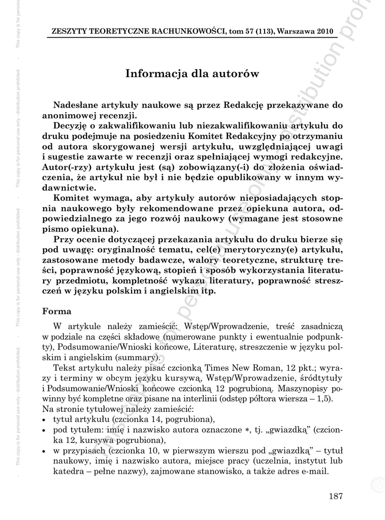 ibu tio np roh This copy is for person - Informacja dla autorów pe rso na lu se on ly - dis tr Nadesłane artykuły naukowe są przez Redakcję przekazywane do anonimowej recenzji. Decyzję o zakwalifikowaniu lub niezakwalifikowaniu artykułu do druku podejmuje na posiedzeniu Komitet Redakcyjny po otrzymaniu od autora skorygowanej wersji artykułu, uwzględniającej uwagi i sugestie zawarte w recenzji oraz spełniającej wymogi redakcyjne. Autor(-rzy) artykułu jest (są) zobowiązany(-i) do złożenia oświadczenia, że artykuł nie był i nie będzie opublikowany w innym wydawnictwie. Komitet wymaga, aby artykuły autorów nieposiadających stopnia naukowego były rekomendowane przez opiekuna autora, odpowiedzialnego za jego rozwój naukowy (wymagane jest stosowne pismo opiekuna). Przy ocenie dotyczącej przekazania artykułu do druku bierze się pod uwagę: oryginalność tematu, cel(e) merytoryczny(e) artykułu, zastosowane metody badawcze, walory teoretyczne, strukturę treści, poprawność językową, stopień i sposób wykorzystania literatury przedmiotu, kompletność wykazu literatury, poprawność streszczeń w języku polskim i angielskim itp. Forma is c op y is for W artykule należy zamieścić: Wstęp/Wprowadzenie, treść zasadniczą w podziale na części składowe (numerowane punkty i ewentualnie podpunkty), Podsumowanie/Wnioski końcowe, Literaturę, streszczenie w języku polskim i angielskim (summary). Tekst artykułu należy pisać czcionką Times New Roman, 12 pkt.; wyrazy i terminy w obcym języku kursywą, Wstęp/Wprowadzenie, śródtytuły i Podsumowanie/Wnioski końcowe czcionką 12 pogrubioną. Maszynopisy powinny być kompletne oraz pisane na interlinii (odstęp półtora wiersza – 1,5). Na stronie tytułowej należy zamieścić: tytuł artykułu (czcionka 14, pogrubiona), pod tytułem: imię i nazwisko autora oznaczone , tj. „gwiazdką” (czcionka 12, kursywa pogrubiona), w przypisach (czcionka 10, w pierwszym wierszu pod „gwiazdką” – tytuł naukowy, imię i nazwisko autora, miejsce pracy (uczelnia, instytut lub katedra – pełne nazwy), zajmowane stanowisko, a także adres e-mail. Th This copy is for personal use only - distribution prohibited. - This copy is for personal use only - distribution prohibited. - This copy is for personal use only - distribution prohibited. - ZESZYTY TEORETYCZNE RACHUNKOWOŚCI, tom 57 (113), Warszawa 2010 187 ibu tio np roh Rysunki, schematy dis tr Rysunki i schematy powinny być wykonane w czarnym kolorze na białym papierze, zaopatrzone w numerację arabską, tytuł (nad rysunkiem lub schematem) oraz źródło (pod rysunkiem lub schematem). Cytowanie literatury se on ly - Literaturę cytowaną należy umieścić w tekście, na końcu zdania, podając w nawiasach nazwisko autora lub autorów, bez imion, a po przecinku rok wydania publikacji, np. (Kowalski, 1988); (Kowalski, Nowak, 1980). Jeżeli w cytowanej literaturze jest podawana stronica lub rozdział, to zapis ma postać: (Kowalski, 1975, s. 25), (Nowak, 1987, rozdz. IV). Gdy w tekście jest przytaczany dokładny cytat, wtedy np.: lu J. Kowalski (1985, s. 38) uważa, że: (...), Zdaniem R. Coopera i R. S. Kaplana (1992a, s. 102), (...). na Cytowanie dokumentów i przepisów w tekście, np. Raport wyników gospodarczych (2005). rso Literatura y is for pe 1. Cytowaną w artykule literaturę należy zamieścić na końcu opracowania, w ujęciu alfabetycznym (czcionka 11, odstęp 1,0 w treści danej pozycji) pod słowem „Literatura”, lecz przed streszczeniami. 2. Po nazwisku autora należy podawać datę wydania pozycji w nawiasach zwykłych, np. (2001), a następnie tytuł pozycji kursywą. Pozycje niemające wskazanego autora i regulacje prawne należy zapisywać kursywą. Tytuły czasopism należy podawać w cudzysłowie. Przykład: op Information for better markets. New reporting models for business (2003), The Institute of Chartered Accountants, London, November. is c Jarugowa A., Malc W., Sawicki K. (1990), Rachunek kosztów, Państwowe Wydawnictwo Ekonomiczne, Warszawa, wyd. trzecie. Karmańska A. (2004), Szkic cech rozwoju rachunku kosztów i ich analizy wpolskiej literaturze w okresie gospodarki centralnie sterowanej, [w:] Polska szkoła rachunkowości, pod red. M. Gmytrasiewicz i A. Karmańskiej, Szkoła Główna Handlowa w Warszawie, Warszawa, s. 253–264. Th This copy is for person This copy is for personal use only - distribution prohibited. This copy is for personal use only - distribution prohibited. - Tabele powinny być zaopatrzone w numerację arabską, tytuł (nad tabelą) oraz źródło (pod tabelą). - This copy is for personal use only - distribution prohibited. Tabele 188 This copy is for person ibu tio np roh Sojak S. (2001), Teoria ograniczeń a ceny transferowe, „Zeszyty Teoretyczne Rachunkowości”, tom 6(62), SKwP, Warszawa, s. 90–105. dis tr 3. W przypadku powoływania się na dwie lub więcej pozycji danego autora albo zespołu tych samych autorów należy rozróżnić pozycje wpisując po dacie wydania pozycji litery a, b, c itd., np.: Cooper R., Kaplan R. S. (1992a), Activity-Based Systems: Measuring the Costs of Resource Usage, ,,Accounting Horizons”, Vol. 6, September, s. 1–13. on ly - Cooper R., Kaplan R. S. (1992b), From ABC to ABM, ,,Management Accounting”, November, s. 54–57. 4. Teksty powoływane w artykule ze stron internetowych wymagają kompletnego opisu, tj. wskazania autora (jeśli jest podany), tytułu i adresu strony, np.: lu se IASB publishes IFRS for SMEs (2009), News Press Release, 09 July 2009, http://www.iasb.org/News/Press+Releases/IASB+publishes+IFRS+for+S MEs.htm na Sveiby K. E. (2001), Methods for Measuring Intangible Assets, http://www. sveiby.com/articles/IntangibleMethods.htm rso Przypisy pe Wszelkie objaśnienia odnoszące się do tekstu artykułów powinny być numerowane cyframi arabskimi, z zachowaniem kolejności dla całego artykułu i zamieszczane pod tekstem właściwej strony. f
