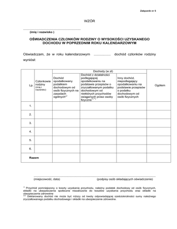Załącznik nr 5 WZÓR .......................................................... (imię i nazwisko ) OŚWIADCZENIA CZŁONKÓW RODZINY O WYSOKOŚCI UZYSKANEGO DOCHODU W POPRZEDNIM ROKU KALENDARZOWYM Oświadczam, że w roku kalendarzowym ................. dochód członków rodziny wyniósł: Dochody (w zł) Dochód z działalności Dochód podlegającej opodatkowaniu na Członkowie opodatkowany podstawie przepisów o podatkiem rodziny Lp. (imię i dochodowym od zryczałtowanym podatku nazwisko) osób fizycznych na dochodowym od zasadach niektórych przychodów ogólnych*) osiąganych przez osoby fizyczne*),**) Inny dochód, niepodlegający opodatkowaniu na podstawie przepisów o podatku dochodowym od osób fizycznych Ogółem 1. 2. 3. 4. 5. 6. Razem ........................................................................................................................... (miejscowość, data) ∗) (podpisy osób składających oświadczenie) Przychód pomniejszony o koszty uzyskania przychodu, należny podatek dochodowy od osób fizycznych, składki na ubezpieczenia społeczne niezaliczone do kosztów uzyskania przychodu oraz składki na ubezpieczenie zdrowotne **) Deklarowany dochód nie może być niższy od kwoty odpowiadającej sześciokrotności sumy należnego zryczałtowanego podatku dochodowego i składki na ubezpieczenie zdrowotne. Pouczenie Oświadczenie o dochodzie członków rodziny podpisują wszyscy członkowie rodziny, którzy uzyskiwali dochód w poprzednim roku kalendarzowym. Oświadczenie obejmuje następujące dochody (art. 3 pkt 1 ustawy z dnia 28 listopada 2003 r. o świadczeniach rodzinnych) po odliczeniu kwot alimentów świadczonych na rzecz innych osób: a) przychody podlegające opodatkowaniu na zasadach ogólnych na podstawie przepisów o podatku dochodowym od osób fizycznych, pomniejszone o koszty uzyskania przychodu, należny podatek dochodowy od osób fizycznych, składki na ubezpieczenia społeczne niezaliczone do kosztów uzyskania przychodu oraz składki na ubezpieczenie zdrowotne, b) deklarowany w oświadczeniu dochód z działalności podlegającej opodatkowaniu na podstawie przepisów o zryczałtowanym podatku dochodowym od niektórych przychodów osiąganych przez osoby fizyczne, pomniejszony o należny zryczałtowany podatek dochodowy i składki na ubezpieczenia społeczne i zdrowotne, c) inne dochody niepodlegające opodatkowaniu na podstawie przepisów o podatku dochodowym od osób fizycznych: renty określone w przepisach o zaopatrzeniu inwalidów wojennych i wojskowych oraz ich rodzin, renty wypłacone osobom represjonowanym i członkom ich rodzin, przyznane na zasadach określonych w przepisach o zaopatrzeniu inwalidów wojennych i wojskowych oraz ich rodzin, świadczenia pieniężne oraz ryczałt energetyczny określone w przepisach o świadczeniu pieniężnym i uprawnieniach przysługujących żołnierzom zastępczej służby wojskowej przymusowo zatrudnianym w kopalniach węgla, kamieniołomach, zakładach rud uranu i batalionach budowlanych, dodatek kombatancki, ryczałt energetyczny i dodatek kompensacyjny określone w przepisach o kombatantach oraz niektórych osobach będących ofiarami represji wojennych i okresu powojennego, świadczenie pieniężne określone w przepisach o świadczeniu pieniężnym przysługującym osobom deportowanym do pracy przymusowej oraz osadzonym w obozach pracy przez III Rzeszę Niemiecką lub Związek Socjalistycznych Republik Radzieckich, emerytury i renty otrzymywane przez osoby, które utraciły wzrok w wyniku działań w latach 1939-1945 lub eksplozji pozostałych po tej wojnie niewypałów i niewybuchów, renty inwalidzkie z tytułu inwalidztwa wojennego, kwoty zaopatrzenia otrzymywane przez ofiary wojny oraz członków ich rodzin, renty wypadkowe osób, których inwalidztwo powstało w związku z przymusowym pobytem na robotach w III Rzeszy Niemieckiej w latach 19391945, otrzymywane z zagranicy, zasiłki chorobowe określone w przepisach o ubezpieczeniu społecznym rolników oraz w przepisach o systemie ubezpieczeń społecznych, środki bezzwrotnej pomocy zagranicznej otrzymywane od rządów państw obcych, organizacji międzynarodowych lub międzynarodowych instytucji finansowych, pochodzące ze środków bezzwrotnej pomocy przyznanych na podstawie jednostronnej deklaracji lub umów zawartych z tymi państwami, organizacjami lub instytucjami przez Radę Ministrów, właściwego ministra lub agencje rządowe, w tym również w przypadkach gdy przekazanie tych środków jest dokonywane za pośrednictwem podmiotu upoważnionego do rozdzielania środków bezzwrotnej pomocy zagranicznej na rzecz podmiotów, którym służyć ma ta pomoc, należności ze stosunku pracy lub z tytułu stypendium osób fizycznych mających miejsce zamieszkania na terytorium Rzeczypospolitej Polskiej, przebywających czasowo za granicą - w wysokości odpowiadającej równowartości diet z tytułu podróży służbowej poza granicami kraju ustalonych dla pracowników zatrudnionych w państwowych lub samorządowych jednostkach sfery budżetowej na podstawie ustawy z dnia 26 czerwca 1974 r. - Kodeks pracy (Dz.U. z 1998 r. Nr 21, poz. 94, z późn. zm.), należności pieniężne wypłacone policjantom, żołnierzom, celnikom i pracownikom jednostek wojskowych i jednostek policyjnych użytych poza granicami państwa w celu udziału w konflikcie zbrojnym lub wzmocnienia sił państwa albo państw sojuszniczych, misji pokojowej, akcji zapobieżenia aktom terroryzmu lub ich skutkom, a także należności pieniężne wypłacone żołnierzom, policjantom, celnikom i pracownikom pełniącym funkcje obserwatorów w misjach pokojowych organizacji międzynarodowych i sił wielonarodowych, należności pieniężne ze stosunku służbowego otrzymywane w czasie służby kandydackiej przez funkcjonariuszy Policji, Państwowej Straży Pożarnej, Straży Granicznej, Biura Ochrony Rządu obliczone za okres, w którym osoby te uzyskały dochód, d