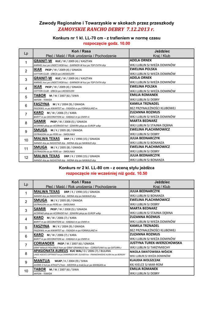 Zawody Regionalne i Towarzyskie w skokach przez przeszkody ZAMOYSKIE RANCHO DEBRY 7.12.2013 r. Konkurs nr 1 kl. LL-70 cm - z trafieniem w normę czasu rozpoczęcie godz. 10.00 Koń / Rasa Płeć / Maść / Rok urodzenia / Pochodzenie Lp Jeździec Kraj / Klub ADELA ORNEK 1 GRANIT-W KARMEL kuc po LINDE'S ROB kuc - GARNIER-W kuc po TOP EVITA drp WKJ LUBLIN SJ WIEŻA DOMINÓW 2 IKAR EWELINA POLSKA COTTON CLUB - IZBICA po LIKEDEELERI WKJ LUBLIN SJ WIEŻA DOMINÓW 3 GRANIT-W ADELA ORNEK KARMEL kuc po LINDE'S ROB kuc - GARNIER-W kuc po TOP EVITA drp WKJ LUBLIN SJ WIEŻA DOMINÓW 4 IKAR EWELINA POLSKA COTTON CLUB - IZBICA po LIKEDEELERI WKJ LUBLIN SJ WIEŻA DOMINÓW 5 TABOR EMILIA ROMANEK 6 FASZYNA PASZKWIL m po KWARTET xo - FASADA m po FORMULARZ m BEZ PRZYNALEŻNOŚCI KLUBOWEJ 7 KARO ZUZANNA ROZMUS BARYT m po DECORATION xo - KABAŁA m po EMIR m WKJ LUBLIN SJ WIEŻA DOMINÓW 8 SAMIR MARTA BEDNARZ ACORINO pksp po ACORADO hol - SZAKIRA pksp po EUROP wlkp WKJ LUBLIN SJ STAJNIA DĘBINA 9 SMUGA EWELINA PLACHIMOWICZ OSTRAGON oo po PERS oo - SMOLINKA WKJ LUBLIN SJ DEBRY 10 MALWA TEXAS JULIA BEDNARCZYK NANDO drp po NIGHSTAR drp - MONA drp po NAWAJO drp WKJ LUBLIN SJ BONANZA 11 SMUGA EWELINA PLACHIMOWICZ OSTRAGON oo po PERS oo - SMOLINKA WKJ LUBLIN SJ DEBRY 12 MALWA TEXAS JULIA BEDNARCZYK KUC / W / 2009 (4) / KASZTAN PKSP / W / 2009 (4) / GNIADA KUC / W / 2009 (4) / KASZTAN PKSP / W / 2009 (4) / GNIADA M / W / 2007 (6) / SIWA WKJ LUBLIN SJ DEBRY WIFON - TEMIDA M / K / 2004 (9) / GNIADA M / W / 2006 (7) / KARA PKSP / W / 2008 (5) / GNIADA M / K / 2005 (8) / GNIADA DRP / K / 1998 (15) / GNIADA M / K / 2005 (8) / GNIADA DRP / K / 1998 (15) / GNIADA NANDO drp po NIGHSTAR drp - MONA drp po NAWAJO drp KAMILA TRZNADEL WKJ LUBLIN SJ BONANZA Konkurs nr 2 kl. LL-80 cm - z oceną stylu jeźdźca rozpoczęcie nie wcześniej niż godz. 10.50 Koń / Rasa Płeć / Maść / Rok urodzenia / Pochodzenie Lp Jeździec Kraj / Klub JULIA BEDNARCZYK 1 MALWA TEXAS NANDO drp po NIGHSTAR drp - MONA drp po NAWAJO drp WKJ LUBLIN SJ BONANZA 2 SMUGA EWELINA PLACHIMOWICZ OSTRAGON oo po PERS oo - SMOLINKA WKJ LUBLIN SJ DEBRY 3 SAMIR MARTA BEDNARZ ACORINO pksp po ACORADO hol - SZAKIRA pksp po EUROP wlkp WKJ LUBLIN SJ STAJNIA DĘBINA 4 KARO ZUZANNA ROZMUS BARYT m po DECORATION xo - KABAŁA m po EMIR m WKJ LUBLIN SJ WIEŻA DOMINÓW 5 FASZYNA KAMILA TRZNADEL PASZKWIL m po KWARTET xo - FASADA m po FORMULARZ m BEZ PRZYNALEŻNOŚCI KLUBOWEJ 6 KARO ZUZANNA ROZMUS BARYT m po DECORATION xo - KABAŁA m po EMIR m WKJ LUBLIN SJ WIEŻA DOMINÓW 7 CORIANDER JUSTYNA TUREK-WIERZCHOWSKA 8 DRP / K / 1998 (15) / GNIADA M / K / 2005 (8) / GNIADA PKSP / W / 2008 (5) / GNIADA M / W / 2006 (7) / KARA M / K / 2004 (9) / GNIADA M / W / 2006 (7) / KARA PKSP / W / 2007 (6) / GNIADA GRAF MAJUS POLONUS han po GRAF GRANNUS han - CORSATUNA tsz po SATURN z APASJONATA AUREUS KUC WAL/ O / 2006 (7) / BUŁANA WKJ LUBLIN SJ TARZYMIECHY NIKOLA SWATOWSKA-WÓJCIK LINDE HOEVE'S OPTIMIST kw po SHAMROCK MR. OLIVIER kw - FRANKENHOEHS AURA kw po BONSAY kw WKJ LUBLIN SJ WIEŻA DOMINÓW 9 MANTUA AVERO 2 hol po ATHLET Z han - MEDYKA p.trak/w.pr po MANGAN xx KLAUDIA WOLSZCZAK KKJ KIELCE SJ MAR-ROM 10 TABOR EMILIA ROMANEK WLKP / K / 2004 (9) / SIWA M / W / 2007 (6) / SIWA WIFON - TEMIDA WKJ LUBLIN SJ DEBRY Konkurs nr 3 kl. LL-90 cm - z oceną stylu jeźdźca rozpoczęcie nie wcześniej niż godz. 11.30 Koń / Rasa Płeć / Maść / Rok urodzenia / Pochodzenie Lp Jeździec Kraj / Klub EMILIA ROMANEK 1 TABOR 2 MANTUA 3 APASJONATA AUREUS KUC WAL/ O / 2006 (7) / BUŁANA WKJ LUBLIN SJ DEBRY KLAUDIA WOLSZCZAK KKJ KIELCE SJ MAR-ROM NIKOLA SWATOWSKA-WÓJCIK LINDE HOEVE'S OPTIMIST kw po SHAMROCK MR. OLIVIER kw - FRANKENHOEHS AURA kw po BONSAY kw WKJ LUBLIN SJ WIEŻA DOMINÓW 4 CORIANDER JUSTYNA TUREK-WIERZCHOWSKA GRAF MAJUS POLONUS han po GRAF GRANNUS han - CORSATUNA tsz po SATURN z WKJ LUBLIN SJ TARZYMIECHY 5 LAPIS ALEKSANDRA CZERSKA LAGARO hol po LANDGRAF I hol - RAMIRA saks po RAKETT baw BEZ PRZYNALEŻNOŚCI KLUBOWEJ 6 SANGRIA WERONIKA CIEŚLAK ACORINO hol po ACORADO hol - SALWA m po PASZKWIL m WKJ LUBLIN SJ BONANZA 7 LAPIS ALEKSANDRA CZERSKA LAGARO hol po LANDGRAF I hol - RAMIRA saks po RAKETT baw BEZ PRZYNALEŻNOŚCI KLUBOWEJ 8 SANGRIA WERONIKA CIEŚLAK ACORINO hol po ACORADO hol - SALWA m po PASZKWIL m WKJ LUBLIN SJ BONANZA 9 RASCINA MARIA ZDANOWICZ RASCIN han po RAMIRO hol - HAUPTSTUTBUCH han po WANDERBURSCH II han WKJ LUBLIN SJ WIEŻA DOMINÓW 10 EMER ANDRZEJ MACIASZCZYK GREY m po CYNIK xx - EMBERA m po BERLIN BEJ m WKJ LUBLIN SJ DEBRY 11 RASCINA MARIA ZDANOWICZ RASCIN han po RAMIRO hol - HAUPTSTUTBUCH han po WANDERBURSCH II han WKJ LUBLIN SJ WIEŻA DOMINÓW 12 JUANA KALINA TARACHA 13 DOMINIKA AVERO 2 hol po ATHLET Z han - MEDYKA p.trak/w.pr po MANGAN xx WKJ LUBLIN MARIA CZUBAK KKJ KIELCE 14 TURKUS KATARZYNA CZECZOT M / W / 2007 (6) / SIWA WIFON - TEMIDA WLKP / K / 2004 (9) / SIWA AVERO 2 hol po ATHLET Z han - MEDYKA p.trak/w.pr po MANGAN xx PKSP / W / 2007 (6) / GNIADA SAKS / O / 2000 (13) / GNIADA PKSP / K / 2006 (7) / GNIADA SAKS / O / 2000 (13) / GNIADA PKSP / K / 2006 (7) / GNIADA HAN / K / 2006 (7) / KASZTAN M / W / 2008 (5) / GNIADA HAN / K / 2006 (7) / KASZTAN PKSP / K / 2004 (9) / GNIADA EVER FOR PLEASURE han po ESPRI han - JURTA kwpn po FIRSTGRAFF kwpn PKSP / K / 1999 (14) / SIWA M / W / 2005 (8) / SIWA OSTRAGON oo po PERS oo - TABULCZA m po KARDYNAŁ m WKJ LUBLIN SJ DEBRY Konkurs nr 4 kl. L - z oceną stylu jeźdźca rozpoczęcie nie wcześniej niż godz. 12.30 Koń / Rasa Płeć / Maść / Rok urodzenia / Pochodzenie Lp 1 TURKUS M / W / 2005 (8) / SIWA Jeździec Kraj / Klub KATARZYNA CZECZOT OSTRAGON oo po PERS oo - TABULCZA m po KARDYNAŁ m WKJ LUBLIN SJ DEBRY 2 DOMINIKA AVERO 2 hol po ATHLET Z han - MEDYKA p.trak/w.pr po MANGAN xx MARIA CZUBAK KKJ KIELCE 3 JUANA KALINA TARACHA EVER FOR PLEASURE han po ESPRI han - JURTA kwpn po FIRSTGRAFF kwpn WKJ LUBLIN 4 EMER ANDRZEJ MACIASZCZYK GREY m po CYNIK xx - EMBERA m po BERLIN BEJ m WKJ LUBLIN SJ DEBRY 5 RASCINA MARIA ZDANOWICZ PK