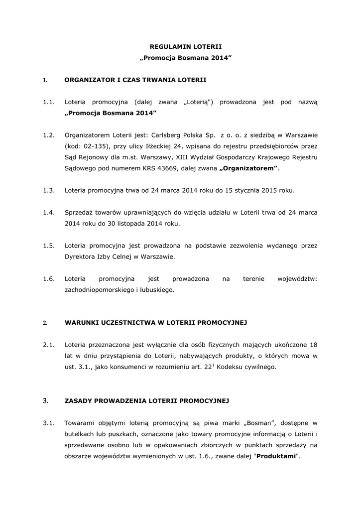 REGULAMIN LOTERII „Promocja Bosmana 2014” 1. ORGANIZATOR I CZAS TRWANIA LOTERII 1.1. Loteria promocyjna (dalej zwana „Loterią") prowadzona jest pod nazwą „Promocja Bosmana 2014” 1.2. Organizatorem Loterii jest: Carlsberg Polska Sp. z o. o. z siedzibą w Warszawie (kod: 02-135), przy ulicy Iłżeckiej 24, wpisana do rejestru przedsiębiorców przez Sąd Rejonowy dla m.st. Warszawy, XIII Wydział Gospodarczy Krajowego Rejestru Sądowego pod numerem KRS 43669, dalej zwana „Organizatorem”. 1.3. Loteria promocyjna trwa od 24 marca 2014 roku do 15 stycznia 2015 roku. 1.4. Sprzedaż towarów uprawniających do wzięcia udziału w Loterii trwa od 24 marca 2014 roku do 30 listopada 2014 roku. 1.5. Loteria promocyjna jest prowadzona na podstawie zezwolenia wydanego przez Dyrektora Izby Celnej w Warszawie. 1.6. Loteria promocyjna jest prowadzona na terenie województw: zachodniopomorskiego i lubuskiego. 2. WARUNKI UCZESTNICTWA W LOTERII PROMOCYJNEJ 2.1. Loteria przeznaczona jest wyłącznie dla osób fizycznych mających ukończone 18 lat w dniu przystąpienia do Loterii, nabywających produkty, o których mowa w ust. 3.1., jako konsumenci w rozumieniu art. 221 Kodeksu cywilnego. 3. ZASADY PROWADZENIA LOTERII PROMOCYJNEJ 3.1. Towarami objętymi loterią promocyjną są piwa marki „Bosman”, dostępne w butelkach lub puszkach, oznaczone jako towary promocyjne informacją o Loterii i sprzedawane osobno lub w opakowaniach zbiorczych w punktach sprzedaży na obszarze województw wymienionych w ust. 1.6., zwane dalej "Produktami". 3.2. W celu wzięcia udziału w Loterii konsument powinien w terminie, o którym mowa w ust. 1.4., zakupić co najmniej jeden Produkt. Uczestnik bierze udział w Loterii tyle razy, ile Produktów zakupi. 3.3. Wewnętrzna część kapsli od butelek oraz wewnętrzna część kluczyków od puszek niektórych Produktów jest oznaczona napisem „Bosman 2014”, wskazującym na wygranie nagrody, w sposób uniemożliwiający sprawdzenie bez naruszenia opakowania Produktu lub przed otwarciem opakowania Produktu, czy napis znajduje się pod kapslem lub kluczykiem. Nabycie przez uczestnika Loterii Produktu z kapslem lub kluczykiem oznaczonym zgodnie z niniejszym ustępem jest równoznaczne z wygraniem nagrody 3.4. Wewnętrzna część kapsli od butelek Produktów nieuprawniających do wygrania nagrody oznaczona jest napisem „Graj dalej”, w sposób uniemożliwiający sprawdzenie bez naruszenia opakowania Produktu lub przed otwarciem opakowania Produktu, czy napis znajduje się pod kapslem. Nabycie przez uczestnika Loterii butelki z kapslem oznaczonym zgodnie z niniejszym ustępem oznacza niewygranie nagrody. 3.5. Wewnętrzna wygrania część kluczyków nagrody pozostaje sprawdzenie bez naruszenia od puszek Produktów nieoznaczona, opakowania w nieuprawniających sposób Produktu lub do uniemożliwiający przed otwarciem opakowania Produktu, czy pod kluczykiem nie ma żadnego oznaczenia. Nabycie przez uczestnika Loterii puszki z kluczykiem nieoznaczonym zgodnie z niniejszym ustępem oznacza niewygranie nagrody. 3.6. Zwycięzcy nagród powinni zachować oryginalny kluczyk lub kapsel, który należy przekazać przed otrzymaniem nagrody, zgodnie z ust. 5.1. 4. NAGRODY 4.1. Pulę nagród w Loterii stanowi 700.000 puszek piwa „Bosman Full” o pojemności 0,5 l, o wartości 2,84 zł brutto każda. 4.2. Zwycięzcom Loterii nie przysługuje prawo do zastrzeżenia szczególnych właściwości nagrody, ani otrzymania ekwiwalentu pieniężnego lub rzeczowego. 4.3. Łączna wartość nagród w loterii promocyjnej wynosi 1. 988.000,- zł (słownie: jeden milion dziewięćset osiemdziesiąt osiem tysięcy złotych i zero groszy) brutto. 5. WYDANIE NAGRÓD 5.1. W celu otrzymania nagrody zwycięzca powinien w okresie od 24 marca 2014 roku do 30 listopada 2014 roku zgłosić się wraz z oryginalnym kluczykiem lub kapslem z napisem oznaczającym nagrodę w jednym ze specjalnie oznaczonych punktów sprzedaży detalicznej prowadzących sprzedaż Produktów. Po weryfikacji oryginalności kluczyka lub kapsla i za jego zwrotem zwycięzca otrzyma nagrodę. Niedopełnienie przez zwycięzcę warunków, o jakich mowa w niniejszym ustępie, skutkuje utratą prawa do nagrody. 5.2. Lista specjalnie oznaczonych punktów sprzedaży, o jakich mowa w ust. 5.1. dostępna jest na stronie internetowej www.bosman.pl. 6. OGŁOSZENIE WYNIKÓW LOTERII 6.1. W terminie do dnia 20 lutego 2015 r. na stronie internetowej www.bosman.pl Organizator ogłasza zbiorcze dane o liczbie wygranych nagród. 7. PRAWIDŁOWOŚĆ PRZEBIEGU AKCJI 7.1. Nadzór nad prawidłowością urządzenia Loterii sprawuje powołana przez Organizatora trzyosobowa Komisja Nadzoru. 7.2. W skład Komisji Nadzoru wchodzą: osoba legitymująca się świadectwem zawodowym wydanym przez Ministra Finansów jako przewodniczący komisji oraz członek komisji i sekretarz. 7.3. Szczegółowe zadania Komisji Nadzoru określa regulamin tej komisji wydany przez Organizatora. 8. POSTĘPOWANIE REKLAMACYJNE I PRZEDAWNIENIE ROSZCZEŃ 8.1. Wszelkie reklamacje dotyczące sposobu przeprowadzenia loterii promocyjnej Uczestnicy winni zgłaszać na piśmie w terminie do dnia 15 grudnia 2014 roku. O zachowaniu terminu do wniesienia reklamacji decyduje data stempla pocztowego, z tym, że Organizator nie uwzględnia reklamacji, które dotarły później niż 31 grudnia 2014 roku. 8.2. Zgodnie z treścią rozporządzenia Ministra Finansów z dnia 1 lipca 2010 roku w sprawie trybu zgłaszania roszczeń uczestników gier hazardowych (Dz U z 2010 roku nr 118 poz. 793) pisemna reklamacja powinna zawierać: imię, nazwisko i dokładny adres uczestnika, datę i miejsce zdarzenia, którego dotyczy roszczenie uczestnika, jak również wskazanie loterii promocyjnej „Promocja Bosmana 2014” oraz treść żądania. 8.3. Reklamacje powinny być zgłaszane na adres Organizatora (Carlsberg Polska Sp. z o.o., ul. Iłżecka 24, 02-135 Warszawa) z dopiskiem na kopercie „Prom