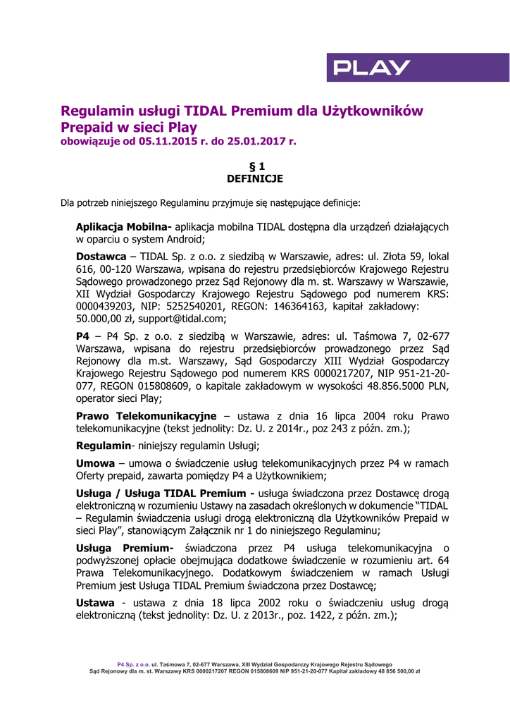 Regulamin usługi TIDAL Premium dla Użytkowników Prepaid w sieci Play obowiązuje od 05.11.2015 r. do 25.01.2017 r. §1 DEFINICJE Dla potrzeb niniejszego Regulaminu przyjmuje się następujące definicje: Aplikacja Mobilna- aplikacja mobilna TIDAL dostępna dla urządzeń działających w oparciu o system Android; Dostawca – TIDAL Sp. z o.o. z siedzibą w Warszawie, adres: ul. Złota 59, lokal 616, 00-120 Warszawa, wpisana do rejestru przedsiębiorców Krajowego Rejestru Sądowego prowadzonego przez Sąd Rejonowy dla m. st. Warszawy w Warszawie, XII Wydział Gospodarczy Krajowego Rejestru Sądowego pod numerem KRS: 0000439203, NIP: 5252540201, REGON: 146364163, kapitał zakładowy: 50.000,00 zł, [email protected]; P4 – P4 Sp. z o.o. z siedzibą w Warszawie, adres: ul. Taśmowa 7, 02-677 Warszawa, wpisana do rejestru przedsiębiorców prowadzonego przez Sąd Rejonowy dla m.st. Warszawy, Sąd Gospodarczy XIII Wydział Gospodarczy Krajowego Rejestru Sądowego pod numerem KRS 0000217207, NIP 951-21-20077, REGON 015808609, o kapitale zakładowym w wysokości 48.856.5000 PLN, operator sieci Play; Prawo Telekomunikacyjne – ustawa z dnia 16 lipca 2004 roku Prawo telekomunikacyjne (tekst jednolity: Dz. U. z 2014r., poz 243 z późn. zm.); Regulamin- niniejszy regulamin Usługi; Umowa – umowa o świadczenie usług telekomunikacyjnych przez P4 w ramach Oferty prepaid, zawarta pomiędzy P4 a Użytkownikiem; Usługa / Usługa TIDAL Premium - usługa świadczona przez Dostawcę drogą elektroniczną w rozumieniu Ustawy na zasadach określonych w dokumencie “TIDAL – Regulamin świadczenia usługi drogą elektroniczną dla Użytkowników Prepaid w sieci Play”, stanowiącym Załącznik nr 1 do niniejszego Regulaminu; Usługa Premium- świadczona przez P4 usługa telekomunikacyjna o podwyższonej opłacie obejmująca dodatkowe świadczenie w rozumieniu art. 64 Prawa Telekomunikacyjnego. Dodatkowym świadczeniem w ramach Usługi Premium jest Usługa TIDAL Premium świadczona przez Dostawcę; Ustawa - ustawa z dnia 18 lipca 2002 roku o świadczeniu usług drogą elektroniczną (tekst jednolity: Dz. U. z 2013r., poz. 1422, z późn. zm.); P4 Sp. z o.o. ul. Taśmowa 7, 02-677 Warszawa, XIII Wydział Gospodarczy Krajowego Rejestru Sądowego Sąd Rejonowy dla m. st. Warszawy KRS 0000217207 REGON 015808609 NIP 951-21-20-077 Kapitał zakładowy 48 856 500,00 zł Użytkownik– Użytkownik w rozumieniu Regulaminu Świadczenia Usług Telekomunikacyjnych przez P4 Sp. z o.o. dla Użytkowników będący stroną Umowy zawartej z P4 w ramach Oferty prepaid. §2 POSTANOWIENIA OGÓLNE 1. Niniejszy Regulamin określa: a. zasady świadczenia przez P4 na rzecz Użytkowników Usługi Premium umożliwiającej dostęp do Usługi TIDAL Premium oraz b. zasady świadczenia przez Dostawcę na rzecz Użytkowników Usługi TIDAL Premium stanowiącej dodatkowe świadczenie w ramach Usługi Premium, o której mowa powyżej. 2. Usługa TIDAL Premium jest dostępna wyłącznie dla Użytkowników będących stroną Umowy zawartej z P4 w ramach Oferty prepaid wskazanej w pkt. 3, którzy skorzystali z Usługi Premium świadczonej przez P4, o której mowa w pkt. 1 a) powyżej. 3. Usługa TIDAL Premium jest dostępna dla Użytkowników korzystających z Oferty: Play na Kartę Rok Ważności Konta; Play na Kartę, Formuła Mini MAX na Kartę; Play na Kartę Lubię to!; Formuła Play na Kartę; Play Fresh Darmowe rozmowy i SMS-y w Play; Play Fresh Darmowe SMS-y do wszystkich sieci; Oferta Promocyjna Lubię to!; RedBull Mobile na Kartę II, RedBull Mobile Energy na Kartę; Play Internet na Kartę lub Play Online 4GLTE na Kartę. 4. W celu uzyskania dostępu do Usługi TIDAL Premium niezbędne jest posiadanie urządzenia z systemem Android z zainstalowaną Aplikacją Mobilną. 5. Usługa TIDAL Premium oferowana przez Dostawcę obejmuje nieograniczony dostęp do serwisu TIDAL polegający na odtwarzaniu muzyki, pobieraniu utworów, grafik, okładek płyt, pobieraniu, zapisywaniu i modyfikacji list utworów (tzw. playlisty). Szczegóły działania Usługi TIDAL Premium opisane są w Załączniku nr 1 do niniejszego Regulaminu („TIDAL – Regulamin świadczenia usługi drogą elektroniczną dla Użytkowników Prepaid w sieci Play”). §3 AKTYWACJA USŁUGI 1. W celu korzystania z Usługi TIDAL Premium za pośrednictwem telefonu komórkowego z systemem Android konieczne jest zainstalowanie Aplikacji Mobilnej dostępnej w odpowiednich platformach udostępniających aplikacje (Google Play i podobne). Pobranie Aplikacji Mobilnej związane jest z korzystaniem z transmisji danych. 2. Usługę TIDAL Premium można aktywować poprzez skorzystanie z Usługi Premium tj. przez wysłanie w ramach Aplikacji Mobilnej komunikatu USSD za pośrednictwem P4 Sp. z o.o. ul. Taśmowa 7, 02-677 Warszawa, XIII Wydział Gospodarczy Krajowego Rejestru Sądowego Sąd Rejonowy dla m. st. Warszawy KRS 0000217207 REGON 015808609 NIP 951-21-20-077 Kapitał zakładowy 48 856 500,00 zł Sieci Telekomunikacyjnej P4. W tym celu należy wykonać następujące czynności: a. zalogować się do Aplikacji Mobilnej i b. zatwierdzić na klawiaturze telefonu komunikat USSD wciskając „1”. 3. Aktywacja Usługi TIDAL Premium nastąpi w ciągu 15 minut od wysłania komunikatu USSD, z zastrzeżeniem ust. 4 poniżej. 4. Warunkiem aktywacji Usługi jest posiadanie na koncie w dniu aktywacji kwoty w wysokości opłaty, o której mowa w § 4 pkt. 1 niniejszego Regulaminu oraz utrzymywanie Okresu ważności połączeń wychodzących. §4 OPŁATY 1. Opłata za Usługę Premium umożliwiającą dostęp do Usługi TIDAL Premium wynosi 1 zł brutto. 2. Opłata pobierana jest jednorazowo z Pakietu Złotówek Użytkownika w chwili skorzystania z Usługi Premium zgodnie z § 3 pkt. 2 niniejszego Regulaminu. 3. W ramach ww. opłaty Użytkownik otrzymuje dostęp do Usługi TIDAL Premium do godziny 23:59 w dniu, w którym nastąpiła aktywacja. 4. Po godzinie 23:59 w dniu w którym nast
