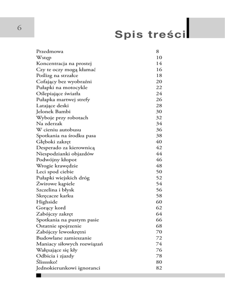 Spis treści Przedmowa Wstęp Koncentracja na prostej Czy te oczy mogą kłamać Poślizg na strzałce Cofający bez wyobraźni Pułapki na motocykle Oślepiające światła Pułapka martwej strefy Latające deski Jelonek Bambi Wyboje przy robotach Na zderzak W cieniu autobusu Spotkania na środku pasa Głęboki zakręt Desperado za kierownicą Niespodzianki objazdów Podwójny kłopot Wrogie krawędzie Leci spod ciebie Pułapki wiejskich dróg Żwirowe kąpiele Szczelina i błysk Skręcacze karku Highside Gorący kord Zabójczy zakręt Spotkania na pustym pasie Ostatnie spojrzenie Zabójczy lewoskrętni Budowlane zamieszanie Maniacy siłowych rozwiązań Wałęsające się kły Odbicia i zjazdy Ślissssko! Jednokierunkowi ignoranci 8 10 14 16 18 20 22 24 26 28 30 32 34 36 38 40 42 44 46 48 50 52 54 56 58 60 62 64 66 68 70 72 74 76 78 80 82 Na skróty przez parking Wyprzedzanie wysokiego ryzyka Dreszczyk na pasach Zła ocena Słodki ciężar na kanapie Tory pod kątem Zaskoczenie z prawej Mokra robota Rekiny drogowe Stop znaczy stop Wymuszacze Wiosenne piaski Repelent na rekiny Wyboiste kłopoty Boczne uderzenia na bocznych drogach Nieporozumienia Przeczekać ślizgawkę Amatorzy martwej strefy Pod górkę Spalona guma Szaleństwa sygnalizacji Trauma na ogonie Lepik nie lepi Pan niezdecydowany Kiepskie wyprzedzanie Obce ciało na drodze Bieżnik terrorysta Przycierki Kłopoty z przyczepnością Ściancze zakrętów Podstępne tory Mokre łby Białe krawężniki Chybotanie Ruchy kontra podmuchy Jazda na krawędzi Drewniany strach Uwaga, roboty drogowe 84 86 88 90 92 94 96 98 100 102 104 106 108 110 112 114 116 118 120 122 124 126 128 130 132 134 136 138 140 142 144 146 148 150 152 154 156 158