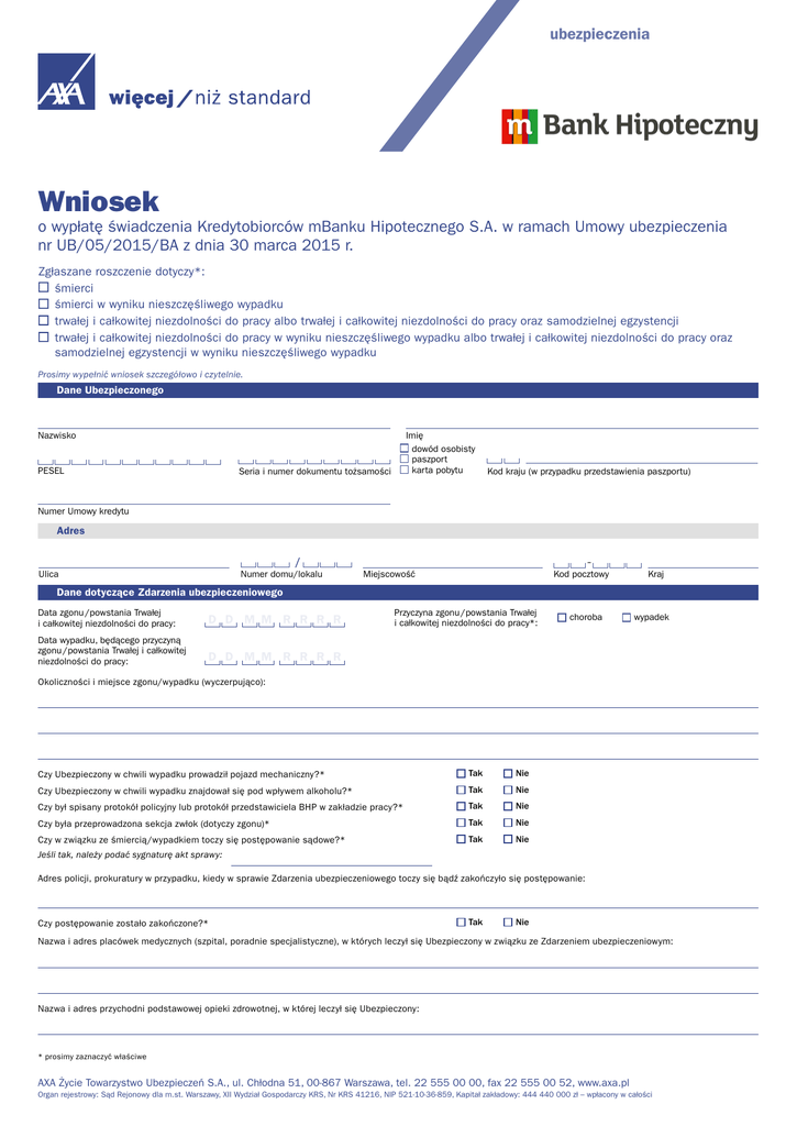 ubezpieczenia Wniosek o wypłatę świadczenia Kredytobiorców mBanku Hipotecznego S.A. w ramach Umowy ubezpieczenia nr UB/05/2015/BA z dnia 30 marca 2015 r. Zgłaszane roszczenie dotyczy*: śmierci śmierci w wyniku nieszczęśliwego wypadku trwałej i całkowitej niezdolności do pracy albo trwałej i całkowitej niezdolności do pracy oraz samodzielnej egzystencji trwałej i całkowitej niezdolności do pracy w wyniku nieszczęśliwego wypadku albo trwałej i całkowitej niezdolności do pracy oraz samodzielnej egzystencji w wyniku nieszczęśliwego wypadku Prosimy wypełnić wniosek szczegółowo i czytelnie. Dane Ubezpieczonego Nazwisko PESEL Seria i numer dokumentu tożsamości Imię dowód osobisty paszport karta pobytu Kod kraju (w przypadku przedstawienia paszportu) Numer Umowy kredytu Adres Ulica Numer domu/lokalu Miejscowość Kod pocztowy Kraj Dane dotyczące Zdarzenia ubezpieczeniowego Data zgonu /powstania Trwałej i całkowitej niezdolności do pracy: D D M M R R R R Data wypadku, będącego przyczyną zgonu /powstania Trwałej i całkowitej niezdolności do pracy: D D M M R R R R Przyczyna zgonu /powstania Trwałej i całkowitej niezdolności do pracy*: choroba wypadek Okoliczności i miejsce zgonu/wypadku (wyczerpująco): Czy Ubezpieczony w chwili wypadku prowadził pojazd mechaniczny?* Tak Nie Czy Ubezpieczony w chwili wypadku znajdował się pod wpływem alkoholu?* Tak Nie Czy był spisany protokół policyjny lub protokół przedstawiciela BHP w zakładzie pracy?* Tak Nie Czy była przeprowadzona sekcja zwłok (dotyczy zgonu)* Tak Nie Czy w związku ze śmiercią/wypadkiem toczy się postępowanie sądowe?* Tak Nie Jeśli tak, należy podać sygnaturę akt sprawy: Adres policji, prokuratury w przypadku, kiedy w sprawie Zdarzenia ubezpieczeniowego toczy się bądź zakończyło się postępowanie: Czy postępowanie zostało zakończone?* Tak Nie Nazwa i adres placówek medycznych (szpital, poradnie specjalistyczne), w których leczył się Ubezpieczony w związku ze Zdarzeniem ubezpieczeniowym: Nazwa i adres przychodni podstawowej opieki zdrowotnej, w której leczył się Ubezpieczony: * prosimy zaznaczyć właściwe AXA Życie Towarzystwo Ubezpieczeń S.A., ul. Chłodna 51, 00-867 Warszawa, tel. 22 555 00 00, fax 22 555 00 52, www.axa.pl Organ rejestrowy: Sąd Rejonowy dla m.st. Warszawy, XII Wydział Gospodarczy KRS, Nr KRS 41216, NIP 521-10-36-859, Kapitał zakładowy: 444 440 000 zł – wpłacony w całości Zgłaszający roszczenie Ubezpieczony inna osoba (w przypadku wyboru tej opcji prosimy wypełnić poniższe pola) Nazwisko +48 Imię +48 Telefon komórkowy Telefon stacjonarny E-mail Adres korespondencyjny - Kod pocztowy Ulica Miejscowość Numer domu/lokalu Wypłata świadczenia do wysokości zobowiązania z tytułu Umowy kredytu uprawnionym do otrzymania świadczenia jest mBank Hipoteczny S.A., al. Armii Ludowej 26, Warszawa wypłata świadczenia nastąpi na rachunek wskazany przez mBank Hipoteczny S.A. Dokumenty wymagane do zgłoszenia roszczenia Prosimy przekazać do Towarzystwa oryginały lub kopie następujących dokumentów poświadczone za zgodność z oryginałem przez odpowiednio: Ubezpieczającego, notariusza, pracownika USC, pracownika Ubezpieczyciela bądź – w przypadku dokumentacji medycznej – pracownika danej placówki medycznej. Prosimy zaznaczyć krzyżykiem załączane do wniosku kopie dokumentów. ŚMIERĆ, ŚMIERĆ W WYNIKU NIESZCZĘŚLIWEGO WYPADKU Do zgłoszenia dołączono: odpis skrócony aktu zgonu Ubezpieczonego kopię karty statystycznej do karty zgonu lub dokumentacji medycznej potwierdzającej przyczynę śmierci kopię opisu świadczenia pierwszej pomocy lub pomocy doraźnej (pogotowie ratunkowe, Szpital itp.) kopię dokumentacji medycznej z przychodni, Szpitala lub adresy placówek medycznych, w których Ubezpieczony był zarejestrowany i leczony w związku z zaistniałym Zdarzeniem ubezpieczeniowym, będącym przedmiotem zgłoszonego roszczenia kopię protokołu opisującego okoliczności Zdarzenia ubezpieczeniowego (protokołu BHP, protokołu policyjnego, notatki służbowej w przypadku kolizji drogowej, karty wypadku), dokumentacji postępowania karnego, jeżeli takie zostało wszczęte (np. postanowienia prokuratury, wyroku sądu) kopię dokumentów potwierdzających roczne dochody wszystkich Ubezpieczonych objętych ochroną ubezpieczeniową w związku z jedną Umową kredytu za rok poprzedzający rok wystąpienia Zdarzenia ubezpieczeniowego kopię dowodu osobistego lub innego dokumentu tożsamości każdego z Uprawnionych do otrzymania świadczenia (nie dotyczy Ubezpieczającego) kopię odpisu prawomocnego postanowienia sądu o stwierdzeniu nabycia spadku lub kopię zarejestrowanego notarialnego poświadczenia dziedziczenia – w przypadku gdy Uprawniony jest spadkobiercą Ubezpieczonego TRWAŁA I CAŁKOWITA NIEZDOLNOŚĆ DO PRACY, TRWAŁA I CAŁKOWITA NIEZDOLNOŚĆ DO PRACY ORAZ SAMODZIELNEJ EGZYSTENCJI (dotyczy również zdarzeń spowodowanych nieszczęśliwym wypadkiem) Do zgłoszenia dołączono: kopię orzeczenia komisji lekarskiej ZUS lub innego organu rentowego o Trwałej i całkowitej niezdolności do pracy kopię dokumentacji medycznej dotyczącej zdarzenia będącego przyczyną Trwałej i całkowitej niezdolności do pracy poświadczoną za zgodność z oryginałem (np. kopia wniosku medycznego będącego podstawą do skierowania Ubezpieczonego na komisję ZUS); w przypadku przedłożenia innych dokumentów w postaci kopii kart informacyjnych z leczenia szpitalnego, wyników badań histopatologicznych, dokumentacji z porad ambulatoryjnych, opisu świadczenia pierwszej pomocy lub pomocy doraźnej (pogotowie ratunkowe, Szpital itp.) konieczne jest wskazanie adresu i pełnej nazwy placówek medycznych, w których odbywało się leczenie, protokół opisujący okoliczności Zdarzenia ubezpieczeniowego (protokół BHP, protokół policyjny, notatka służbowa w przypadku kolizji drogowej, karta wypadku), dokumenta