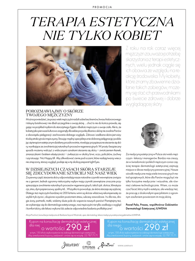 promoc ja Terapia estetyczna nie tylko kobiet Z roku na rok coraz więcej mężczyzn zauważa potrzebę skorzystania z terapii estetycznych, wielu jednak ciągle się ich obawia ze względu na reakcję środowiska. My kobiety, które znamy zbawienne działanie takich zabiegów, możemy się stać ich przewodnikami po świecie zdrowej i dobrze wyglądającej skóry. Porozmawiajmy o skórze Twojego mężczyzny Można powiedzieć, że przez wieki mężczyźni radzili sobie bez kremów, kwasu hialuronowego i toksyny botulinowej i nie dbali szczególnie o swoją skórę … choć to nie do końca prawda, sięgając na przykład myślami do starożytnego Egiptu i dbałości mężczyzn o swoje ciała. Ale to, że kobiety jako pierwsze kulturowo zagarnęły dla siebie przywilej dbania o skórę nie zwalnia Panów z obowiązku pielęgnacji i zachowania dobrego wyglądu. Zdrowa i zadbana skóra jest wizytówką atrakcyjności mężczyzny. Stosując mądrą i specjalistycznie dobraną pielęgnację i poddając się terapiom estetycznym działamy prozdrowotnie, niwelując przyspieszone starzenie się skóry, wynikające ze zwolnienia jej naturalnych procesów regeneracyjnych. W prosty i bezpieczny sposób możemy walczyć z widocznymi oznakami starzenia się skóry – zwiotczeniem tkanek, zmarszczkami i brakiem elastyczności – zwłaszcza w okolicy brwi, oczu, policzków, żuchwy i szyi stosując Nici Happy Lift. Aby zlikwidować cienie pod oczami, które nadają twarzy wiecznie zmęczony, starszy wygląd, podaje się w tę okolicę preparat Light Eyes. W dzisiejszych czasach skóra starzeje się zdecydowanie szybciej niż nasz wiek Za pewną część starzenia skóry odpowiadają nasze naturalne czynniki wewnętrzne związane z genami. Jednak ogromny niekorzystny wpływ mają czynniki zewnętrzne znacznie przyspieszające zwolnienie naturalnych procesów regeneracyjnych, takich jak: słońce, klimatyzacja, stres, dym papierosowy, spaliny itd… Wszystko to powoduje, że skóra starzeje się szybciej. Dlatego też mężczyźni bardziej niż 200 lat temu winni są skórze właściwą rekompensatę za szybki tryb życia i, okupione wysokim poziomem stresu, sukcesy zawodowe. I tu dla nas, drogie żony, partnerki, matki, widzimy duże pole do wsparcia naszych panów! Pamiętajmy też, że wybierając się do dermatologa estetycznego, nasi mężczyźni nie tylko zadbają o wygląd i komfort skóry, ale lekarz wykona lub zalecie odpowiednie badania profilaktyczne! Za medycyną estetyczną w Polsce stoi wielu mężczyzn - lekarzy i managerów. Bardzo nas cieszy, że w świadomości polskich mężczyzn coraz częściej terapie dermatologii estetycznej zajmują miejsce w sferze medycyny prewencyjnej. Nasze ośrodki medyczne mają wiele innowacyjnych metod sprzętowych, które dla Panów mogą być nie tylko korzystne medycznie i wizualnie, ale również ciekawe technologicznie. Wiem, co może czuć facet, który myśli o estetyce, ale wiedząc też, że pracuję z doskonałymi specjalistami z ogromnym zaufaniem powierzam im moją skórą. Paweł Pala, Prezes, współtwórca Gabinetów Dermatologii Estetycznej JUWENA Alicja Prochoń, konsultacja medyczna dr Barbara Szynol-Woźniak, spec.dermatolog, lekarz medycyny estetycznej gabinetów JUWENA www. juwena.pl