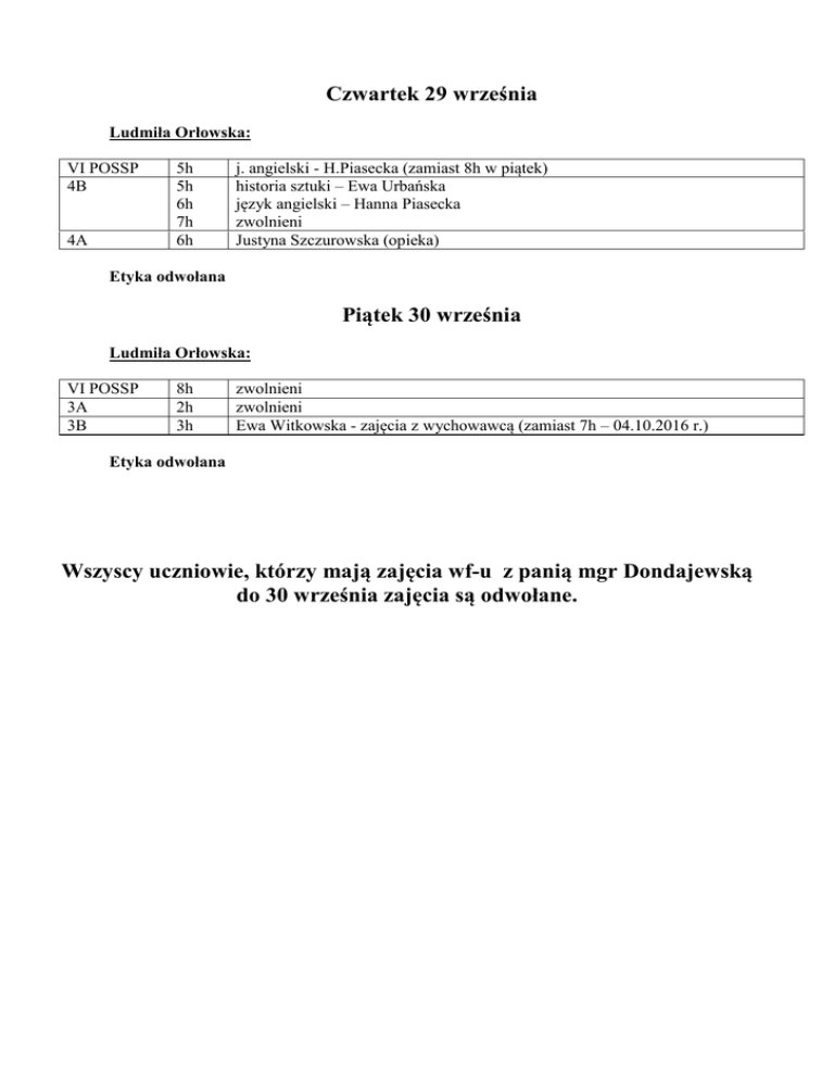 Czwartek 29 września Ludmiła Orłowska: VI POSSP 4B 4A 5h 5h 6h 7h 6h j. angielski - H.Piasecka (zamiast 8h w piątek) historia sztuki – Ewa Urbańska język angielski – Hanna Piasecka zwolnieni Justyna Szczurowska (opieka) Etyka odwołana Piątek 30 września Ludmiła Orłowska: VI POSSP 3A 3B 8h 2h 3h zwolnieni zwolnieni Ewa Witkowska - zajęcia z wychowawcą (zamiast 7h – 04.10.2016 r.) Etyka odwołana Wszyscy uczniowie, którzy mają zajęcia wf-u z panią mgr Dondajewską do 30 września zajęcia są odwołane.