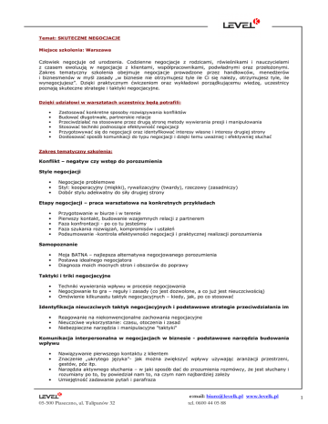 Temat: SKUTECZNE NEGOCJACJE Miejsce szkolenia: Warszawa Człowiek negocjuje od urodzenia. Codzienne negocjacje z rodzicami, rówieśnikami i nauczycielami z czasem ewoluują w negocjacje z klientami, współpracownikami, podwładnymi oraz przełożonymi. Zakres tematyczny szkolenia obejmuje negocjacje prowadzone przez handlowców, menedżerów i biznesmenów w myśl zasady „w biznesie nie otrzymujesz tyle ile Ci się należy, otrzymujesz tyle, ile wynegocjujesz”. Dzięki praktycznym ćwiczeniom oraz wykładowi porządkującemu wiedzę, uczestnicy poznają skuteczne strategie i taktyki negocjacyjne. Dzięki udziałowi w warsztatach uczestnicy będą potrafili: • • • • • • Zastosować konkretne sposoby rozwiązywania konfliktów Budować długotrwałe, partnerskie relacje Przeciwdziałać na stosowane przez drugą stronę metody wywierania presji i manipulowania Stosować techniki podnoszące efektywność negocjacji Przygotowywać się do negocjacji oraz identyfikować interesy własne i interesy drugiej strony Dostosować sposób komunikacji do typu negocjacji i dzięki temu uważniej i efektywniej słuchać Zakres tematyczny szkolenia: Konflikt – negatyw czy wstęp do porozumienia Style negocjacji • • • Negocjacje problemowe Styl: kooperacyjny (miękki), rywalizacyjny (twardy), rzeczowy (zasadniczy) Dobór stylu adekwatny do siły drugiej strony Etapy negocjacji – praca warsztatowa na konkretnych przykładach • • • • • Przygotowanie w biurze i w terenie Pierwszy kontakt, budowanie wzajemnych relacji z partnerem Faza konfrontacji - po co tu jesteśmy Faza szukania rozwiązań, kompromisów i ustaleń Podsumowanie -kontrola efektywności negocjacji i praktycznej realizacji porozumienia Samopoznanie • • • Moja BATNA – najlepsza alternatywa negocjowanego porozumienia Postawa idealnego negocjatora Diagnoza moich mocnych stron i obszarów do poprawy Taktyki i triki negocjacyjne • • • Techniki wywierania wpływu w procesie negocjowania Negocjowanie to gra – reguły i zasady (co jest dozwolone, a co już jest nieuczciwością) Omówienie kilkunastu taktyk negocjacyjnych – kiedy, jak, po co stosować Identyfikacja nieuczciwych taktyk negocjacyjnych i podstawowe strategie przeciwdziałania im • • • Reagowanie na niekonwencjonalne zachowania negocjacyjne Nieuczciwe wykorzystanie: czasu, otoczenia i zasad Niebezpieczne narzędzia i manipulacyjne "taktyki" Komunikacja interpersonalna w negocjacjach w biznesie - podstawowe narzędzia budowania wpływu • • • • Nawiązywanie pierwszego kontaktu z klientem Znaczenie „ukrytego języka”- jak można zwiększyć wpływy używając aranżacji przestrzeni, gestów, póz itp. Narzędzia aktywnego słuchania – w jaki sposób dać do zrozumienia rozmówcy, że jest słuchany i rozumiany po to, by powiedział nam to, na czym nam najbardziej zależy Umiejętność zadawanie pytań i parafraza 05-500 Piaseczno, ul. Tulipanów 32 e:mail: [email protected] www.levelk.pl tel. 0600 44 05 88 1 Techniki wpływu w trudnych sytuacjach partnerskiej relacji z drugą stroną. • • • • negocjacyjnych, budowanie równorzędnej, Identyfikacja stanowiska i interesów (korzyści) Dopasowanie stylu wypowiedzi do systemu poznawczego rozmówcy Techniki radzenia sobie z obiekcjami i przełamywania impasu w negocjacjach Negocjowanie reguł gry Znaczenie asertywności w negocjacjach - umocnienie postawy uczestników i kreowanie nowych zachowań w trudnych sytuacjach negocjacyjnych. • • • Wyrażanie własnych opinii i radzenie sobie z krytyką Reagowanie na aluzje i niespodziewany atak Wyrażanie pozytywnych uczuć Metodologia szkolenia: Szkolenia prowadzone są metodą warsztatową, uwzględniają specyfikę uczenia się osób dorosłych. Uczestnicy biorą udział w ćwiczeniach grupowych, indywidualnych i w symulacjach, doświadczają procesów i technik negocjacji w sposób praktyczny. Odbywa się to w oparciu o gry i ćwiczenia mające swoje odniesienie do codziennych sytuacji, z jakimi spotykają się w swojej pracy zawodowej. Zajęcia mają charakter dynamiczny. Cena: 1390zł. brutto Każda kolejna osoba z tej samej firmy – 20% zniżki! Autor programu: Karolina Zielińska-Salamończyk Informacje i zgłoszenia: [email protected] tel. 0600 44 05 88 05-500 Piaseczno, ul. Tulipanów 32 e:mail: [email protected] www.levelk.pl tel. 0600 44 05 88 2