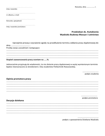 . . . . . . . . . . . . . . . . . .. . . . . . . . . . . . . . . . . Rzeszów, dnia ……………… r. imię i nazwisko . . . . . . . . . . . . . . . . . .. . . . . . . . . . . . . . . . . nr albumu, e-mail . . . . . . . . . . . . . . . . . .. . . . . . . . . . . . . . . . . Kierunek, specjalność . . . . . . . . . . . . . . . . . .. . . . . . . . . . . . . . . . . Imię i nazwisko promotora Prodziekan ds. Kształcenia Wydziału Budowy Maszyn i Lotnictwa Uprzejmie proszę o wyrażenie zgody na przedłużenie terminu oddania pracy dyplomowej do dnia ……………………………… . Prośbę swoja uzasadniam następująco: ……………………………………………………………………………………………………………………………………………………………………… ……………………………………………………………………………………………………………………………………………………………………… ……………………………………………………………………………………………………………………………………………………………………… ……………………………………………………………………………………………………………………………………………………………………… Stopień zaawansowania pracy oceniam na ……%. Jednocześnie przyjmuję do wiadomości, że nie złożenie pracy dyplomowej w wyżej wymienionym terminie będzie równoznaczne ze skreśleniem z listy studentów Politechniki Rzeszowskiej. …………………………… podpis studenta Opinia promotora pracy ……………………………………………………………………………………………………………………………………………………………………… ……………………………………………………………………………………………………………………………………………………………………… ……………………………………………………………………………………………………………………………………………………………………… ……………………………………………………………………………………………………………………………………………………………………… ……………………………………………….…………………………………………………………………………………………………………………… …………………………… podpis promotora Decyzja dziekana ……………………………………………………………………………………………………………………………………………………………………… ……………………………………………………………………………………………………………………………………………………………………… ……………………………………………………………………………………………………………………………………………………………………… ……………………………………………………………………………………………………………………………………………………………………… ……………………………………………………………………………………………………………………………………………………………………… ……….…………………………… podpis z upoważnienia Dziekana Wydziału