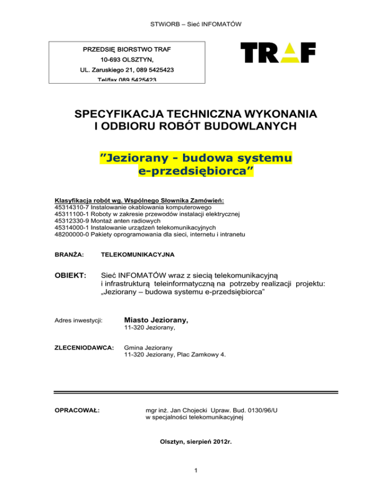 STWiORB – Sieć INFOMATÓW PRZEDSIĘ BIORSTWO TRAF 10-693 OLSZTYN, UL. Zaruskiego 21, 089 5425423 Tel/fax 089 5425423 SPECYFIKACJA TECHNICZNA WYKONANIA I ODBIORU ROBÓT BUDOWLANYCH ”Jeziorany - budowa systemu e-przedsiębiorca” Klasyfikacja robót wg. Wspólnego Słownika Zamówień: 45314310-7 Instalowanie okablowania komputerowego 45311100-1 Roboty w zakresie przewodów instalacji elektrycznej 45312330-9 Montaż anten radiowych 45314000-1 Instalowanie urządzeń telekomunikacyjnych 48200000-0 Pakiety oprogramowania dla sieci, internetu i intranetu BRANŻA: TELEKOMUNIKACYJNA OBIEKT: Sieć INFOMATÓW wraz z siecią telekomunikacyjną i infrastrukturą teleinformatyczną na potrzeby realizacji projektu: „Jeziorany – budowa systemu e-przedsiębiorca” Adres inwestycji: Miasto Jeziorany, 11-320 Jeziorany, ZLECENIODAWCA: OPRACOWAŁ: Gmina Jeziorany 11-320 Jeziorany, Plac Zamkowy 4. mgr inż. Jan Chojecki Upraw. Bud. 0130/96/U w specjalności telekomunikacyjnej Olsztyn, sierpień 2012r. 1 STWiORB – Sieć INFOMATÓW Spis zawartości: 1. WSTĘP ........................................................................................................................................... 3 1.1 Przedmiot Specyfikacji Technicznej (STWiRB) .................................................................. 3 1.2 Zakres stosowania specyfikacji technicznej ....................................................................... 3 1.3 Zakres robót objętych ST ................................................................................................... 3 1.3. Przeznaczenie instalacji sieci infomatów................................................................................. 3 1.4. Określenia podstawowe........................................................................................................... 3 1.5. Wymagania ogólne .................................................................................................................. 6 2. MATERIAŁY I URZĄDZENIA ......................................................................................................... 6 2.1 Ogólne wymagania ............................................................................................................. 6 2.2 Przewody elektroenergetyczne .......................................................................................... 6 2.3. Przewody sygnałowe .......................................................................................................... 6 2.4. Infomat ................................................................................................................................ 7 2.5. Radiolinie ............................................................................................................................ 7 2.5.1. Urządzenia radiolinii Alcoma AL17F MP155 ........................................................................ 7 2.5.2. Urządzenia radiolinii SAF Lumina 24GHz ............................................................................ 9 2.5.3. Urządzenia radiolinii Alcoma AL80G 80GHz ...................................................................... 10 2.6. Urządzenia zasilające....................................................................................................... 12 2.14. Elektrotechniczny sprzęt instalacyjny ................................................................................. 12 2.15 Ograniczniki przepięć ........................................................................................................... 12 3. SPRZĘT ....................................................................................................................................... 12 3.1. Wymagania ogólne dotyczące sprzętu............................................................................. 12 3.2. Sprzęt do budowy instalacji monitoringu wizyjnego. ........................................................ 12 4. TRANSPORT ............................................................................................................................... 13 4.1. Wymagania ogólne dotyczące transportu. ....................................................................... 13 4.2. Środki transportu do budowy instalacji monitoringu wizyjnego. ....................................... 13 4.3. Odbiór materiałów na budowie. ........................................................................................ 13 4.4. Składowanie materiałów na budowie. .............................................................................. 13 5. WYKONANIE ROBÓT.................................................................................................................. 13 5.1. Ogólne zasady wykonania robót. .......................................................................................... 13 5.2. Wymagania szczególne dotyczące wykonania robót ....................................................... 13 5.3. Sprawdzenie i uruchomienie systemu .............................................................................. 14 5.4. Ochrona ............................................................................................................................ 14 5.5. Działanie poza miejscem zainstalowania ......................................................................... 14 5.6. Działanie w miejscu zainstalowania ................................................................................. 14 5.7. Połączenia wyrównawcze ................................................................................................ 14 5.8. Ochrona przepięciowa. ..................................................................................................... 14 6. KONTROLA JAKOŚCI ROBÓT ................................................................................................... 14 6.1. Wymagania ogólne. ....................................................................................
