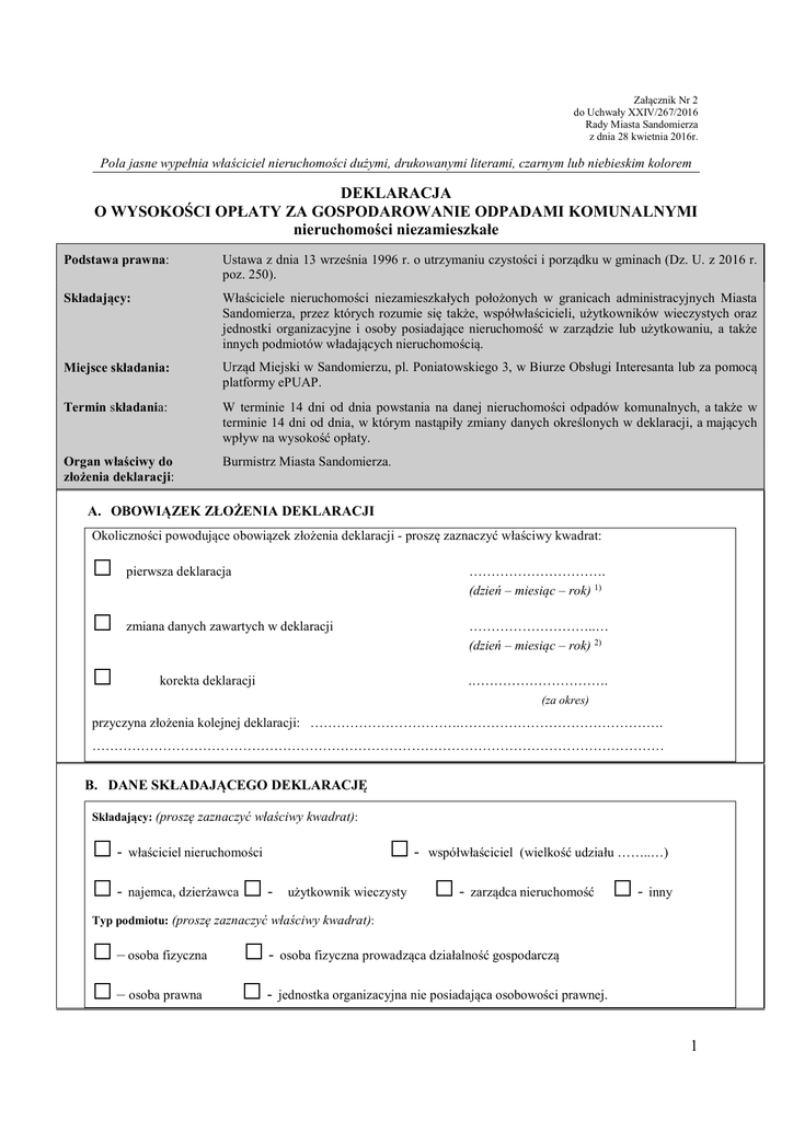 Załącznik Nr 2 do Uchwały XXIV/267/2016 Rady Miasta Sandomierza z dnia 28 kwietnia 2016r. Pola jasne wypełnia właściciel nieruchomości dużymi, drukowanymi literami, czarnym lub niebieskim kolorem DEKLARACJA O WYSOKOŚCI OPŁATY ZA GOSPODAROWANIE ODPADAMI KOMUNALNYMI nieruchomości niezamieszkałe Podstawa prawna: Składający: Miejsce składania: Termin składania: Organ właściwy do złożenia deklaracji: Ustawa z dnia 13 września 1996 r. o utrzymaniu czystości i porządku w gminach (Dz. U. z 2016 r. poz. 250). Właściciele nieruchomości niezamieszkałych położonych w granicach administracyjnych Miasta Sandomierza, przez których rozumie się także, współwłaścicieli, użytkowników wieczystych oraz jednostki organizacyjne i osoby posiadające nieruchomość w zarządzie lub użytkowaniu, a także innych podmiotów władających nieruchomością. Urząd Miejski w Sandomierzu, pl. Poniatowskiego 3, w Biurze Obsługi Interesanta lub za pomocą platformy ePUAP. W terminie 14 dni od dnia powstania na danej nieruchomości odpadów komunalnych, a także w terminie 14 dni od dnia, w którym nastąpiły zmiany danych określonych w deklaracji, a mających wpływ na wysokość opłaty. Burmistrz Miasta Sandomierza. A. OBOWIĄZEK ZŁOŻENIA DEKLARACJI □ Okoliczności powodujące obowiązek złożenia deklaracji - proszę zaznaczyć właściwy kwadrat: □ □ pierwsza deklaracja …………………………. (dzień – miesiąc – rok) 1) zmiana danych zawartych w deklaracji ………………………..… (dzień – miesiąc – rok) 2) korekta deklaracji .…………………………. (za okres) przyczyna złożenia kolejnej deklaracji: …………………………….………………………………………. ………………………………………………………………………………………………………………… B. DANE SKŁADAJĄCEGO DEKLARACJĘ □□- Składający: (proszę zaznaczyć właściwy kwadrat): □– □– właściciel nieruchomości najemca, dzierżawca □- □□- użytkownik wieczysty Typ podmiotu: (proszę zaznaczyć właściwy kwadrat): osoba fizyczna osoba prawna □- współwłaściciel (wielkość udziału ……..…) □- zarządca nieruchomość □- inny osoba fizyczna prowadząca działalność gospodarczą jednostka organizacyjna nie posiadająca osobowości prawnej. 1 Pełna nazwa 3) / Nazwisko i imię 4) Pełnomocnik ( nazwisko i imię): Identyfikator REGON 3) /PESEL 4) Numer KRS/NIP 3) Adres siedziby lub miejsce zamieszkania dla osoby fizycznej prowadzącej działalność gospodarczą Miejscowość Nr domu Ulica Kod pocztowy Poczta Nr telefonu5) Adres e-mail5) Nr Lokalu C. ADRES NIERUCHOMOŚCI W SANDOMIERZU, NA KTÓREJ POWSTAJĄ ODPADY KOMUNALNE Ulica D. DEKLARACJA Nr domu Nr lokalu Nr działki 6) Oświadczam, że prowadzę następujący rodzaj działalności :…………………………………………………. ………………………………………………………………………………………………………………… ………………………………………………………………………w ramach której: 1. średnio na dzień jest zatrudnionych pracowników ……………. 2. średnio na dzień w szkole przebywa uczniów i pracowników ……………. 3. średnio na dzień w żłobku/przedszkolu przebywa dzieci i pracowników .………… 4. lokal handlowy ma powierzchnię …………….m2 5. punkt handlowy bez lokalu tzw. stragan zatrudnia ………. pracowników 6. uliczny punkt szybkiej konsumpcji ……… punkty 7. lokal gastronomiczny posiada miejsc konsumpcyjnych ……………….. dodatkowo ogródki gastronomiczne posiadają ……………. miejsc konsumpcyjnych 8. w szpitalu/internacie/hotelu/ pensjonacie jest łóżek………. 9. zakład usługowy, rzemieślniczy, produkcyjny zatrudnia ….…... 10. inne dane niezbędne do oszacowania wysokości opłaty, a nie ujęte wyżej………………………. ……………………………………………………………………………………………………… ………………………………………………………………………………………………………. Minimalne normy odpadów komunalnych, które mogą powstawać w wyniku wyżej wymienionej działalności są zawarte w Regulaminie utrzymania czystości porządku na terenie Miasta Sandomierza 2 Ilość deklarowanych odpadów Rodzaj Ilość pojemników/pojemność pojemników A 120 l Częstotliwość odbioru w miesiącu B Ilość odpadów (iloczyn kolumn A x B x C) C D …………....……. litrów 240 l …………....……. litrów 1100 l …………....……. litrów 7 tys. l. …………....……. litrów 10 tys. l …………....……. litrów 12 tys. l …………....……. litrów inne ……..……. l …………....……. litrów Łączna, miesięczna ilość deklarowanych odpadów …................……. litrów Deklarowana ilość pojemników przeliczeniowych - 120 litrowych (suma kolumny D podzielona przez 120, zaokrąglona do liczby całkowitej) Miesięczna stawka opłaty za gospodarowanie odpadami komunalnymi wynikająca z uchwał Rady Miasta, za pojemnik przeliczeniowy - pojemnik120 litrowy - wynosi: □ ………………………… przy segregowaniu odpadów 10,00 zł □ bez prowadzenia segregowania odpadów 15,00 zł Oświadczam, iż odpady powstałe na mojej nieruchomości będę segregował(a) - proszę zaznaczyć właściwy kwadrat: Wyliczenie miesięcznej opłaty: (iloczyn liczby pojemników przeliczeniowych i stawki opłaty). TAK NIE _____________ zł (słownie zł)…………………….…………………………………. …………………………………………………………………….... E. PODPIS SKŁADAJĄCEGO DEKLARACJĘ / OSOBY REPREZENTUJĄCEJ SKŁADAJĄCEGO ……………………………… (miejscowość) ………………………. (dat