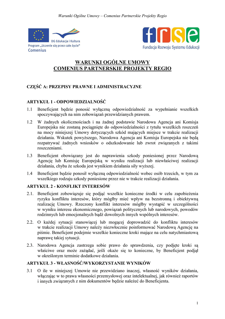 Warunki Ogólne Umowy – Comenius Partnerskie Projekty Regio WARUNKI OGÓLNE UMOWY COMENIUS PARTNERSKIE PROJEKTY REGIO CZĘŚĆ A: PRZEPISY PRAWNE I ADMINISTRACYJNE ARTYKUŁ 1 - ODPOWIEDZIALNOŚĆ 1.1 Beneficjent będzie ponosić wyłączną odpowiedzialność za wypełnianie wszelkich spoczywających na nim zobowiązań przewidzianych prawem. 1.2 W Ŝadnych okolicznościach i na Ŝadnej podstawie Narodowa Agencja ani Komisja Europejska nie zostaną pociągnięte do odpowiedzialności z tytułu wszelkich roszczeń na mocy niniejszej Umowy dotyczących szkód mających miejsce w trakcie realizacji działania. Wskutek powyŜszego, Narodowa Agencja ani Komisja Europejska nie będą rozpatrywać Ŝadnych wniosków o odszkodowanie lub zwrot związanych z takimi roszczeniami. 1.3 Beneficjent obowiązany jest do naprawienia szkody poniesionej przez Narodową Agencję lub Komisję Europejską w wyniku realizacji lub niewłaściwej realizacji działania, chyba Ŝe szkoda jest wynikiem działania siły wyŜszej. 1.4 Beneficjent będzie ponosił wyłączną odpowiedzialność wobec osób trzecich, w tym za wszelkiego rodzaju szkody poniesione przez nie w trakcie realizacji działania. ARTYKUŁ 2 - KONFLIKT INTERESÓW 2.1. Beneficjent zobowiązuje się podjąć wszelkie konieczne środki w celu zapobieŜenia ryzyku konfliktu interesów, który mógłby mieć wpływ na bezstronną i obiektywną realizację Umowy. Rzeczony konflikt interesów mógłby wystąpić w szczególności w wyniku interesu ekonomicznego, powiązań politycznych lub narodowych, powodów rodzinnych lub emocjonalnych bądź dowolnych innych wspólnych interesów. 2.2. O kaŜdej sytuacji stanowiącej lub mogącej doprowadzić do konfliktu interesów w trakcie realizacji Umowy naleŜy niezwłocznie poinformować Narodową Agencję na piśmie. Beneficjent podejmie wszelkie konieczne kroki mające na celu natychmiastową naprawę takiej sytuacji. 2.3. Narodowa Agencja zastrzega sobie prawo do sprawdzenia, czy podjęte kroki są właściwe oraz moŜe zaŜądać, jeśli okaŜe się to konieczne, by Beneficjent podjął w określonym terminie dodatkowe działania. ARTYKUŁ 3 - WŁASNOŚĆ/WYKORZYSTANIE WYNIKÓW 3.1 O ile w niniejszej Umowie nie przewidziano inaczej, własność wyników działania, włączając w to prawa własności przemysłowej oraz intelektualnej, jak równieŜ raportów i innych związanych z nim dokumentów będzie naleŜeć do Beneficjenta. 1 Warunki Ogólne Umowy – Comenius Partnerskie Projekty Regio 3.2 Z zastrzeŜeniem postanowień Artykułu 3.1, Beneficjent przyznaje Narodowej Agencji oraz Komisji Europejskiej prawo do nieodpłatnego korzystania z wyników działania w sposób, jaki uznają za stosowny, pod warunkiem, Ŝe nie naruszą tym samym swoich zobowiązań do zachowania poufności lub istniejących praw własności przemysłowej oraz intelektualnej. ARTYKUŁ 4 - POUFNOŚĆ Narodowa Agencja oraz Beneficjent zobowiązują się do zachowania poufności wszelkich dokumentów, informacji lub innych materiałów bezpośrednio związanych z przedmiotem Umowy, które zostaną naleŜycie sklasyfikowane jako poufne, jeśli ich ujawnienie mogłoby spowodować poniesienie uszczerbku przez drugą stronę. Strony pozostaną związane tym postanowieniem równieŜ po dacie zakończenia działania. ARTYKUŁ 5 - PROMOCJA 5.1 O ile Narodowa Agencja nie przedłoŜy odmiennego Ŝądania, wszelkie komunikaty lub publikacje przekazywane bądź rozpowszechniane przez Beneficjenta w związku z działaniem, w tym na konferencjach lub seminariach, będą wskazywać, Ŝe działanie jest finansowane przez UE. Wszelkie komunikaty lub publikacje przekazywane bądź rozpowszechniane przez Beneficjenta, w kaŜdej formie i na kaŜdym nośniku, będą wskazywać, Ŝe wyłączna odpowiedzialność spoczywa na autorze, zaś Narodowa Agencja i Komisja Europejska nie są odpowiedzialne za Ŝaden przypadek ewentualnego wykorzystania zawartych w nich informacji. 5.2 Beneficjent upowaŜnia Narodową Agencję oraz Komisję Europejską do publikowania następujących informacji, w dowolnej formie i na dowolnym nośniku, w tym w Internecie: - nazwy i adresu Beneficjenta, - przedmiotu i celu dofinansowania, - kwoty przyznanych środków finansowych i proporcji łącznych kosztów działania objętych finansowaniem. Na uzasadniony i naleŜycie umotywowany wniosek Beneficjenta Narodowa Agencja i Komisja mogą odstąpić od publikowania powyŜszych informacji, jeŜeli ich ujawnienie naraziłoby na szwank bezpieczeństwo Beneficjenta lub jego interesy. ARTYKUŁ 6 - OCENA W kaŜdym przypadku, gdy Narodowa Agencja, Komisja Europejska lub dowolny organ zewnętrzny upowaŜniony przez Narodową Agencję lub Komisję Europejską będzie prowadzić cząstkową lub końcową ocenę rezultatów działania w zestawieniu z celami danego programu UE, Beneficjent zobowiązuje się udostępnić Narodowej Agencji, Komisji Europejskiej lub osobom upowaŜnionym przez nie wszelkie dokumenty lub informacje, które umoŜliwią pomyślne przeprowadzenie ewaluacji oraz przyznać im prawa dostępu określone w Artykule 19. ARTYKUŁ 7 - ZAWIESZENIE Beneficjent moŜe wnioskować o zawieszenie realizacji działania, jeśli w wyniku nadzwyczajnych okoliczności okaŜe się ona niemoŜliwa lub nadmiernie utrudniona, szczególnie w przypadkach działania siły wyŜszej. Beneficjent zobowiązany jest bezzwłocznie przesłać wniosek o zawieszenie do Narodowej Agencji w formie 2 Warunki Ogólne Umowy – Comenius Partnerskie Projekty Regio zawiadomienia na piśmie z podaniem wszystkich niezbędnych powodów i szczegółów oraz przewidywanej daty ponownego wszczęcia realizacji działania. Narodowa Agencja moŜe zatwierdzić lub odrzucić wniosek lub zatwierdzić go pod warunkiem zaakceptowania przez Beneficjenta warunków przedstawionych przez NA. W stosownych przypadkach, Narodowa Agencja poinformuje Beneficjenta o swojej decyzji poprzez wystosowanie zawiadomienia na piśmie 