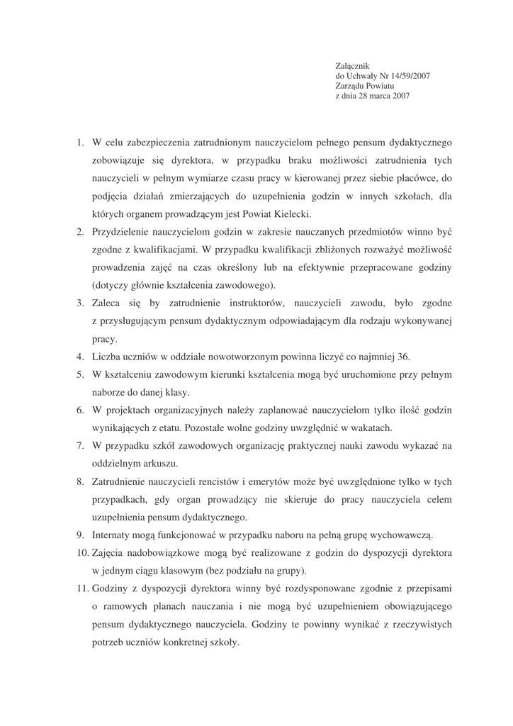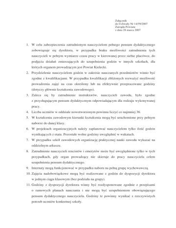 Zał cznik do Uchwały Nr 14/59/2007 Zarz du Powiatu z dnia 28 marca 2007 1. W celu zabezpieczenia zatrudnionym nauczycielom pełnego pensum dydaktycznego zobowi zuje si dyrektora, w przypadku braku mo liwo ci zatrudnienia tych nauczycieli w pełnym wymiarze czasu pracy w kierowanej przez siebie placówce, do podj cia działa zmierzaj cych do uzupełnienia godzin w innych szkołach, dla których organem prowadz cym jest Powiat Kielecki. 2. Przydzielenie nauczycielom godzin w zakresie nauczanych przedmiotów winno by zgodne z kwalifikacjami. W przypadku kwalifikacji zbli onych rozwa y mo liwo prowadzenia zaj na czas okre lony lub na efektywnie przepracowane godziny (dotyczy głównie kształcenia zawodowego). 3. Zaleca si by zatrudnienie instruktorów, nauczycieli zawodu, było zgodne z przysługuj cym pensum dydaktycznym odpowiadaj cym dla rodzaju wykonywanej pracy. 4. Liczba uczniów w oddziale nowotworzonym powinna liczy co najmniej 36. 5. W kształceniu zawodowym kierunki kształcenia mog by uruchomione przy pełnym naborze do danej klasy. 6. W projektach organizacyjnych nale y zaplanowa nauczycielom tylko ilo godzin wynikaj cych z etatu. Pozostałe wolne godziny uwzgl dni w wakatach. 7. W przypadku szkół zawodowych organizacj praktycznej nauki zawodu wykaza na oddzielnym arkuszu. 8. Zatrudnienie nauczycieli rencistów i emerytów mo e by uwzgl dnione tylko w tych przypadkach, gdy organ prowadz cy nie skieruje do pracy nauczyciela celem uzupełnienia pensum dydaktycznego. 9. Internaty mog funkcjonowa w przypadku naboru na pełn grup wychowawcz . 10. Zaj cia nadobowi zkowe mog by realizowane z godzin do dyspozycji dyrektora w jednym ci gu klasowym (bez podziału na grupy). 11. Godziny z dyspozycji dyrektora winny by rozdysponowane zgodnie z przepisami o ramowych planach nauczania i nie mog by uzupełnieniem obowi zuj cego pensum dydaktycznego nauczyciela. Godziny te powinny wynika z rzeczywistych potrzeb uczniów konkretnej szkoły. 12. Przydział godzin ponadwymiarowych mo e by szczególna i mie uwzgl dniony jako sytuacja uzasadnienie wynikaj ce z ramowego planu nauczania szkoły i kwalifikacji nauczyciela. 13. Godziny dydaktyczne nauczycieli zajmuj cych stanowiska kierownicze winny wynika z posiadanych kwalifikacji i wymiaru godzin przypadaj cych na poszczególne przedmioty. 14. Do projektu arkusza organizacyjnego nale y doł czy ramowe plany nauczania obowi zuj ce dla poszczególnych typów szkół uwzgl dnionych w projekcie, wykaz pracowników administracji i obsługi oraz cz opisow do podj tych działa i zamierze . 15. Wszelkie zmiany organizacyjne w arkuszu maj ce miejsce w trakcie roku szkolnego nale y dokona aneksem przedło onym do zatwierdzenia organowi prowadz cemu z siedmiodniowym wyprzedzeniem. 16. Ponadto przy konstruowaniu projektu arkusza organizacji roku szkolnego 2007/2008 nale y uwzgl dni subwencj . przewidywany plan finansowy szkoły zgodnie z przyznan