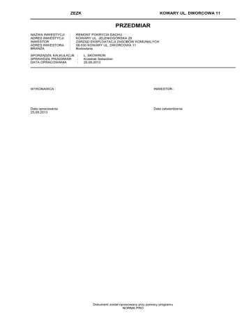 ZEZK KOWARY UL. DWORCOWA 11 PRZEDMIAR NAZWA INWESTYCJI ADRES INWESTYCJI INWESTOR ADRES INWESTORA BRANŻA : : : : : REMONT POKRYCIA DACHU KOWARY UL. JELENIOGÓRSKA 28 ZARZĄD EKSPLOATACJI ZASOBÓW KOMUNALYCH 58-530 KOWARY UL. DWORCOWA 11 Budowlana SPORZĄDZIŁ KALKULACJE : SPRAWDZIŁ PRZEDMIAR : DATA OPRACOWANIA : L. SKOWRON Krześlak Sebastian 25,09.2013 WYKONAWCA : INWESTOR : Data opracowania 25,09.2013 Data zatwierdzenia Dokument został opracowany przy pomocy programu NORMA PRO JELENIOGÓRSKA 28 DACH.kst nr 2.PRD PRZEDMIAR Lp. Podstawa Opis i wyliczenia 1 KNR-W 4-01 Rozbiórka pokrycia z papy na dachach drewnianych - pierwsza warstwa 0518-04 15.0*5+187.40 j.m. m2 m2 2 KNR-W 4-01 Rozbiórka pokrycia z papy na dachach drewnianych - następna warstwa 0518-05 Krotność = 4 75.0 m2 3 KNR-W 4-01 Rozebranie pokrycia z tafli łupkowych nie nadających się do użytku 0520-08 analogia (6.80+17.30)/2*6*2+6.0+9.60*6.0*0.5+4.0*2.0 m2 4 KNR-W 4-01 Wymiana elementów konstrukcyjnych dachu - koniec krokwi 0416-01 4 szt. 5 KNR 0-21 4004-06 ANALOGIA Poszycie DACHU z płyt osb 15 mm m2 187.40+75.0 m2 Pokrycie dachów papą na podłożu drewnianym jednowarstwowo m2 187.40 m2 6 KNR 2-02 0501-01 m2 m2 szt. 7 KNR-W 2-02 Pokrycie dachów dachówką bitumiczną o kształcie "prostokąt" mocowaną na 0505-01 gwoździe kolor grafit , pełnego przyklejenia 187.40 m2 8 KNR AT-09 0104-04 Akcesoria do pokryć dachowych - ławy kominiarskie szt. 1 szt. Akcesoria do pokryć dachowych - płotek przeciwśniegowy m 4.0 m 9 KNR AT-09 0104-06 m2 10 KNR-W 2-02 Rynny dachowe półokrągłe o śr. 15 cm - z blachy z cynku 0520-04 17.30+9.60+5.50*2+6.50+2.50 m 11 KNR-W 2-02 Rury spustowe z PCW okrągłe o śr. 110 mm 0531-04 7.0*2+9.0*2+9.0 m m m 12 NNRNKB (z.VI) Obróbki blacharskie z blachy powlekanej o szer.w rozwinięciu do 25 cm m2 202 0541-01 (17.30+9.60*2+5.50+3.0+3.0*2+3.0*6+5.50*2+15.0)*0.25+5.0+8.0*4*0.25+3.0* m2 0.25*2+15.0*0.50 13 NNRNKB (z.II) deskowanie połaci dachowych z tarcicy nasyconej 202 0420-01 (17.30+9.60+5.50+3.0*3+5.0+5.0)*0.50 m2 15 KNR-W 2-02 Rusztowania zewnętrzne rurowe o wysokości do 10 m 1603-01 17.0*6.0+5.0*6.0+9.0*6.0 m2 16 KNR-W 2-02 Rynny dachowe półokrągłe o śr. 10 cm - z blachy z cynku 0520-02 3.0*2 m 17 KNR K-05 0209-07 Montaż wyłazu dachowego z kołnierzem uniwersalnym kpl. 1 kpl. -2- Norma PRO Wersja 4.36 Nr seryjny: 6097 Razem 262.400 RAZEM 262.400 75.000 RAZEM 75.000 187.400 RAZEM 187.400 4.000 RAZEM 4.000 262.400 RAZEM 262.400 187.400 RAZEM 187.400 187.400 RAZEM 187.400 1.000 RAZEM 1.000 4.000 RAZEM 4.000 46.900 RAZEM 46.900 41.000 RAZEM 41.000 45.750 RAZEM 45.750 25.700 RAZEM 25.700 75.000 RAZEM 75.000 186.000 RAZEM 186.000 6.000 RAZEM 6.000 1.000 RAZEM 1.000 0.203 RAZEM 0.203 m2 14 KNR-W 4-01 Naprawa pokryć dachowych papą termozgrzewalną - dwuwarstwowe pokrycie m2 0519-03 z papy perforowanej oraz papy wierzchniego krycia 75.0 m2 18 KNR-W 4-01 Przemurowanie kominów z cegieł o objętości w jednym miejscu do 0.5 m3 0310-01 zcegły klinkier ponad dachem 0.65*0.65*0.48 Poszcz m2 m m3 m3 JELENIOGÓRSKA 28 DACH.kst nr 2.PRD PRZEDMIAR Lp. Podstawa Opis i wyliczenia 19 KNR 4-01 Jednokrotne malowanie farbą olejną uprzednio malowanej stolarki drzwiowej, 1209-08 ana- ścianek i szafek o powierzchni ponad 1.0 okap logia 17.30+9.60+5.50*3 20 KNR 4-01 0108-09 21 KNR 4-01 0108-10 j.m. m2 m2 Wywiezienie gruzu spryzmowanego samochodami skrzyniowymi na odległość m3 do 1 km 75.0*0.03+187.0*0.01+0.20 m3 Wywiezienie gruzu spryzmowanego samochodami skrzyniowymi - za każdy następny 1 km Krotność = 5 4.32 m3 t 23 kal. zakłado- Utylizacja płytek eternitowych wa 187.40 m2 24 kal. własna Instalacja odgromowa 1 kpl. kpl. Wykonanie i montaż wentylacji wywiewnej 150/225 mm z blachy stalowej oc. ocieplanej ze skraplaczem,wyczystką daszkiem z wykonaniem przejść przez stropy i dach dł.4,0 mb 3 szt. 26 kal. własna t m2 szt. Wykonanie i montaż komina spalinowegoj 150/225 mm z blachy kwasoodpor- szt. nej ocieplanej ze skraplaczem,wyczystką daszkiem z wykonaniem przejść przez stropy i dach dł.4,0 mb 1 szt. -3- Norma PRO Wersja 4.36 Nr seryjny: 6097 Razem 43.400 RAZEM 43.400 4.320 RAZEM 4.320 4.320 RAZEM 4.320 0.750 RAZEM 0.750 187.400 RAZEM 187.400 1.000 RAZEM 1.000 3.000 RAZEM 3.000 1.000 RAZEM 1.000 m3 22 kal. zakłado- Utylizacja papy wa (75.0*2.50*4)/1000 25 kal. własna Poszcz