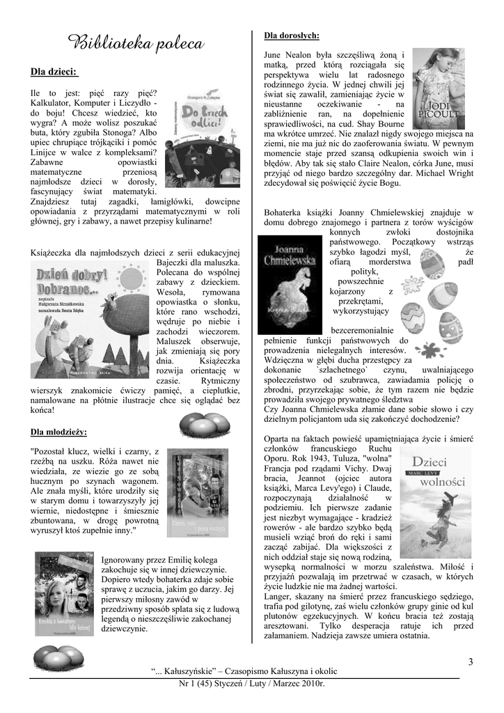 Biblioteka poleca Dla dzieci: Ile to jest: pięć razy pięć? Kalkulator, Komputer i Liczydło do boju! Chcesz wiedzieć, kto wygra? A może wolisz poszukać buta, który zgubiła Stonoga? Albo upiec chrupiące trójkąciki i pomóc Linijce w walce z kompleksami? Zabawne opowiastki matematyczne przeniosą najmłodsze dzieci w dorosły, fascynujący świat matematyki. Znajdziesz tutaj zagadki, łamigłówki, dowcipne opowiadania z przyrządami matematycznymi w roli głównej, gry i zabawy, a nawet przepisy kulinarne! Książeczka dla najmłodszych dzieci z serii edukacyjnej Bajeczki dla maluszka. Polecana do wspólnej zabawy z dzieckiem. Wesoła, rymowana opowiastka o słonku, które rano wschodzi, wędruje po niebie i zachodzi wieczorem. Maluszek obserwuje, jak zmieniają się pory dnia. Książeczka rozwija orientację w czasie. Rytmiczny wierszyk znakomicie ćwiczy pamięć, a cieplutkie, namalowane na płótnie ilustracje chce się oglądać bez końca! Dla młodzieży: "Pozostał klucz, wielki i czarny, z rzeźbą na uszku. Róża nawet nie wiedziała, ze wiezie go ze sobą hucznym po szynach wagonem. Ale znała myśli, które urodziły się w starym domu i towarzyszyły jej wiernie, niedostępne i śmiesznie zbuntowana, w drogę powrotną wyruszył ktoś zupełnie inny." Ignorowany przez Emilię kolega zakochuje się w innej dziewczynie. Dopiero wtedy bohaterka zdaje sobie sprawę z uczucia, jakim go darzy. Jej pierwszy miłosny zawód w przedziwny sposób splata się z ludową legendą o nieszczęśliwie zakochanej dziewczynie. Dla dorosłych: June Nealon była szczęśliwą żoną i matką, przed którą rozciągała się perspektywa wielu lat radosnego rodzinnego życia. W jednej chwili jej świat się zawalił, zamieniając życie w nieustanne oczekiwanie na zabliźnienie ran, na dopełnienie sprawiedliwości, na cud. Shay Bourne ma wkrótce umrzeć. Nie znalazł nigdy swojego miejsca na ziemi, nie ma już nic do zaoferowania światu. W pewnym momencie staje przed szansą odkupienia swoich win i błędów. Aby tak się stało Claire Nealon, córka June, musi przyjąć od niego bardzo szczególny dar. Michael Wright zdecydował się poświęcić życie Bogu. Bohaterka książki Joanny Chmielewskiej znajduje w domu dobrego znajomego i partnera z torów wyścigów konnych zwłoki dostojnika państwowego. Początkowy wstrząs szybko łagodzi myśl, że ofiarą morderstwa padł polityk, powszechnie kojarzony z przekrętami, wykorzystujący bezceremonialnie pełnienie funkcji państwowych do prowadzenia nielegalnych interesów. Wdzięczna w głębi ducha przestępcy za dokonanie `szlachetnego` czynu, uwalniającego społeczeństwo od szubrawca, zawiadamia policję o zbrodni, przyrzekając sobie, że tym razem nie będzie prowadziła swojego prywatnego śledztwa Czy Joanna Chmielewska złamie dane sobie słowo i czy dzielnym policjantom uda się zakończyć dochodzenie? Oparta na faktach powieść upamiętniająca życie i śmierć członków francuskiego Ruchu Oporu. Rok 1943, Tuluza, "wolna" Francja pod rządami Vichy. Dwaj bracia, Jeannot (ojciec autora książki, Marca Levy'ego) i Claude, rozpoczynają działalność w podziemiu. Ich pierwsze zadanie jest niezbyt wymagające - kradzież rowerów - ale bardzo szybko będą musieli wziąć broń do ręki i sami zacząć zabijać. Dla większości z nich oddział staje się nową rodziną, wysepką normalności w morzu szaleństwa. Miłość i przyjaźń pozwalają im przetrwać w czasach, w których życie ludzkie nie ma żadnej wartości. Langer, skazany na śmierć przez francuskiego sędziego, trafia pod gilotynę, zaś wielu członków grupy ginie od kul plutonów egzekucyjnych. W końcu bracia też zostają aresztowani. Tylko desperacja ratuje ich przed załamaniem. Nadzieja zawsze umiera ostatnia. 3 “... Kałuszyńskie” – Czasopismo Kałuszyna i okolic Nr 1 (45) Styczeń / Luty / Marzec 2010r.