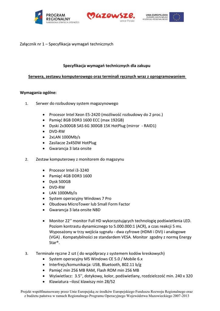 Załącznik nr 1 – Specyfikacja wymagań technicznych Specyfikacja wymagań technicznych dla zakupu Serwera, zestawu komputerowego oraz terminali ręcznych wraz z oprogramowaniem Wymagania ogólne: 1. Serwer do rozbudowy system magazynowego        2. 3. Procesor Intel Xeon E5-2420 (możliwość rozbudowy do 2 proc.) Pamięć 8GB DDR3 1600 ECC (max 192GB) Dyski 2x300GB SAS 6G 300GB 15K HotPlug (mirror - RAID1) DVD-RW 2xLAN 1000Mb/s Zasilacze 2x450W HotPlug Gwarancja 3 lata onsite Zestaw komputerowy z monitorem do magazynu         Procesor Intel i3-3240 Pamięć 4GB DDR3 1600 Dysk 500GB DVD-RW LAN 1000Mb/is System operacyjny Windows 7 Pro Obudowa MicroTower lub Small Form Factor Gwarancja 3 lata onsite NBD  Monitor 22’’ monitor Full HD wykorzystujących technologię podświetlenia LED. Poziom kontrastu dynamicznego to 5.000.000:1 (ACR), a czas reakcji 5 ms. Wyposażony w trzy wejścia sygnału - dwa cyfrowe (HDMI i DVI) i analogowe (VGA) . Kompatybilności ze standardem VESA. Monitor zgodny z normą Energy Star®. Terminale ręczne 2 szt ( do współpracy z systemem kodów kreskowych)  System operacyjny MS Windows CE 5.0 / Mobile 6.x  Interfrejs/komunikacja: USB, Bluetooth, 802.11 b/g  Pamięć min 256 MB RAM, Flash ROM min 256 MB  Wyświetlacz: 3.5'', dotykowy, kolor, podświetlany, rozdzielczość min. 240 x 320  Klawiatura –ilosć klawiszy min 28/52 Projekt współfinansowany przez Unie Europejską ze środków Europejskiego Funduszu Rozwoju Regionalnego oraz z budżetu państwa w ramach Regionalnego Programu Operacyjnego Województwa Mazowieckiego 2007-2013        4. Czytnik kodów kreskowych: Laser 1D, Imager 2D lub Imager 2D HD Bezpieczny upadek na twarda powierzchnię: min1,2m Klasa bezpieczeństwa: IP54 Temperatura Pracy: przynajmniej od -10°C do 50°C Temperatura Składowania: przynajmniej od -10°C do 50°C Dopuszczalna wilgotność:w przedziale około 5 – 85 % (bez kondensacji pary wodnej) Wyposażenie: terminal, dok komunikacyjno-ładujący, akumulator, zasilacz, kabel komunikacyjny Licencje oprogramowania systemowego dla serwera    Windows Server 2012 Standard 2CPU/2VM OEM Licencje dostępowe do serwera WinSvr CAL 2012 10 Users Licencję zdalnego dostępu WinSvr RDS CAL 2012 5Device 5. Licencje oprogramowania bazodanowego dla serwera  MS SQL Server 2012 Standard Runtime Edition 6. Licencja jednostanowiskowa rozszerzenia oprogramowania oprogramowania WF-MAG do magazynu  7. WF-MAG WIN PRESTIŻ PLUS STANOWISKO Licencja pakietu Office Home and Business do magazynu  Licencja Office Home and Business 2013 MLS Projekt współfinansowany przez Unie Europejską ze środków Europejskiego Funduszu Rozwoju Regionalnego oraz z budżetu państwa w ramach Regionalnego Programu Operacyjnego Województwa Mazowieckiego 2007-2013