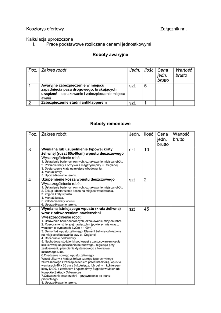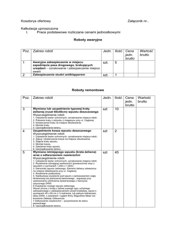 Załącznik nr.. Kosztorys ofertowy Kalkulacja uproszczona I. Prace podstawowe rozliczane cenami jednostkowymi Roboty awaryjne Poz. Zakres robót 1 2 Awaryjne zabezpieczenie w miejscu zapadnięcia pasa drogowego, brakujących urządzeń – oznakowanie i zabezpieczenie miejsca awarii Zabezpieczenie studni antiklapperem Jedn. Ilość Cena jedn. brutto szt. 5 szt. Wartość brutto 1 Roboty remontowe Poz. Zakres robót 3 Wymiana lub uzupełnienie typowej kraty żeliwnej (ruszt 60x40cm) wpustu deszczowego Wyszczególnienie robót: Jedn. Ilość Cena Wartość jedn. brutto brutto szt 10 1. Ustawienie barier ochronnych, oznakowanie miejsca robót.. 2. Pobranie kraty z odzysku z magazynu przy ul. Ceglanej. 3. Dostarczenie kraty na miejsce wbudowania. 4. Montaż kraty. 5. Uporządkowanie terenu. 4 Uzupełnienie kosza wpustu deszczowego Wyszczególnienie robót: szt 2 szt 45 1. Ustawienie barier ochronnych, oznakowanie miejsca robót.. 2. Zakup i dostarczenie kosza na miejsce wbudowania. 3. Zdjęcie kraty wpustu. 4. Montaż kosza. 5. Założenie kraty wpustu. 6. Uporządkowanie terenu. 5 Wymiana istniejącego wpustu (krata żeliwna) wraz z odtworzeniem nawierzchni Wyszczególnienie robót: 1. Ustawienie barier ochronnych, oznakowanie miejsca robót. 2. Rozebranie istniejącej nawierzchni (powierzchnia wraz z wpustem o wymiarach 1,20m x 1,00m) 3. Demontaż wpustu żeliwnego. Element żeliwny odwieziony na miejsce składowania przy ul. Ceglanej. 4. Rozebranie podbudowy. 5. Nadbudowa studzienki pod wpust z zastosowaniem cegły klinkierowej lub pierścienia betonowego , regulacja przy zastosowaniu pierścienia dystansowego z tworzywa sztucznego D400. 6.Osadzenie nowego wpustu żeliwnego. Wpust uliczny z kratą z żeliwa szarego typu uchylnego zatrzaskowego z zabezpieczeniem przed kradzieżą, wpust o wymiarach 40 x 60 cm z ¾ kołnierza, lub pełnym kołnierzem, klasy D400, z zawiasem i ryglem firmy Stąporków Meier lub Koneckie Zakłady Odlewnicze 7.Odtworzenie nawierzchni – przywrócenie do stanu pierwotnego 8. Uporządkowanie terenu. 9. Wywiezienie gruzu. 6 Regulacja pionowa istniejącego wpustu wraz z odtworzeniem nawierzchni Wyszczególnienie robót: szt 15 szt. 10 m 5 szt. 2 1. Ustawienie barier ochronnych, oznakowanie miejsca robót. 2. Rozebranie istniejącej nawierzchni (powierzchnia w rzucie wraz z wpustem o wymiarach 1,20m x 1,00m). 3. Demontaż wpustu żeliwnego. 4. Rozebranie podbudowy. 5. Nadbudowa studzienki pod wpust z zastosowaniem cegły klinkierowej lub pierścienia betonowego, regulacja przy zastosowaniu pierścienia dystansowego z tworzywa sztucznego D400. 6.Osadzenie istniejącego wpustu żeliwnego. 7.Odtworzenie nawierzchni – przywrócenie do stanu pierwotnego. 7 Wymiana całego wpustu deszczowego Wyszczególnienie robót: 1. Ustawienie barier ochronnych, oznakowanie miejsca robót. 2. Rozebranie istniejącej nawierzchni (powierzchnia w rzucie wraz z wpustem o wymiarach 1,20m x 1,00m). 3. Demontaż kraty żeliwnej. Element żeliwny odwieziony na miejsce składowania przy ul. Ceglanej. 4. Demontaż studzienki ściekowej, wyjęcie nadstawy, osadnika 5. Montaż studzienki ściekowej o średnicy 500mm z gotowych elementów betonowych z osadnikiem min. 0,5m. Wykonanie szczelnego włączenia istniejącego przykanalika do studzienki ściekowej. 6. Nadbudowa studzienki pod wpust z zastosowaniem cegły klinkierowej lub pierścienia betonowego , regulacja przy zastosowaniu pierścienia dystansowego z tworzywa sztucznego D400. 7.Osadzenie nowego wpustu żeliwnego z koszem. Wpust uliczny z kratą z żeliwa szarego typu uchylnego zatrzaskowego z zabezpieczeniem przed kradzieżą, wpust o wymiarach 40 x 60 cm z ¾ kołnierza lub pełnym kołnierzem, klasy D400, z zawiasem i ryglem firmy Stąporków Meier lub Koneckie Zakłady Odlewnicze 8.Odtworzenie nawierzchni – przywrócenie do stanu istniejącego. Uporządkowanie terenu. 10. Wywiezienie gruzu. 8 Wykonanie przykanalika ( lub wymniana) o średnicy 160 mm PCV , długości 1,0m i na głębokości 1,5m Wyszczególnienie robót: 1. Ustawienie barier ochronnych, oznakowanie miejsca robót. 2. Rozebranie istniejącej nawierzchni . 3. Rozebranie podbudowy. 4. Wykonanie wykopu na głębokość ok. 1,5 m. 5. Wykonanie podłoża z materiałów sypkich. 6. Montaż przykanalika i połączenie z istniejącą kanalizacja. 7. Zasypanie wykopu wraz zagęszczeniem. 8.Odtworzenie nawierzchni - przywrócenie do stanu pierwotnego 9. Uporządkowanie terenu. 10. Wywiezienie gruzu. 9 Regulacja istniejącego włazu studni wraz z odtworzeniem nawierzchni Wyszczególnienie robót: 1. Ustawienie barier ochronnych, oznakowanie miejsca robót. 2. Rozebranie istniejącej nawierzchni (powierzchnia w rzucie wraz z włazem o wymiarach 1,30m x 1,30m). 3. Rozebranie podbudowy. 4. Demontaż włazu żeliwnego. 5. Nadbudowa studzienki pod właz z zastosowaniem cegły klinkierowej lub pierścienia betonowego , regulacja przy zastosowaniu pierścienia dystansowego z tworzywa sztucznego D400. 6.Osadzenie istniejącego włazu żeliwnego. 7.Odtworzenie nawierzchni – przywrócenie do stanu pierwotnego. 8. Uporządkowanie terenu. 9. Wywiezienie gruzu 10 Wymiana istniejącego włazu studni wraz z odtworzeniem nawierzchni Wyszczególnienie robót: szt. 2 szt. 5 m2 40 m2 20 1. Ustawienie barier ochronnych, oznakowanie miejsca robót. 2. Rozebranie istniejącej nawierzchni (powierzchnia w rzucie wraz z włazem o wymiarach 1,30m x 1,30m). 3. Rozebranie podbudowy . 4. Demontaż włazu żeliwnego. Element żeliwny odwieziony na miejsce składowania przy ul. Ceglanej. 5. Nadbudowa studzienki pod właz z zastosowaniem cegły klinkierowej lub pierścienia betonowego , regulacja przy zastosowaniu pierścienia dystansowego z tworzywa sztucznego D400. 6. Montaż włazu kanalizacyjnego z/bez wentylacją z 2 ryglami z pokrywą typu BEGU o średnicy 600mm, klasy D400, produkcji firmy Stąporków Meier lub Koneckie Zakłady Odlewnicze. W nawierzchniach asfaltowych zastosowanie włazów samop