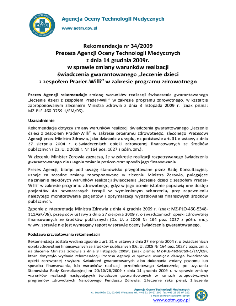 Rekomendacja nr 34/2009 Prezesa Agencji Oceny Technologii