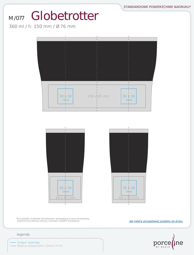 STANDARDOWE POWIERZCHNIE NADRUKU* M/077 Globetrotter 360 ml / h: 150 mm / Ø 76 mm 30 x 30 mm 190 x 45 mm 30 x 30 mm 30 x 30 mm 30 x 30 mm 60 x 45 mm 60 x 45 mm *W przypadku projektów dla kalkomanii wybiegających poza standardową powierzchnię nadruku prosimy o kontakt z działem handlowym. legenda Grawer laserowy Nadruk bezpośredni (Direct Print) Jak należy przygotować projekty do druku