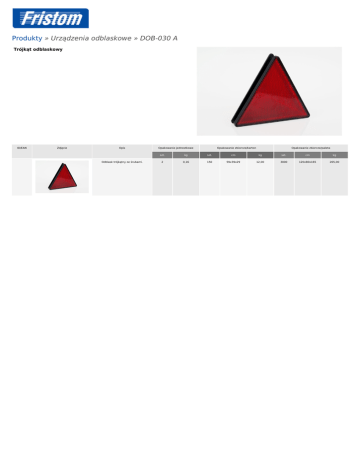 Produkty » Urządzenia odblaskowe » DOB-030 A Trójkąt odblaskowy ID/EAN Zdjęcie Opis Odblask trójkątny ze śrubami. Opakowanie jednostkowe Opakowanie zbiorcze/karton Opakowanie zbiorcze/paleta szt. kg szt. cm kg szt. cm kg 2 0,16 150 59x39x29 12,00 3000 120x80x165 265,00