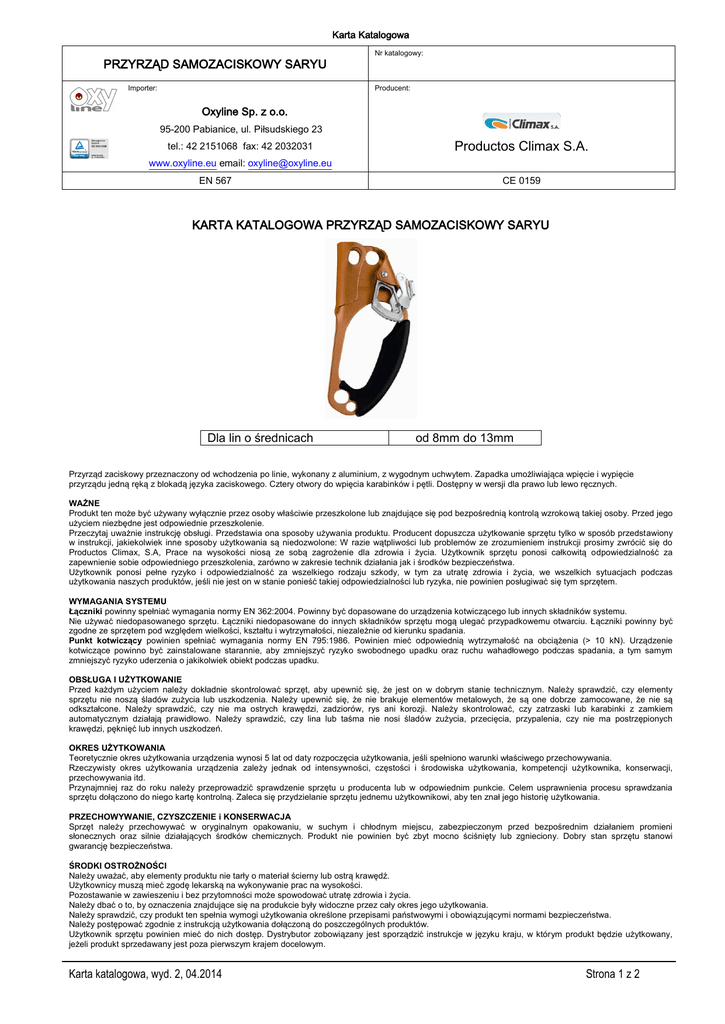 Karta Katalogowa PRZYRZĄD SAMOZACISKOWY SARYU Importer: Nr katalogowy: Producent: ……………………………………….. Oxyline Sp. z o.o. 95-200 Pabianice, ul. Piłsudskiego 23 tel.: 42 2151068 fax: 42 2032031 Productos Climax S.A. www.oxyline.eu email: [email protected] EN 567 CE 0159 KARTA KATALOGOWA PRZYRZĄD SAMOZACISKOWY SARYU Dla lin o średnicach od 8mm do 13mm Przyrząd zaciskowy przeznaczony od wchodzenia po linie, wykonany z aluminium, z wygodnym uchwytem. Zapadka umożliwiająca wpięcie i wypięcie przyrządu jedną ręką z blokadą języka zaciskowego. Cztery otwory do wpięcia karabinków i pętli. Dostępny w wersji dla prawo lub lewo ręcznych. WAŻNE Produkt ten może być używany wyłącznie przez osoby właściwie przeszkolone lub znajdujące się pod bezpośrednią kontrolą wzrokową takiej osoby. Przed jego użyciem niezbędne jest odpowiednie przeszkolenie. Przeczytaj uważnie instrukcję obsługi. Przedstawia ona sposoby używania produktu. Producent dopuszcza użytkowanie sprzętu tylko w sposób przedstawiony w instrukcji, jakiekolwiek inne sposoby użytkowania są niedozwolone: W razie wątpliwości lub problemów ze zrozumieniem instrukcji prosimy zwrócić się do Productos Climax, S.A, Prace na wysokości niosą ze sobą zagrożenie dla zdrowia i życia. Użytkownik sprzętu ponosi całkowitą odpowiedzialność za zapewnienie sobie odpowiedniego przeszkolenia, zarówno w zakresie technik działania jak i środków bezpieczeństwa. Użytkownik ponosi pełne ryzyko i odpowiedzialność za wszelkiego rodzaju szkody, w tym za utratę zdrowia i życia, we wszelkich sytuacjach podczas użytkowania naszych produktów, jeśli nie jest on w stanie ponieść takiej odpowiedzialności lub ryzyka, nie powinien posługiwać się tym sprzętem. WYMAGANIA SYSTEMU Łączniki powinny spełniać wymagania normy EN 362:2004. Powinny być dopasowane do urządzenia kotwiczącego lub innych składników systemu. Nie używać niedopasowanego sprzętu. Łączniki niedopasowane do innych składników sprzętu mogą ulegać przypadkowemu otwarciu. Łączniki powinny być zgodne ze sprzętem pod względem wielkości, kształtu i wytrzymałości, niezależnie od kierunku spadania. Punkt kotwiczący powinien spełniać wymagania normy EN 795:1986. Powinien mieć odpowiednią wytrzymałość na obciążenia (> 10 kN). Urządzenie kotwiczące powinno być zainstalowane starannie, aby zmniejszyć ryzyko swobodnego upadku oraz ruchu wahadłowego podczas spadania, a tym samym zmniejszyć ryzyko uderzenia o jakikolwiek obiekt podczas upadku. OBSŁUGA I UŻYTKOWANIE Przed każdym użyciem należy dokładnie skontrolować sprzęt, aby upewnić się, że jest on w dobrym stanie technicznym. Należy sprawdzić, czy elementy sprzętu nie noszą śladów zużycia lub uszkodzenia. Należy upewnić się, że nie brakuje elementów metalowych, że są one dobrze zamocowane, że nie są odkształcone. Należy sprawdzić, czy nie ma ostrych krawędzi, zadziorów, rys ani korozji. Należy skontrolować, czy zatrzaski lub karabinki z zamkiem automatycznym działają prawidłowo. Należy sprawdzić, czy lina lub taśma nie nosi śladów zużycia, przecięcia, przypalenia, czy nie ma postrzępionych krawędzi, pęknięć lub innych uszkodzeń. OKRES UŻYTKOWANIA Teoretycznie okres użytkowania urządzenia wynosi 5 lat od daty rozpoczęcia użytkowania, jeśli spełniono warunki właściwego przechowywania. Rzeczywisty okres użytkowania urządzenia zależy jednak od intensywności, częstości i środowiska użytkowania, kompetencji użytkownika, konserwacji, przechowywania itd. Przynajmniej raz do roku należy przeprowadzić sprawdzenie sprzętu u producenta lub w odpowiednim punkcie. Celem usprawnienia procesu sprawdzania sprzętu dołączono do niego kartę kontrolną. Zaleca się przydzielanie sprzętu jednemu użytkownikowi, aby ten znał jego historię użytkowania. PRZECHOWYWANIE, CZYSZCZENIE i KONSERWACJA Sprzęt należy przechowywać w oryginalnym opakowaniu, w suchym i chłodnym miejscu, zabezpieczonym przed bezpośrednim działaniem promieni słonecznych oraz silnie działających środków chemicznych. Produkt nie powinien być zbyt mocno ściśnięty lub zgnieciony. Dobry stan sprzętu stanowi gwarancję bezpieczeństwa. ŚRODKI OSTROŻNOŚCI Należy uważać, aby elementy produktu nie tarły o materiał ścierny lub ostrą krawędź. Użytkownicy muszą mieć zgodę lekarską na wykonywanie prac na wysokości. Pozostawanie w zawieszeniu i bez przytomności może spowodować utratę zdrowia i życia. Należy dbać o to, by oznaczenia znajdujące się na produkcie były widoczne przez cały okres jego użytkowania. Należy sprawdzić, czy produkt ten spełnia wymogi użytkowania określone przepisami państwowymi i obowiązującymi normami bezpieczeństwa. Należy postępować zgodnie z instrukcją użytkowania dołączoną do poszczególnych produktów. Użytkownik sprzętu powinien mieć do nich dostęp. Dystrybutor zobowiązany jest sporządzić instrukcje w języku kraju, w którym produkt będzie użytkowany, jeżeli produkt sprzedawany jest poza pierwszym krajem docelowym. Karta katalogowa, wyd. 2, 04.2014 Strona 1 z 2 Tabela kontroli i napraw PRZYRZĄD SAMOZACISKOWY SARYU EN 567 Nazwisko użytkownika: Data zakupu: Data pierwszego użycia: Data produkcji: Numer seryjny: Uwagi: Data przeglądu Karta katalogowa, wyd. 2, 04.2014 Nazwisko osoby dokonującej przeglądu Pieczątka, podpis Strona 2 z 2