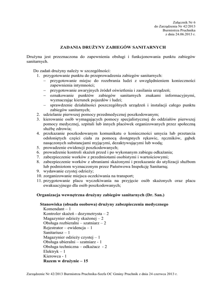 Załącznik Nr 6 do Zarządzenia Nr 42/2013 Burmistrza Pruchnika z dnia 24.06.2013 r. ZADANIA DRUŻYNY ZABIEGÓW SANITARNYCH Drużyna jest przeznaczona do zapewnienia obsługi i funkcjonowania punktu zabiegów sanitarnych. Do zadań drużyny należy w szczególności: 1. przygotowanie punktu do przeprowadzenia zabiegów sanitarnych: przygotowanie miejsc do rozebrania ludzi z uwzględnieniem konieczności zapewnienia intymności; przygotowanie awaryjnych źródeł oświetlenia i zasilania urządzeń; oznakowanie punktów zabiegów sanitarnych znakami informacyjnymi, wyznaczając kierunek pojazdów i ludzi; sprawdzenie działalności poszczególnych urządzeń i instalacji całego punktu zabiegów sanitarnych; 2. udzielanie pierwszej pomocy przedmedycznej poszkodowanym; 3. kierowanie osób wymagających pomocy specjalistycznej do oddziałów pierwszej pomocy medycznej, szpitali lub innych placówek organizowanych przez społeczną służbę zdrowia; 4. przekazanie poszkodowanym komunikatu o konieczności umycia lub przetarcia odsłoniętych części ciała za pomocą dostępnych rękawic, ręczników, gąbek nasączonych substancjami myjącymi, dezaktywującymi lub wodą; 5. prowadzenie ewidencji poszkodowanych; 6. prowadzenie kontroli skażeń przed i po wykonanym zabiegu odkażania; 7. zabezpieczenie worków z przedmiotami osobistymi i wartościowymi; 8. zabezpieczenie worków z ubraniami skażonymi i przekazanie do utylizacji służbom lub podmiotom wyznaczonym przez Państwowa Inspekcję Sanitarną; 9. wydawanie czystej odzieży; 10. zorganizowanie miejsca oczekiwania na transport; 11. przygotowanie placu wyczekiwania na przyjęcie osób skażonych oraz placu ewakuacyjnego dla osób poszkodowanych; Organizacja wewnętrzna drużyny zabiegów sanitarnych (Dr. San.) Stanowiska (obsada osobowa) drużyny zabezpieczenia medycznego Komendant – 1 Kontroler skażeń - dozymetrysta – 2 Magazynier odzieży skażonej – 2 Obsługa rozbieralni – szatniarz – 2 Rejestrator – ewidencja – 1 Sanitariusz – 1 Magazynier odzieży czystej – 1 Obsługa ubieralni – szatniarz - 1 Obsługa techniczna – odkażacz - 2 Elektryk – 1 Kierowca - 1 Razem w drużynie – 15 Zarządzenie Nr 42/2013 Burmistrza Pruchnika-Szefa OC Gminy Pruchnik z dnia 24 czerwca 2013 r.