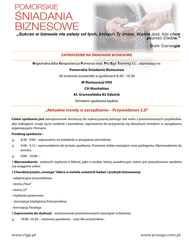 POMORSKIE ŚNIADANIA BIZNESOWE „Sukces w biznesie nie zależy od tych, których Ty znasz. Ważne jest, kto chce poznać Ciebie.” Dale Carnegie ZAPROSZENIE NA ŚNIADANIE BIZNESOWE Regionalna Izba Gospodarcza Pomorza oraz Pro Ego Training S.C. zapraszają na: Pomorskie Śniadanie Biznesowe 26 września (czwartek) w godzinach 8.30 - 10.30 W Restauracji VNS CH Manhattan Al. Grunwaldzka 82 Gdańsk Tematem spotkania będzie: „Aktualne trendy w zarządzaniu – Przywództwo 2.0” Celem spotkania jest zainspirowanie słuchaczy do wykorzystania jednego lub wielu z prezentowanych przykładów, aby wzbogacić swoje życie osobiste i zawodowe, zaproszenie do przyjrzenia się aktualnym trendom w zarządzaniu organizacjami i firmami. Przebieg spotkania : 8.30 - 9.00 – zapraszamy na śniadanie w przyjaznej atmosferze. 9.00 - 9.15 - wprowadzenie do tematu spotkania. Poznanie siebie nawzajem oraz prelegenta. Wprowadzenie do tematu. 9.00 - 10.00 – 1.Wprowadzenie: zmierzch myślenia o liderze, jako o osobie, której zasadniczym celem jest pozyskiwanie zasobów czy osiąganie celów 2.Charakterystyka „nowego” lidera w świetle ostatnich badań i praktyki biznesowej: - adaptacyjne przywództwo - teoria „Flow” - teoria „U” - myślenie systemowe - koncepcja Inteligencji Emocjonalnej - koncepcja Stratega 3.Zaproszenie do dyskusji – zastosowanie prezentowanych rozwiązań w biznesie 10.00 -10.30 – rozmowy panelowe – czas dla uczestników . www.rigp.pl www.proego.com.pl POMORSKIE ŚNIADANIA BIZNESOWE „Sukces w biznesie nie zależy od tych, których Ty znasz. Ważne jest, kto chce poznać Ciebie.” Dale Carnegie INFORMACJE O PRELEGENCIE Jarosław Chybicki Z wykształcenia psycholog. Absolwent Uniwersytetu Gdańskiego, Paryskiej Sorbony oraz wielu kursów prowadzonych w USA, Niemczech czy Rosji. Od dwunastu lat Prezes Zarządu ProFirma sp. z o.o. Wykładał między innymi na: Akademii Leona Koźmińskiego, Politechnice Gdańskiej, SWPS, Uniwersytecie Gdańskim. Certyfikowany instruktor uważności. Współpracownik Dana Carman Integral z USA. Członek - założyciel International Partnership for Assessment and Development. Autor wielu publikacji z zakresu zarządzania i przywództwa, w tym dotyczących zarządzania integralnego, zarządzania przez wartości, psychologii pozytywnej w biznesie, uważności w pracy. Mówca na najważniejszych konferencjach branży HR. Od ponad dwudziestu lat aktywnie działa w branży szkoleniowo – doradczej. Jego praca zarówno menedżerska jak i szkoleniowa jest pod stałą superwizją konsultantów z USA. Propaguje w Polsce nowe idee w zakresie przywództwa, zwłaszcza w zakresie Leadership Development Framework oraz uważności i zarządzania energią menedżerów. Aktywista społeczny, członek dwóch stowarzyszeń koncentrujących się na rozwoju osobistym i zawodowym. Prywatnie pasjonat fotografii. INFORMACJE DODATKOWE Cena uczestnictwa w spotkaniu (wraz ze śniadaniem) wynosi 45 zł. Prosimy o wpłatę i przysłanie potwierdzenia przelewu na adres [email protected] najpóźniej do 24 września 2013 (wtorek) na konto: MERCURY S.C. Zdunowice 18, 83-320 Sulęczyno Restauracja VNS NORDEA BANK POLSKA S.A. 41 1440 1387 0000 0000 1157 092 z dopiskiem Śniadanie Biznesowe 26 września 2013 Jeżeli będziecie Państwo zainteresowani wystawieniem faktury prosimy o podanie w mailu niezbędnych danych. ŚNIADANIA BIZNESOWE - BĄDŹMY ZE SOBĄ W KONTAKCIE!