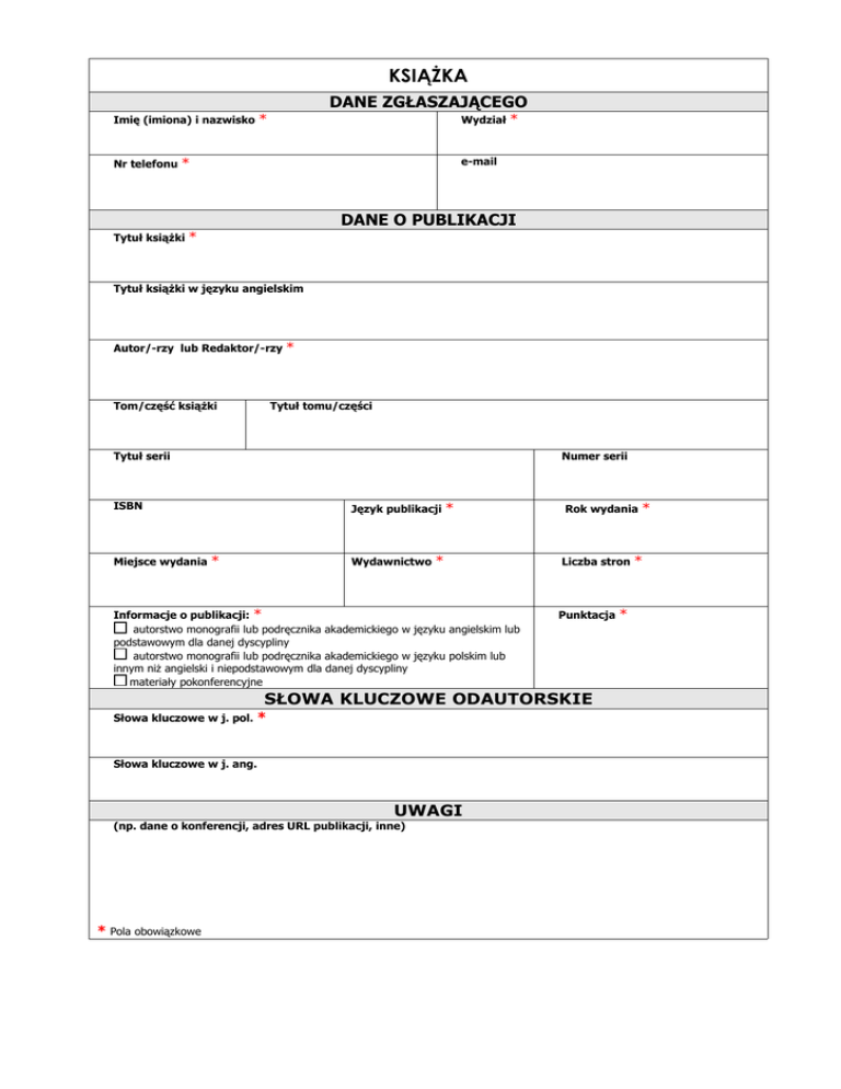 KSIĄŻKA DANE ZGŁASZAJĄCEGO Imię (imiona) i nazwisko * Wydział * e-mail Nr telefonu * DANE O PUBLIKACJI Tytuł książki * Tytuł książki w języku angielskim Autor/-rzy lub Redaktor/-rzy * Tom/część książki Tytuł tomu/części Tytuł serii Numer serii ISBN Język publikacji * Miejsce wydania * Wydawnictwo * Informacje o publikacji: * autorstwo monografii lub podręcznika akademickiego w języku angielskim lub podstawowym dla danej dyscypliny autorstwo monografii lub podręcznika akademickiego w języku polskim lub innym niż angielski i niepodstawowym dla danej dyscypliny materiały pokonferencyjne Rok wydania * Liczba stron Punktacja * SŁOWA KLUCZOWE ODAUTORSKIE Słowa kluczowe w j. pol. * Słowa kluczowe w j. ang. UWAGI (np. dane o konferencji, adres URL publikacji, inne) * Pola obowiązkowe *