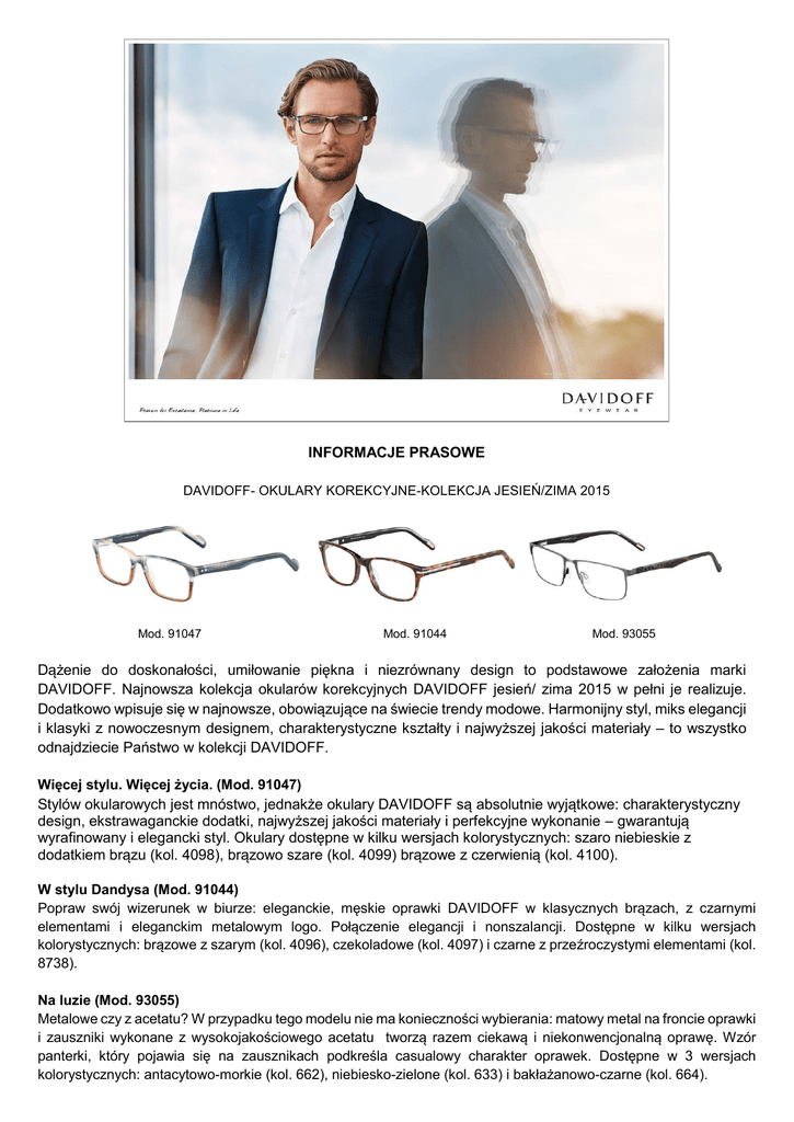 INFORMACJE PRASOWE DAVIDOFF- OKULARY KOREKCYJNE-KOLEKCJA JESIEŃ/ZIMA 2015 Mod. 91047 Mod. 91044 Mod. 93055 Dążenie do doskonałości, umiłowanie piękna i niezrównany design to podstawowe założenia marki DAVIDOFF. Najnowsza kolekcja okularów korekcyjnych DAVIDOFF jesień/ zima 2015 w pełni je realizuje. Dodatkowo wpisuje się w najnowsze, obowiązujące na świecie trendy modowe. Harmonijny styl, miks elegancji i klasyki z nowoczesnym designem, charakterystyczne kształty i najwyższej jakości materiały – to wszystko odnajdziecie Państwo w kolekcji DAVIDOFF. Więcej stylu. Więcej życia. (Mod. 91047) Stylów okularowych jest mnóstwo, jednakże okulary DAVIDOFF są absolutnie wyjątkowe: charakterystyczny design, ekstrawaganckie dodatki, najwyższej jakości materiały i perfekcyjne wykonanie – gwarantują wyrafinowany i elegancki styl. Okulary dostępne w kilku wersjach kolorystycznych: szaro niebieskie z dodatkiem brązu (kol. 4098), brązowo szare (kol. 4099) brązowe z czerwienią (kol. 4100). W stylu Dandysa (Mod. 91044) Popraw swój wizerunek w biurze: eleganckie, męskie oprawki DAVIDOFF w klasycznych brązach, z czarnymi elementami i eleganckim metalowym logo. Połączenie elegancji i nonszalancji. Dostępne w kilku wersjach kolorystycznych: brązowe z szarym (kol. 4096), czekoladowe (kol. 4097) i czarne z przeźroczystymi elementami (kol. 8738). Na luzie (Mod. 93055) Metalowe czy z acetatu? W przypadku tego modelu nie ma konieczności wybierania: matowy metal na froncie oprawki i zauszniki wykonane z wysokojakościowego acetatu tworzą razem ciekawą i niekonwencjonalną oprawę. Wzór panterki, który pojawia się na zausznikach podkreśla casualowy charakter oprawek. Dostępne w 3 wersjach kolorystycznych: antacytowo-morkie (kol. 662), niebiesko-zielone (kol. 633) i bakłażanowo-czarne (kol. 664). Grupa Zino Davidoff: Grupa Zino Davidoff, utworzona w 1980 roku, jest szwajcarską firmą rodzinną, która produkuje ekskluzywne zegarki, pióra i długopisy oraz najwyższej jakości galanterię skórzaną. Produkty Davidoff trafiaja w gusta najbardziej wymagających klientów. Pozostałe produkty, takie jak: perfumy, oprawki korekcyjne, okulary przeciwsłoneczne, koniak i kawa są produkowane i dystrybuowane we współpracy z wiodącymi licencjobiorcami. Marka DAVIDOFF jest wierna swojej filozofii tworzenia najlepszych na świecie produktów, wykonanych z najwyższej jakości materiałów. Oferuje ponadczasową elegancję, wzory inspirowane najnowszymi światowymi trendami, precyzyjne wykonanie, rzetelność i jakość. Krótko mówiąc: filozofię marki DAVIDOFF polegającą na bezkompromisowym dążeniu do doskonałości. Dowiedz się więcej na: www.zinodavidoff.com MENRAD the vision: Menrad the vision - firma rodzinna znajdująca się obecnie w rękach czwartego pokolenia rodziny, zajmuje się sprzedażą oprawek korekcyjnych i okularów przeciwsłonecznych od ponad 100 lat. Firma zarządzana obecnie przez braci Hermana and Eberharda Müller-Menrad, ma swoją siedzibę w Niemczech i zatrudnia ponad 1000 pracowników na całym świecie. Swoje oprawki korekcyjne i okulary przeciwsłoneczne sprzedaje w ponad 100 krajach świata. Główne marki w portfelu firmy Menrad to: MENRAD, DAVIDOFF, JOOP!, JAGUAR i MORGAN. Sieć dystrybucji firmy Menrad the vision obejmuje jedenaście filii firmy w: Niemczech, Austrii, Szwajcarii, Francji, Wielkiej Brytanii/Irlandii, Holandii, Polsce, we Włoszech, Turcji, Chinach i na Bliskim Wschodzie. Sprzedaż w innych krajach realizowana jest przez znajdujący się w Niemczech departament eksportu. Marki BLUEBERRY, GANT, GUESS, HACKETT, ITALIA INDEPENDENT, REVO, SPINE i SUPERDRY dystrybuowane są w wielu krajach w Europie. MENRAD the vision jest jedną z wiodących firm w branży optycznej w Niemczech. www.menrad.com Więcej informacji na temat kolekcji okularów korekcyjnych jesień/zima 2015 można znaleźć na naszej stronie internetowej i w sklepie online: http://www.menrad.de/pl/kolekcja/davidoff/ Kontakt: Menrad Polska Sp.z o. o Transportowców 11, 02-858 Warszawa, Polska Telefon: +48 22 /259 88 80 [email protected]