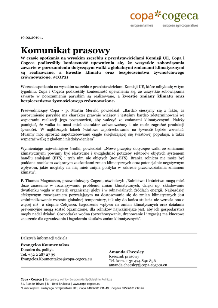 19.02.2016 r. Komunikat prasowy W czasie spotkania na wysokim szczeblu z przedstawicielami Komisji UE, Copa i Cogeca podkreśliły konieczność upewnienia się , że wszystkie zobowiązania zawarte w porozumieniu dotyczącym walki z globalnymi zmianami klimatycznymi są realizowane, a kwestie klimatu oraz bezpieczeństwa żywnościowego zrównoważone. #COP21 W czasie spotkania na wysokim szczeblu z przedstawicielami Komisji UE, które odbyło się w tym tygodniu, Copa i Cogeca podkreśliły konieczność upewnienia się, że wszystkie zobowiązania zawarte w porozumieniu paryskim są realizowane, a kwestie zmiany klimatu oraz bezpieczeństwa żywnościowego zrównoważone. Przewodniczący Copa - p. Martin Merrild powiedział: „Bardzo cieszymy się z faktu, że porozumienie paryskie ma charakter prawnie wiążący i j esteśmy bardzo zdeterminowani we wspieraniu realizacj i j ego postanowień, aby walczyć ze zmianami klimatycznymi. Należy pamiętać, że walka ta musi mieć charakter zrównoważony i nie może zagrażać produkcj i żywności. W naj bliższych latach światowe zapotrzebowanie na żywność będzie wzrastać. Musimy móc sprostać zapotrzebowaniu ciągle zwiększaj ącej się światowej populacj i, a także wspierać walkę z głodem i niedożywieniem”. Wymieniaj ąc naj ważniej sze środki, powiedział: „Nowe przepisy dotyczące walki ze zmianami klimatycznymi powinny być elastyczne i uwzględniać potrzeby sektorów obj ętych systemem handlu emisj ami (ETS) i tych nim nie obj ętych (non-ETS). Branża rolnicza nie może być poddana naciskom związanym ze skutkami zmian klimatycznych oraz potencjalnie negatywnym wpływom, j akie mogłaby na nią mieć unij na polityka w zakresie przeciwdziałania zmianom klimatu”. P. Thomas Magnusson, przewodniczący Cogeca, oświadczył: „Rolnictwo i leśnictwo mogą mieć duże znaczenie w rozwiązywaniu problemu zmian klimatycznych, dzięki np. składowaniu dwutlenku węgla w materii organicznej gleby i w odnawialnych źródłach energii. Naj bardziej efektywnym rozwiązaniem pozwalaj ącym na dostosowanie się do zmian klimatycznych j est zminimalizowanie wzrostu globalnej temperatury, tak aby do końca stulecia nie wzrosła ona o więcej niż 2 stopnie Celsj usza. Łagodzenie wpływu na zmian klimatycznych oraz działania prewencyj ne mogą zostać ograniczone, dla rolników naj ważniej sze j est, aby ich gospodarstwa mogły nadal działać. Gospodarka wodna (przechowywanie, drenowanie i irygacja) ma kluczowe znaczenie dla ograniczania i łagodzenia skutków zmian klimatycznych”. Dalszych informacji udziela: Evangelos Koumentakos Doradca ds. polityk Tel. +32 2 287 27 39 [email protected] Amanda Cheesley Rzecznik prasowy Tel. kom. + 32 474 840 836 [email protected] Copa - Cogeca | Europejscy rolnicy Europejskie Spółdzielnie Rolnicze 61, Rue de Trèves | B - 1040 Bruksela | www.copa-cogeca.eu Numer rejestru służącego przejrzystości UE | Copa 44856881231-49 | Cogeca 09586631237-74 CDP(16)1418:1