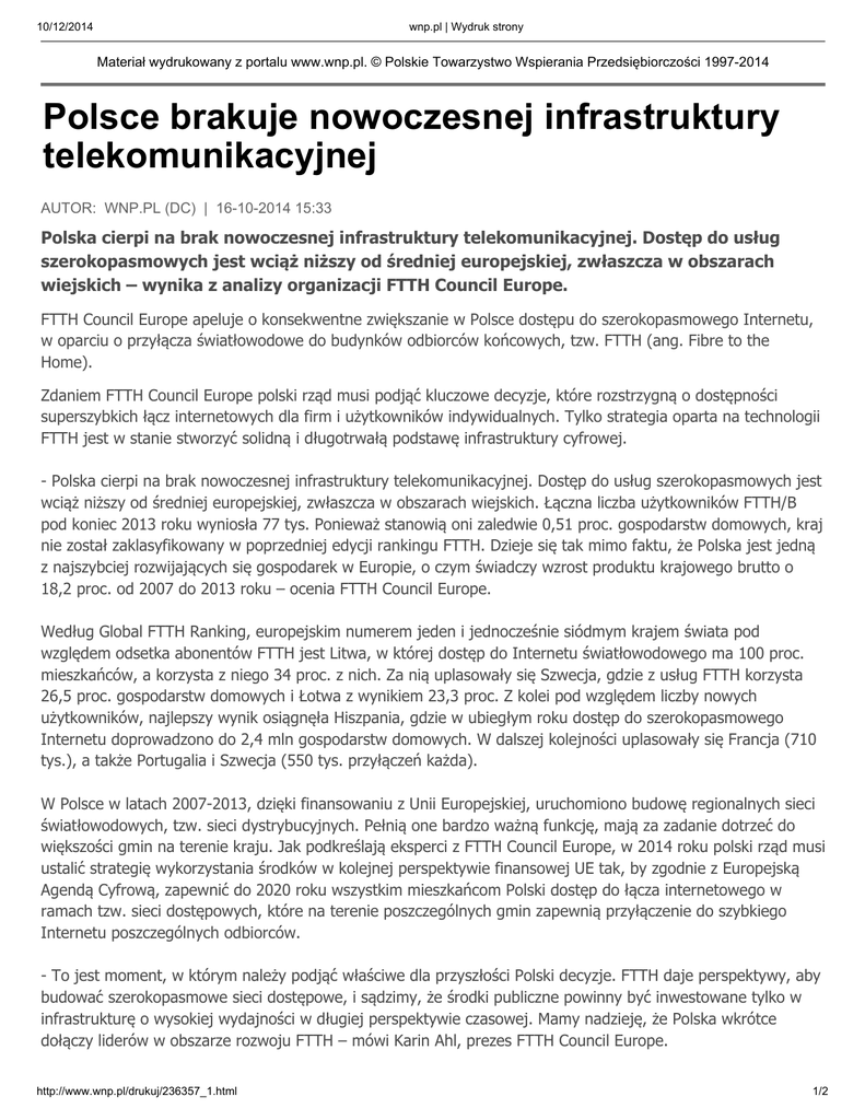 10/12/2014 wnp.pl | Wydruk strony Materiał wydrukowany z portalu www.wnp.pl. © Polskie Towarzystwo Wspierania Przedsiębiorczości 19972014 Polsce brakuje nowoczesnej infrastruktury telekomunikacyjnej AUTOR: WNP.PL (DC) | 16102014 15:33 Polska cierpi na brak nowoczesnej infrastruktury telekomunikacyjnej. Dostęp do usług szerokopasmowych jest wciąż niższy od średniej europejskiej, zwłaszcza w obszarach wiejskich – wynika z analizy organizacji FTTH Council Europe. FTTH Council Europe apeluje o konsekwentne zwiększanie w Polsce dostępu do szerokopasmowego Internetu, w oparciu o przyłącza światłowodowe do budynków odbiorców końcowych, tzw. FTTH (ang. Fibre to the Home). Zdaniem FTTH Council Europe polski rząd musi podjąć kluczowe decyzje, które rozstrzygną o dostępności superszybkich łącz internetowych dla firm i użytkowników indywidualnych. Tylko strategia oparta na technologii FTTH jest w stanie stworzyć solidną i długotrwałą podstawę infrastruktury cyfrowej. Polska cierpi na brak nowoczesnej infrastruktury telekomunikacyjnej. Dostęp do usług szerokopasmowych jest wciąż niższy od średniej europejskiej, zwłaszcza w obszarach wiejskich. Łączna liczba użytkowników FTTH/B pod koniec 2013 roku wyniosła 77 tys. Ponieważ stanowią oni zaledwie 0,51 proc. gospodarstw domowych, kraj nie został zaklasyfikowany w poprzedniej edycji rankingu FTTH. Dzieje się tak mimo faktu, że Polska jest jedną z najszybciej rozwijających się gospodarek w Europie, o czym świadczy wzrost produktu krajowego brutto o 18,2 proc. od 2007 do 2013 roku – ocenia FTTH Council Europe. Według Global FTTH Ranking, europejskim numerem jeden i jednocześnie siódmym krajem świata pod względem odsetka abonentów FTTH jest Litwa, w której dostęp do Internetu światłowodowego ma 100 proc. mieszkańców, a korzysta z niego 34 proc. z nich. Za nią uplasowały się Szwecja, gdzie z usług FTTH korzysta 26,5 proc. gospodarstw domowych i Łotwa z wynikiem 23,3 proc. Z kolei pod względem liczby nowych użytkowników, najlepszy wynik osiągnęła Hiszpania, gdzie w ubiegłym roku dostęp do szerokopasmowego Internetu doprowadzono do 2,4 mln gospodarstw domowych. W dalszej kolejności uplasowały się Francja (710 tys.), a także Portugalia i Szwecja (550 tys. przyłączeń każda). W Polsce w latach 20072013, dzięki finansowaniu z Unii Europejskiej, uruchomiono budowę regionalnych sieci światłowodowych, tzw. sieci dystrybucyjnych. Pełnią one bardzo ważną funkcję, mają za zadanie dotrzeć do większości gmin na terenie kraju. Jak podkreślają eksperci z FTTH Council Europe, w 2014 roku polski rząd musi ustalić strategię wykorzystania środków w kolejnej perspektywie finansowej UE tak, by zgodnie z Europejską Agendą Cyfrową, zapewnić do 2020 roku wszystkim mieszkańcom Polski dostęp do łącza internetowego w ramach tzw. sieci dostępowych, które na terenie poszczególnych gmin zapewnią przyłączenie do szybkiego Internetu poszczególnych odbiorców. To jest moment, w którym należy podjąć właściwe dla przyszłości Polski decyzje. FTTH daje perspektywy, aby budować szerokopasmowe sieci dostępowe, i sądzimy, że środki publiczne powinny być inwestowane tylko w infrastrukturę o wysokiej wydajności w długiej perspektywie czasowej. Mamy nadzieję, że Polska wkrótce dołączy liderów w obszarze rozwoju FTTH – mówi Karin Ahl, prezes FTTH Council Europe. http://www.wnp.pl/drukuj/236357_1.html 1/2 10/12/2014 wnp.pl | Wydruk strony FTTH Council Europe to organizacja branżowa, której misją jest popularyzacja bardzo szybkich światłowodowych sieci dostępowych dla firm i użytkowników indywidualnych. Organizacja promuje tę technologię, ponieważ przyczynia się ona do powstawania nowych usług, które poprawiaj jakość życia, przyczyniając się do ochrony środowiska oraz zwiększania konkurencyjności ekonomicznej. Do FTTH Council Europe należy ponad 150 firm członkowskich. Materiał wydrukowany z portalu www.wnp.pl. © Polskie Towarzystwo Wspierania Przedsiębiorczości 19972014 http://www.wnp.pl/drukuj/236357_1.html 2/2