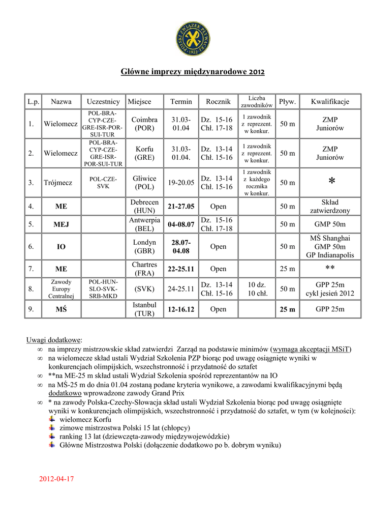 Główne imprezy międzynarodowe 2012 L.p. Nazwa 1. Wielomecz 2. Wielomecz 3. Trójmecz 4. ME 5. MEJ 6. IO 7. ME 8. Zawody Europy Centralnej 9. MŚ Uczestnicy POL-BRACYP-CZEGRE-ISR-PORSUI-TUR POL-BRACYP-CZEGRE-ISRPOR-SUI-TUR POL-CZESVK Termin Rocznik Liczba zawodników Pływ. Kwalifikacje Coimbra (POR) 31.0301.04 Dz. 15-16 Chł. 17-18 1 zawodnik z reprezent. w konkur. 50 m ZMP Juniorów Korfu (GRE) 31.0301.04. Dz. 13-14 Chł. 15-16 1 zawodnik z reprezent. w konkur. 50 m ZMP Juniorów Dz. 13-14 19-20.05 Chł. 15-16 1 zawodnik z każdego rocznika w konkur. 50 m * Miejsce Gliwice (POL) Debrecen (HUN) Antwerpia (BEL) POL-HUNSLO-SVKSRB-MKD 21-27.05 Open 50 m Skład zatwierdzony 04-08.07 Dz. 15-16 Chł. 17-18 50 m GMP 50m Londyn (GBR) 28.0704.08 Open 50 m MŚ Shanghai GMP 50m GP Indianapolis Chartres (FRA) 22-25.11 Open 25 m ** (SVK) 24-25.11 Dz. 13-14 Chł. 15-16 50 m GPP 25m cykl jesień 2012 Istanbul (TUR) 12-16.12 Open 25 m GPP 25m 10 dz. 10 chł. Uwagi dodatkowe: • na imprezy mistrzowskie skład zatwierdzi Zarząd na podstawie minimów (wymaga akceptacji MSiT) • na wielomecze skład ustali Wydział Szkolenia PZP biorąc pod uwagę osiągnięte wyniki w konkurencjach olimpijskich, wszechstronność i przydatność do sztafet • **na ME-25 m skład ustali Wydział Szkolenia spośród reprezentantów na IO • na MŚ-25 m do dnia 01.04 zostaną podane kryteria wynikowe, a zawodami kwalifikacyjnymi będą dodatkowo wprowadzone zawody Grand Prix • * na zawody Polska-Czechy-Słowacja skład ustali Wydział Szkolenia biorąc pod uwagę osiągnięte wyniki w konkurencjach olimpijskich, wszechstronność i przydatność do sztafet, w tym (w kolejności): wielomecz Korfu zimowe mistrzostwa Polski 15 lat (chłopcy) ranking 13 lat (dziewczęta-zawody międzywojewódzkie) Główne Mistrzostwa Polski (dołączenie dodatkowo po b. dobrym wyniku) 2012-04-17