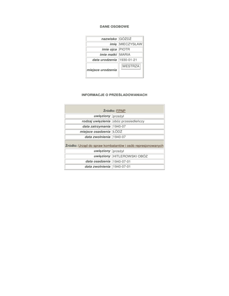 DANE OSOBOWE nazwisko GÓŹDŹ imię MIECZYSŁAW imie ojca