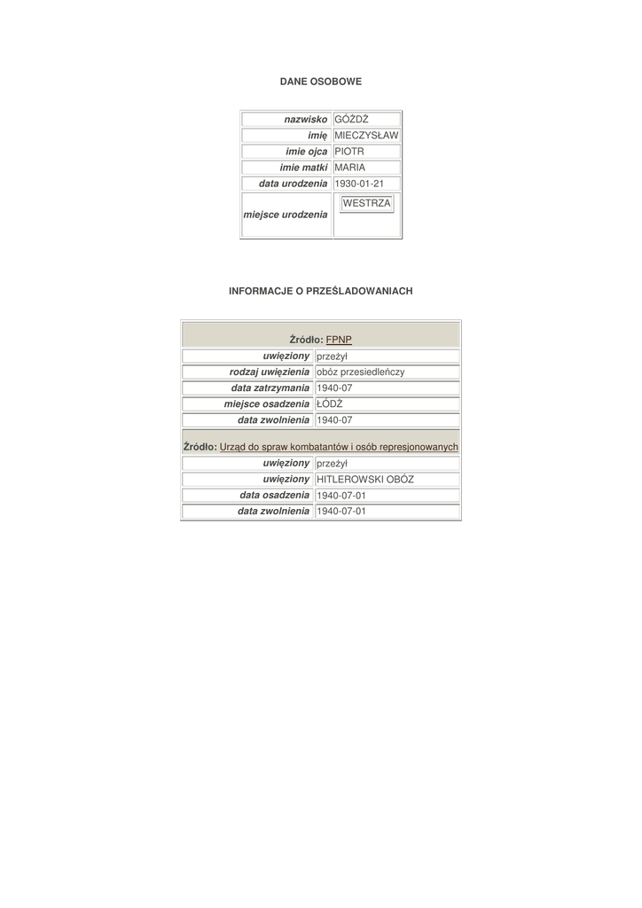 DANE OSOBOWE nazwisko GÓŹDŹ imię MIECZYSŁAW imie ojca PIOTR imie matki MARIA data urodzenia 1930-01-21 WESTRZA miejsce urodzenia INFORMACJE O PRZEŚLADOWANIACH Źródło: FPNP uwięziony przeżył rodzaj uwięzienia obóz przesiedleńczy data zatrzymania 1940-07 miejsce osadzenia ŁÓDŹ data zwolnienia 1940-07 Źródło: Urząd do spraw kombatantów i osób represjonowanych uwięziony przeżył uwięziony HITLEROWSKI OBÓZ data osadzenia 1940-07-01 data zwolnienia 1940-07-01