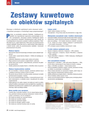 Wózki Zestawy kuwetowe do obiektów szpitalnych Dlaczego w obiektach szpitalnych warto stosować wózki z kuwetami pracujące w technologii mopa preparowanego? P oniżej, na przykładzie zestawów Mobilette Healthguard postarałem się wypunktować argumenty przemawiające za takim rozwiązaniem. Koncepcja systemu Healthguard oparta jest na najnowszych metodach impregnacyjnych jakie stosuje się w profesjonalnym utrzymaniu czystości w sektorze szpitalnym. Mobileta dzieli się na „część higieniczną”, która służy do przechowywania czystych nakładek i ściereczek oraz na „część brudną”, która składa się z dwóch komór: jedna do przechowywania nakładek i ściereczek przeznaczonych do prania. Większa higiena • • • • • • Niemożność skażenia krzyżowego zmniejsza ryzyko zakażeń szpitalnych Czysta woda i czysta tkanina (Rasant + Polifix) do każdego pomieszczenia, Całkowite oddzielenie czystej części wózka od brudnej Mopy przewozi się do prania w pojemnikach z pokrywą Wózek łatwo jest oczyścić i zdezynfekować, ponieważ ma gładkie powierzchnie Gładka poliestrowa przędza tkanin z mikrofibry łatwo się pierze Lżejsze wózki • • Maksymalna oszczędność wody i środków chemicznych • • • • • • Nie ma kontaktu z mokrymi mopami, ponieważ podnosi się je z podłogi za pomocą czystych kuwet na mopy Nie płucze się już ścierek w brudnej wodzie, ponieważ na każde pomieszczenie przypada 1 ścierka Nie ma już bezpośredniego kontaktu z nierozcieńczonymi środkami czyszczącymi, w zasadzie używa się gotowych do użytku mopów/ścierek Dzięki gotowym do użytku mopom nie trzeba już wozić na wózku żadnych środków czyszczących (unika się dzięki temu wypadków na oddziałach psychiatrycznych i pediatrycznych, gdzie pacjenci mogą niechcący napić się takiego środka) Dozowanie środków chemicznych tylko do otrzymania 6 litrów roztworu Dotychczas, środki chemiczne dozowano następująco: 15 litrów płynu do podłogi + 4x4 środek chemiczny (roztwór wymieniano na świeży po umyciu każdych kolejnych 4 pomieszczeń!) + 4x4 środek uniwersalny = 47 litrów 87% mniejsze zużycie środków chemicznych i wody O wiele większa wydajność pracy • • • Rasant 2-etapowo, Kentucky 2-etapowo = 30% szybciej Rasant tradycyjny 2-etapowo, Rasant Mikrofibra 1-etapowo = 40% szybciej Rasant Mikrofibra 1-etapowo + Polifix tradycyjny, Healthguard = 10–15% szybciej Inne oszczędności kosztów • • • Większe bezpieczeństwo osobiste • Ciężar wózka mniejszy niż 20 kg Oszczędność: 19 kg mniej wody do przewożenia w ciągu dnia • • • • Mopy/ścierki z mikrofibry > 500 cykli prania (Rasantec > 700), innymi słowy wytrzymują 25 razy dłużej niż ścierki z wiskozy Mopy z mikrofibry są lżejsze = niższe koszty prania Mniej przypadków kradzieży mopów i ścierek, ponieważ nie leżą na widoku, są zamknięte w szufladkach Mniej energii potrzeba na wysuszenie mopów, jeżeli mopy zostają nasączane bezpośrednio podczas prania Gładka poliestrowa przędza tkanin z mikrofibry łatwiej się pierze Okres trwałości wózka wynosi 15 lat Lepsze warunki bezpieczeństwa i higieny pracy zmniejszą absencję personelu sprzątającego Jacek Szostak, Ecolab Mniej wysiłku przy sprzątaniu • • • • • • Trzonek typu Z pozwala uzyskać o 10 cm więcej lepszą ergonomię, ponieważ ramiona są szerzej rozstawione i można nimi poruszać w promieniu o 10 cm mniejszym Nie trzeba już płukać ani wyżymać ścierek Nie trzeba już wyciskać mopów Nie trzeba już zamaczać mopów Nie trzeba już dźwigać ciężkich wiader Nie trzeba już zmieniać brudnej wody na czystą 28 Nr 3/2008 www.firmasprzatajaca.pl PBT3H „duża” model podstawowy 55 cm, 3 rynienki, 3 niebieskie szuflady, przyczepka (składana), zespół ramy nośnej 2 x 70 l, wiadro 6 l (niebieskie, żółte, czerwone) PBT4H „mała” model podstawowy 55 cm, 1 rynienka, 3 niebieskie szuflady, zespół ramy nośnej 2 x 70 l, Wiadro 6 l (niebieskie, czerwone) Prezentacje Odkurzacze Firma Lavorwash jest jednym z największych producentów sprzętu czyszczącego na świecie. Generalnym importerem maszyn Lavora PRO na rynku polskim jest firma Precyzja-BIT. F irma Lavorwash posiada długoletnie tradycje związane z produkcja odkurza- czy profesjonalnych jak również przemysłowych. W odkurzaczach profesjonalnych zastosowano profesjonalne turbiny ssące. To właśnie zastosowanie dwuwentylatorowych turbin powoduje, że odkurzacze te mogą pracować w trybie ciągłym. Odkurzacze profesjonalne można podzielić na trzy niezależne grupy: – odkurzacze tylko na sucho – odkurzacze na sucho i mokro – odkurzacze piorące, ekstrakcyjne. Wiodącym produktem z pierwszej grupy odkurzacze Lavora PRO jest odkurzacz Sahara. Jest to najtańsza wersja profesjonalnego odkurzacze do pracy tylko na sucho. Odkurzacz ten jest rozwiązaniem dla firm sprzątających, hoteli, szkół tam gdzie nie jest wymagana cisza pracy. Filtr typu cartridge w standardzie sprawia że odkurzacz może pracować z workami lub bez. Zalecane jest korzystanie z worków papierowych wydłuża żywotność turbiny oraz poprawia filtrację. Obudowa posiada specjalne miejsce na akcesoria co pomaga w wygodnym przechowywaniu rur. Przewód zasilania 10 mb pozwala na sprzątanie dużych powierzchni bez zmiany źródła zasilania. Koszt tego odkurzacza 420 zł/netto. Drugim odkurzaczem przewidzianym do pracy na sucho jest Whisper V8. Jest to jeden z nie licznych odkurzaczy dostępnych na rynku o bardzo niskim poziomie hałasu <55 dB. Odporny na uderzenia zbiornik, bardzo lekki i szybki w opróżnianiu sprawia, że odkurzacz jest bardzo łatwy w obsłudze. Odkurzacz posiada specjalne filtr wygłuszające dzięki któremu można pracować w czasie dnia w miejscach w których wymagana jest cisza. System potrójnej filtracji wydłuża żywotność turbiny. Odkurzacz posiada filtr typu cartridg