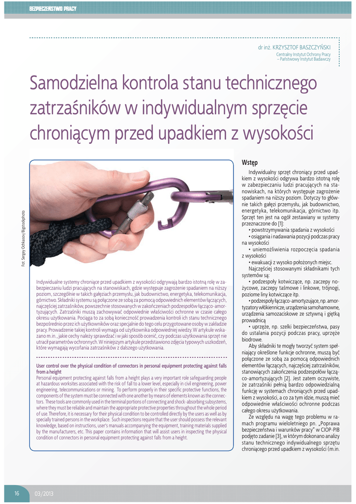 dr in¿. KRZYSZTOF BASZCZYÑSKI Centralny Instytut Ochrony Pracy – Pañstwowy Instytut Badawczy Samodzielna kontrola stanu technicznego zatrzaļników w indywidualnym sprzêcie chroni¹cym przed upadkiem z wysokoļci Fot. Sergey Ochkasov/Bigstockphoto Wstêp Indywidualne systemy chroni¹ce przed upadkiem z wysokoļci odgrywaj¹ bardzo istotn¹ rolê w zabezpieczaniu ludzi pracuj¹cych na stanowiskach, gdzie wystêpuje zagro¿enie spadaniem na ni¿szy poziom, szczególnie w takich ga³êziach przemys³u, jak budownictwo, energetyka, telekomunikacja, górnictwo. Sk³adniki systemu s¹ po³¹czone ze sob¹ za pomoc¹ odpowiednich elementów ³¹cz¹cych, najczêļciej zatrzaļników, powszechnie stosowanych w zakoñczeniach podzespo³ów ³¹cz¹co-amortyzuj¹cych. Zatrzaļniki musz¹ zachowywaæ odpowiednie w³aļciwoļci ochronne w czasie ca³ego okresu u¿ytkowania. Poci¹ga to za sob¹ koniecznoļæ prowadzenia kontroli ich stanu technicznego bezpoļrednio przez ich u¿ytkowników oraz specjalnie do tego celu przygotowane osoby w zak³adzie pracy. Prowadzenie takiej kontroli wymaga od u¿ytkownika odpowiedniej wiedzy. W artykule wskazano m.in., jakie cechy nale¿y sprawdzaæ i w jaki sposób oceniæ, czy podczas u¿ytkowania sprzêt nie utraci³ parametrów ochronnych. W niniejszym artykule przedstawiono zdjêcia typowych uszkodzeñ, które wymagaj¹ wycofania zatrzaļników z dalszego u¿ytkowania. User control over the physical condition of connectors in personal equipment protecting against falls from a height Personal equipment protecting against falls from a height plays a very important role safeguarding people at hazardous worksites associated with the risk of fall to a lower level, especially in civil engineering, power engineering, telecommunications or mining. To perform properly in their specific protective functions, the components of the system must be connected with one another by means of elements known as the connectors. These tools are commonly used in the terminal portions of connecting and shock-absorbing subsystems, where they must be reliable and maintain the appropriate protective properties throughout the whole period of use. Therefore, it is necessary for their physical condition to be controlled directly by the users as well as by specially trained persons in the workplace. Such inspections require that the user should possess the relevant knowledge, based on instructions, user’s manuals accompanying the equipment, training materials supplied by the manufacturers, etc. This paper contains information that will assist users in inspecting the physical condition of connectors in personal equipment protecting against falls from a height. 16 03/2013 Indywidualny sprzêt chroni¹cy przed upadkiem z wysokoļci odgrywa bardzo istotn¹ rolê w zabezpieczaniu ludzi pracuj¹cych na stanowiskach, na których wystêpuje zagro¿enie spadaniem na ni¿szy poziom. Dotyczy to g³ównie takich ga³êzi przemys³u, jak budownictwo, energetyka, telekomunikacja, górnictwo itp. Sprzêt ten jest na ogó³ zestawiany w systemy przeznaczone do [1]: • powstrzymywania spadania z wysokoļci • osi¹gania i nadawania pozycji podczas pracy na wysokoļci • uniemo¿liwienia rozpoczêcia spadania z wysokoļci • ewakuacji z wysoko po³o¿onych miejsc. Najczêļciej stosowanymi sk³adnikami tych systemów s¹: • podzespo³y kotwicz¹ce, np. zaczepy no¿ycowe, zaczepy taļmowe i linkowe, trójnogi, poziome liny kotwicz¹ce itp. • podzespo³y ³¹cz¹co-amortyzuj¹ce, np. amortyzatory w³ókiennicze, urz¹dzenia samohamowne, urz¹dzenia samozaciskowe ze sztywn¹ i giêtk¹ prowadnic¹ • uprzê¿e, np. szelki bezpieczeñstwa, pasy do ustalania pozycji podczas pracy, uprzê¿e biodrowe. Aby sk³adniki te mog³y tworzyæ system spe³niaj¹cy okreļlone funkcje ochronne, musz¹ byæ po³¹czone ze sob¹ za pomoc¹ odpowiednich elementów ³¹cz¹cych, najczêļciej zatrzaļników, stanowi¹cych zakoñczenia podzespo³ów ³¹cz¹co-amortyzuj¹cych [2]. Jest zatem oczywiste, ¿e zatrzaļniki pe³ni¹ bardzo odpowiedzialn¹ funkcjê w systemach chroni¹cych przed upadkiem z wysokoļci, a co za tym idzie, musz¹ mieæ odpowiednie w³aļciwoļci ochronne podczas ca³ego okresu u¿ytkowania. Ze wzglêdu na wagê tego problemu w ramach programu wieloletniego pn. „Poprawa bezpieczeñstwa i warunków pracy” w CIOP-PIB podjêto zadanie [3], w którym dokonano analizy stanu technicznego indywidualnego sprzêtu chroni¹cego przed upadkiem z wysokoļci (m.in. ŒRODKI OCHRONY INDYWIDUALNEJ zatrzaļników), wyprodukowanego i u¿ytkowanego w latach 1992-2003. W artykule opisano wyniki tej analizy oraz sposób przeprowadzenia samodzielnej kontroli stanu technicznego zatrzaļników w indywidualnym sprzêcie chroni¹cym przed upadkiem z wysokoļci. Warunki bezpiecznego u¿ytkowania zatrzaļników Badany sprzêt by³ u¿ytkowany w budownictwie, energetyce i telekomunikacji. Wycofano go z u¿ytkowania na skutek up³ywu okresu, w którym producent gwarantuje zachowanie w³aļciwoļci ochronnych lub z powodu wyst¹pienia dyskwalifikuj¹cych uszkodzeñ. Wļród ocenianego sprzêtu znajowa³a siê równie¿ du¿a grupa zatrzaļników stanowi¹cych zakoñczenia linek bezpieczeñstwa, linek do ustalania pozycji, amortyzatorów w³ókienniczych oraz prowadnic urz¹dzeñ samozaciskowych. Pomimo ¿e elementy zatrzaļników s¹ najczêļciej wykonywane ze stali z pow³ok¹ antykorozyjn¹, stali nierdzewnych lub stopów aluminium, to ju¿ w wyniku oceny wzrokowej zidentyfikowano szereg zmian, które potencjalnie mog¹ byæ zwi¹zane z utrat¹ w³aļciwoļci ochronnych. Do najczêļciej wystêpuj¹cych uszkodzeñ nale¿a³y: korozja, deformacje, ubytki, pêkniêcia oraz zanieczyszczenia. Zaobserwowane uszkodzenia wskazywa³y, ¿e w niektórych przypadkach u¿ytkowano sprzêt, który nie gwarantowa³ bezpieczeñstwa ich u¿ytkownikom. Odpowiedni poziom parametrów ochronnych nowych zatrzaļników jest gwarantowany