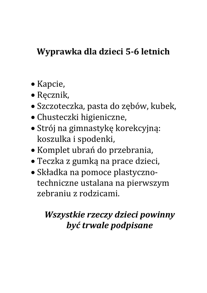 Wyprawka dla dzieci 5-6 letnich · Kapcie, · Ręcznik, · Szczoteczka, pasta do zębów, kubek, · Chusteczki higieniczne, · Strój na gimnastykę korekcyjną: koszulka i spodenki, · Komplet ubrań do przebrania, · Teczka z gumką na prace dzieci, · Składka na pomoce plastycznotechniczne ustalana na pierwszym zebraniu z rodzicami. Wszystkie rzeczy dzieci powinny być trwale podpisane
