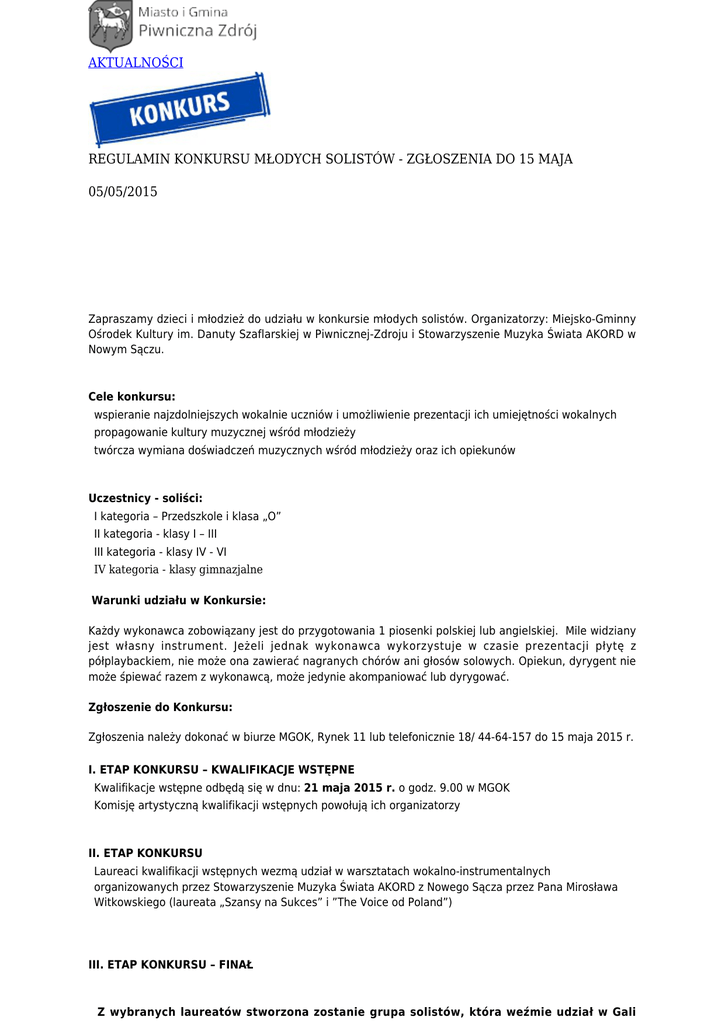 AKTUALNOŚCI REGULAMIN KONKURSU MŁODYCH SOLISTÓW - ZGŁOSZENIA DO 15 MAJA 05/05/2015 Zapraszamy dzieci i młodzież do udziału w konkursie młodych solistów. Organizatorzy: Miejsko-Gminny Ośrodek Kultury im. Danuty Szaflarskiej w Piwnicznej-Zdroju i Stowarzyszenie Muzyka Świata AKORD w Nowym Sączu. Cele konkursu: wspieranie najzdolniejszych wokalnie uczniów i umożliwienie prezentacji ich umiejętności wokalnych propagowanie kultury muzycznej wśród młodzieży twórcza wymiana doświadczeń muzycznych wśród młodzieży oraz ich opiekunów Uczestnicy - soliści: I kategoria – Przedszkole i klasa „O” II kategoria - klasy I – III III kategoria - klasy IV - VI IV kategoria - klasy gimnazjalne Warunki udziału w Konkursie: Każdy wykonawca zobowiązany jest do przygotowania 1 piosenki polskiej lub angielskiej. Mile widziany jest własny instrument. Jeżeli jednak wykonawca wykorzystuje w czasie prezentacji płytę z półplaybackiem, nie może ona zawierać nagranych chórów ani głosów solowych. Opiekun, dyrygent nie może śpiewać razem z wykonawcą, może jedynie akompaniować lub dyrygować. Zgłoszenie do Konkursu: Zgłoszenia należy dokonać w biurze MGOK, Rynek 11 lub telefonicznie 18/ 44-64-157 do 15 maja 2015 r. I. ETAP KONKURSU – KWALIFIKACJE WSTĘPNE Kwalifikacje wstępne odbędą się w dnu: 21 maja 2015 r. o godz. 9.00 w MGOK Komisję artystyczną kwalifikacji wstępnych powołują ich organizatorzy II. ETAP KONKURSU Laureaci kwalifikacji wstępnych wezmą udział w warsztatach wokalno-instrumentalnych organizowanych przez Stowarzyszenie Muzyka Świata AKORD z Nowego Sącza przez Pana Mirosława Witkowskiego (laureata „Szansy na Sukces” i ”The Voice od Poland”) III. ETAP KONKURSU – FINAŁ Z wybranych laureatów stworzona zostanie grupa solistów, która weźmie udział w Gali „Mozart kontra Sinatra” podczas „Dni Piwnicznej” 25 lipca 2015 r. Kryteria oceny i nagrody: Jury oceniać będzie walory głosowe, dobór repertuaru (repertuar powinien być dostosowany do wieku i możliwości wokalnych solisty, należy zwrócić uwagę na zrozumienie tekstu i świadomą jego interpretację), muzykalność, własną interpretację piosenki, indywidualność artystyczną. W poszczególnych kategoriach wiekowych zostaną przyznane nagrody rzeczowe za I-V miejsca.