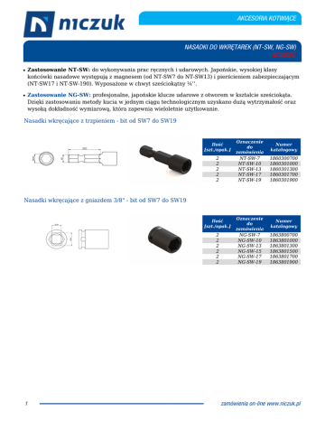 AKCESORIA KOTWIĄCE NASADKI DO WKRĘTAREK (NT-SW, NG-SW) NOWOŚĆ ● ● Zastosowanie NT-SW: do wykonywania prac ręcznych i udarowych. Japońskie, wysokiej klasy końcówki nasadowe występują z magnesem (od NT-SW7 do NT-SW13) i pierścieniem zabezpieczającym (NT-SW17 i NT-SW-190). Wyposażone w chwyt sześciokątny ¼’’. Zastosowanie NG-SW: profesjonalne, japońskie klucze udarowe z otworem w kształcie sześciokąta. Dzięki zastosowaniu metody kucia w jednym ciągu technologicznym uzyskano dużą wytrzymałość oraz wysoką dokładność wymiarową, która zapewnia wieloletnie użytkowanie. Nasadki wkręcające z trzpieniem - bit od SW7 do SW19 Ilość [szt./opak.] 2 2 2 2 2 Oznaczenie do zamówienia NT-SW-7 NT-SW-10 NT-SW-13 NT-SW-17 NT-SW-19 Numer katalogowy 1860300700 1860301000 1860301300 1860301700 1860301900 Nasadki wkręcające z gniazdem 3/8" - bit od SW7 do SW19 Ilość [szt./opak.] 2 2 2 2 2 2 1 Oznaczenie do zamówienia NG-SW-7 NG-SW-10 NG-SW-13 NG-SW-15 NG-SW-17 NG-SW-19 Numer katalogowy 1863800700 1863801000 1863801300 1863801500 1863801700 1863801900 zamówienia on-line www.niczuk.pl