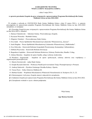ZARZĄDZENIE NR 45/2016 WÓJTA GMINY MAŁKINIA GÓRNA z dnia 5 maja 2016 r. w sprawie powołania Zespołu do prac związanych z opracowaniem Programu Rewitalizacji dla Gminy Małkinia Górna na lata 2016-2022 W związku z uchwałą nr 128/XXI/2016 Rady Gminy Małkinia Górna z dnia 23 marca 2016 r. w sprawie przystąpienia do opracowania projektu Programu Rewitalizacji dla Gminy Małkinia Górna na lata 2016-2022 zarządzam, co następuje: § 1. Powołuję Zespół do prac związanych z opracowaniem Programu Rewitalizacji dla Gminy Małkinia Górna na lata 2016-2022 w składzie: 1. Dariusz Chmielewski – Sekretarz Gminy- Przewodniczący Zespołu. 2. Krystyna Wetoszka - Skarbnik Gminy. 3. Zbigniew Nietubyć – Przewodniczący Rady Gminy. 4. Ewa Janik – Prezes Spółdzielni Mieszkaniowej Lokatorsko Własnościowej „Zacisze”. 5. Jacek Bogdan – Prezes Spółdzielni Mieszkaniowej Lokatorsko Własnościowej „Małkinianka”. 6. Ewa Orłowska – Kierownik Referatu Gospodarki Przestrzennej, Komunalnej i Infrastruktury. 7. Elżbieta Przywoźna – Kierownik Referatu Inwestycji. 8. Bogusława Łupińska – Kierownik Referatu Rolnictwa, Ochrony Środowiska, Handlu i Usług. 9. Aldona Sikorska – Inspektor do spraw handlu, usług i ochrony środowiska. 10. Wiesława Augustyniak – Inspektor do spraw społecznych, ochrony zdrowia oraz współpracy z organizacjami pozarządowymi. 11. Marcin Zawistowski – radny Rady Gminy. 12. Ksiądz Ryszard Zalewski – Proboszcz Parafii pod wezwaniem Trójcy Przenajświętszej w Prostyni. 13. Andrzej Sadowski – Dyrektor Gminnego Ośrodka Kultury i Sportu. 14. Teresa Pecio – Sołtys Sołectwa Małkinia III. 15. Barbara Pyskło – Wspólnota Mieszkaniowa Właścicieli Nieruchomości ul. Kolejowa 20, 21, 22. § 2. Harmonogram i tryb pracy Zespołu stanowi załącznik do zarządzenia. § 3. Zadaniem Zespołu jest opracowanie Programu Rewitalizacji dla Gminy Małkinia Górna na lata 2016-2022. § 4. Zarządzenie wchodzi w życie z dniem podpisania. Wójt Gminy mgr Bożena Kordek Id: A35A0DD6-03F4-4046-8F2E-B5C842424625. Podpisany Strona 1 Załącznik do Zarządzenia Nr 45/2016 Wójta Gminy Małkinia Górna z dnia 5 maja 2016 r. Tryb i harmonogram pracZespołu do prac związanych z opracowaniem Programu Rewitalizacji dla Gminy Małkinia Górna na lata 2016-2022. Działanie 1. Powołanie zespołu do prac związanych z opracowaniem Programu Rewitalizacji dla Gminy Małkinia Górna na lata 2016-2022 2. Ogłoszenia w mediach lokalnych – otwierające prace nad Programem Rewitalizacji dla Gminy Małkinia Górna na lata 2016-2022 4. Utworzenie zakładki na stronie internetowej UG Małkinia Górna dotyczącej rewitalizacji – publikacja harmonogramu prac 5. Otwarta debata - wstępne pozyskanie opinii, stanowisk, fachowców , rozdysponowanie ankiety 6. Termin końcowy zbierania ankiet dotyczących pomysłów i identyfikacji obszarów problemowych 7. Konsultacje społeczne dotyczące projektu uchwały wraz z wnioskiem o wyznaczenie obszaru zdegradowanego: informacja na stronie internetowej UG Małkinia Górna, BIP, obwieszczenie, ogłoszenia w mediach lokalnych, ogłoszenia na budynkach (wspólnoty i spółdzielnie mieszkaniowe), w sprawie spotkania dotyczącego prezentacji wybranych obszarów zdegradowanych, zaproszenia 8. Prezentacja wybranych obszarów zdegradowanych na stronie internetowej UG Małkinia Górna 9. Prezentacja wybranych obszarów zdegradowanych- spotkanie dla mieszkańców 10. Zbieranie uwag/propozycji w postaci papierowej i elektronicznej dot. wyznaczonego obszaru zdegradowanego 11.Opracowanie raportu z form konsultacji społecznych określonych w pkt 7,8,9 10 – zamieszczenie na BIP, stronie internetowej UG Małkinia Górna 12. Wyznaczenie obszaru zdegradowanego i obszaru rewitalizacji wraz z diagnozą obszaru Uchwałą Rady Gminy Małkinia Górna 13. Uchwała Rady Gminy o przystąpieniu do sporządzania Programu Rewitalizacji dla Gminy Małkinia Górna na lata 2016-2022 dla wyznaczonego obszaru rewitalizacji 14. Ogłoszenie, obwieszczenie, BIP, strona internetowa, lokalne media, i w sposób zwyczajowo przyjęty Uchwały w sprawie wyznaczenia obszaru zdegradowanego oraz podjętej Uchwały o przystąpieniu do sporządzenia Programu Rewitalizacji dla Gminy Małkinia Górna na lata 20162022 dla wyznaczonego obszaru rewitalizacji. 15.Warsztaty dotyczące wyboru przedsięwzięć rewitalizacyjnych 16. Opracowanie projektu Programu Rewitalizacji dla Gminy Małkinia Górna na lata 2016-2022 w oparciu o wyniki z prezentacji prac diagnostycznych 17. Opracowanie zasad działania i składu Komitetu Rewitalizacji 18. Konsultacje społeczne projektu Programu Rewitalizacji dla Gminy Małkinia Górna na lata 2016-2022 dla przedsięwzięć rewitalizacyjnych oraz zasad działania i Składu Komitetu Rewitalizacji: zamieszczenie na stronie internetowej UG Małkinia Górna. 19. Spotkanie prezentujące projekt Program Rewitalizacji dla Gminy Małkinia Górna na lata 2016-2022 wraz z systemem wdrażania i monitorowania oraz projekt zasad działania i skład Komitetu Rewitalizacji - warsztaty dotyczące wyboru przedsięwzięć rewitalizacyjnych 20. Zbieranie ankiet opiniujących projekt Programu Rewitalizacji dla Gminy Małkinia Górna na lata 2016-2022 wraz z przedsięwzięciami rewitalizacyjnymi oraz opiniujących projekt zasad działania i skład Komitetu Rewitalizacji 21.Opracowanie raportu z form konsultacji społecznych określonych w pkt 18,19,20 – zamieszczenie na BIP, stronie internetowej UG Małkinia Górna 22. Wprowadzenie zmian do projektu Programu Rewitalizacji dla Gminy Małkinia Górna na lata 2016-2022 a wynikających z konsultacji społecznych - zamieszczenie na BIP, stronie internetowej UG Małkinia Górna Id: A35A0DD6-03F4-4046-8F2E-B5C842424625. Podpisany Termin Maj 2016 r. Maj 2016 Maj 2016 Czerwiec.2016 r. Czerwiec 2016 r. Czerwiec 2016 r. Lipiec 2016 r. Lipiec 2016 r. Lipiec 2016 r. Lipiec 20016 r. Lipiec 2016 Lipiec 2016 Lipiec 2016 