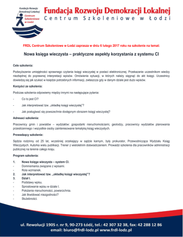 FRDL Centrum Szkoleniowe w Łodzi zaprasza w dniu 6 lutego 2017 roku na szkolenie na temat: Nowa księga wieczysta – praktyczne aspekty korzystania z systemu CI Cele szkolenia: Podwyższenie umiejętności sprawnego czytania księgi wieczystej w postaci elektronicznej. Przekazanie uczestnikom wiedzy niezbędnej do poprawnej interpretacji wpisów. Omówienie sytuacji, w których należy sięgnąć do akt księgi. Uczestnicy dowiedzą się jak szukać w księdze potrzebnych informacji, zwłaszcza gdy w danym dziale jest dużo wpisów. Korzyści ze szkolenia: Podczas szkolenia odpowiemy między innymi na następujące pytania: - Co to jest CI? - Jak interpretować tzw. „okładkę księgi wieczystej”? - Jak posługiwać się powszechnie dostępnym obrazem księgi wieczystej? Adresaci szkolenia: Pracownicy gmin i powiatów – wydziałów: gospodarki nieruchomościami, geolodzy, pracownicy wydziałów planowania przestrzennego i wszystkie osoby zainteresowane tematyką ksiąg wieczystych. Prowadzący szkolenie: Sędzia rodzinny od 25 lat, wcześniej orzekający w sądzie karnym, były prokurator, Przewodnicząca Wydziału Ksiąg Wieczystych. Autorka wielu publikacji. Trener z wieloletnim doświadczeniem. Prowadzi szkolenia dla pracowników administracji publicznej na terenie całego kraju. Program szkolenia: 1. 2. 3. - Nowa księga wieczysta – system CI. Domniemania związane z wpisami. Rola wzmianek. Jak interpretować tzw. „okładkę księgi wieczystej”? Dział I. Podstawy wpisu. Sprostowanie wpisu w dziale I. Położenie nieruchomości, powierzchnia. Jak likwidować niezgodności? Służebności. ul. Rewolucji 1905 r. nr 9, 90-273 Łódź, tel.: 42 632 63 19, fax: 42 288 12 86 email: [email protected] www.frdl-lodz.pl 4. 5. 6. 7. - Dział II. Akt notarialny. Postanowienie. Decyzja administracyjna. Inne podstawy. Własność a użytkowanie wieczyste. Podstawy wpisów. Co to są udziały? Dział III. Prawa, ujawniane w dziale III. Podstawy wpisów. Dział IV. Miejsce hipoteczne Wpisy dokonywane z urzędu. Postępowanie o uzgodnienie treści księgi wieczystej. ul. Rewolucji 1905 r. nr 9, 90-273 Łódź, tel.: 42 632 63 19, fax: 42 288 12 86 email: [email protected] www.frdl-lodz.pl Informacje organizacyjne i warunki zgłoszeń: Szkolenie odbędzie się w siedzibie FRDL Centrum Szkoleniowego w Łodzi, ul. Rewolucji 1905 roku nr 9, II PIĘTRO (DOMOFON NR 36) 6 lutego 2017 r. w godzinach 10.00 – 15.00. Cena szkolenia wynosi 319 zł netto przy zgłoszeniu do 25 stycznia. Cena po 25 stycznia wynosi 359 zł netto. RABAT 10% dla drugiej i następnej osoby z tej samej instytucji. Zwolnione z VAT w przypadku finansowania ze środków publicznych. W cenie szkolenia materiały szkoleniowe, zaświadczenie, lunch oraz przerwy kawowe. Płatność przelewem na podstawie wystawionej faktury w dniu szkolenia. Prosimy o przesyłanie zgłoszeń 31 stycznia 2017 r. na adres mailowy [email protected] wysyłając uzupełnioną kartę zgłoszenia faksem na numer wysyłając uzupełnioną kartę zgłoszenia 42 / 288 12 86 przez formularz elektroniczny zamieszczony na www.frdl-lodz.pl Szkolenia realizujemy również w formie zamkniętej na terenie instytucji. Zapytania prosimy kierować na adres mailowy [email protected] Zgłoszenie na szkolenie nt. Nowa księga wieczysta – praktyczne aspekty korzystania z systemu CI. w dniu 6 lutego 2017 r Instytucja (dane do faktury) ……………………………………………………………………………………………………………………………………………………………….. Adres: ....................................................................................................................................................... Tel: ...................................................................................................................... NIP: ..................................................................................... E-mail: ....................................................................................................................... Osoby delegowane do udziału w szkoleniu (prosimy o podanie imienia i nazwiska oraz stanowiska uczestnika szkolenia): 1. .................................................................................................................................................................................................................................................................... 2. .................................................................................................................................................................................................................................................................... 3. .................................................................................................................................................................................................................................................................... Oświadczam, że szkolenie dla ww. pracowników jest kształceniem zawodowym finansowanym w całości lub co najmniej 70% ze środków publicznych (niepotrzebne skreślić) TAK / NIE …………………….……..…….. podpis UWAGA! O udziale w szkoleniu decyduje przesłanie do Centrum karty zgłoszenia co jest równoznaczne z zakwalifikowaniem się na wybrane szkolenie i akceptacją zapisów znajdujących się w dostępnym na stronie www.frdl-lodz.pll regulaminem udziału w szkoleniach otwartych. ul. Rewolucji 1905 r. nr 9, 90-273 Łódź, tel.: 42 632 63 19, fax: 42 288 12 86 email: [email protected] www.frdl-lodz.pl