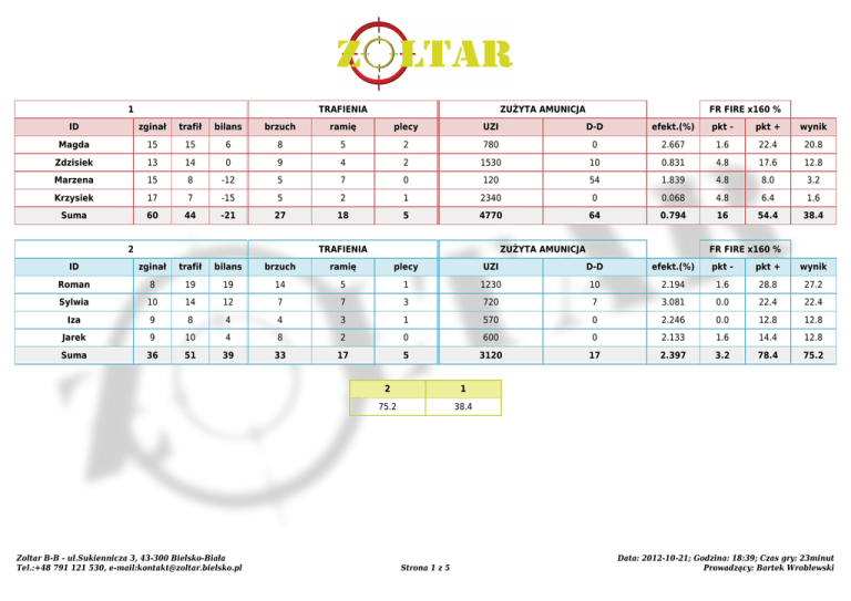 1 TRAFIENIA ZUŻYTA AMUNICJA FR FIRE x160 % ID zginał trafił bilans brzuch ramię plecy UZI D-D efekt.(%) pkt - pkt + wynik Magda 15 15 6 8 5 2 780 0 2.667 1.6 22.4 20.8 Zdzisiek 13 14 0 9 4 2 1530 10 0.831 4.8 17.6 12.8 Marzena 15 8 -12 5 7 0 120 54 1.839 4.8 8.0 3.2 Krzysiek 17 7 -15 5 2 1 2340 0 0.068 4.8 6.4 1.6 Suma 60 44 -21 27 18 5 4770 64 0.794 16 54.4 38.4 2 TRAFIENIA ZUŻYTA AMUNICJA FR FIRE x160 % ID zginał trafił bilans brzuch ramię plecy UZI D-D efekt.(%) pkt - pkt + wynik Roman 8 19 19 14 5 1 1230 10 2.194 1.6 28.8 27.2 Sylwia 10 14 12 7 7 3 720 7 3.081 0.0 22.4 22.4 Iza 9 8 4 4 3 1 570 0 2.246 0.0 12.8 12.8 Jarek 9 10 4 8 2 0 600 0 2.133 1.6 14.4 12.8 Suma 36 51 39 33 17 5 3120 17 2.397 3.2 78.4 75.2 Zoltar B-B - ul.Sukiennicza 3, 43-300 Bielsko-Biała Tel.:+48 791 121 530, e-mail:[email protected] 2 1 75.2 38.4 Strona 1 z 5 Data: 2012-10-21; Godzina: 18:39; Czas gry: 23minut Prowadzący: Bartek Wroblewski 1 TRAFIENIA ZUŻYTA AMUNICJA ID zginał trafił bilans brzuch ramię plecy UZI D-D efekt.(%) wynik Krzysiek 14 17 3 7 10 1 1980 1 0.858 17.0 Magda 18 16 -2 8 4 4 870 0 1.839 16.0 Marzena 14 7 -7 2 3 2 1380 22 0.499 7.0 Zdzisiek 18 5 -13 2 4 1 1110 0 0.450 5.0 Suma 64 45 -19 19 21 8 5340 23 0.839 45 2 TRAFIENIA ZUŻYTA AMUNICJA ID zginał trafił bilans brzuch ramię plecy UZI D-D efekt.(%) wynik Roman 11 28 17 20 11 1 1980 0 1.414 28.0 Iza 14 19 5 15 6 0 1590 1 1.194 19.0 Jarek 11 11 0 9 2 0 1290 0 0.853 11.0 Sylwia 9 6 -3 2 4 0 690 0 0.870 6.0 Suma 45 64 19 46 23 1 5550 1 1.153 64 Zoltar B-B - ul.Sukiennicza 3, 43-300 Bielsko-Biała Tel.:+48 791 121 530, e-mail:[email protected] 2 1 64 45 Strona 2 z 5 Data: 2012-10-21; Godzina: 19:08; Czas gry: 23minut Prowadzący: Bartek Wroblewski Drużyny Miejsce Nazwa Zoltar B-B - ul.Sukiennicza 3, 43-300 Bielsko-Biała Tel.:+48 791 121 530, e-mail:[email protected] Rozgrywki 1 2 Suma 2 75.2 64 139.2 1 38.4 45 Strona 3 z 5 83.4 Data: 2012-10-21 Prowadzący: Bartek Wroblewski Zestawienie wg wyniku Miejsce TRAFIENIA ZUŻYTA AMUNICJA ID zginał trafił bilans brzuch ramię plecy UZI D-D efekt.(%) pkt - pkt + wynik Roman 24.78 61.30 47.22 44.35 20.87 2.61 4186.96 13.04 1.714 2.09 74.09 72.00 Magda 43.04 40.43 4.96 20.87 11.74 7.83 2152.17 0.00 2.230 2.09 50.09 48.00 Iza 30.00 35.22 11.48 24.78 11.74 1.30 2817.39 1.30 1.472 0.00 41.48 41.48 4 Sylwia 24.78 26.09 12.26 11.74 14.35 3.91 1839.13 9.13 2.004 0.00 37.04 37.04 5 Jarek 26.09 27.39 4.96 22.17 5.22 0.00 2465.22 0.00 1.259 2.09 33.13 31.04 6 Krzysiek 40.43 31.30 -16.17 15.65 15.65 2.61 5634.78 1.30 0.430 6.26 30.52 24.26 7 Zdzisiek 40.43 24.78 -17.22 14.35 10.43 3.91 3443.48 13.04 0.672 6.26 29.48 23.22 8 Marzena 37.83 19.57 -24.52 9.13 13.04 2.61 1956.52 99.13 0.647 6.26 19.57 13.30 Zestawienie wg bilansu Miejsce TRAFIENIA ZUŻYTA AMUNICJA ID zginał trafił bilans brzuch ramię plecy UZI D-D efekt.(%) pkt - pkt + wynik Roman 24.78 61.30 47.22 44.35 20.87 2.61 4186.96 13.04 1.714 2.09 74.09 72.00 Sylwia 24.78 26.09 12.26 11.74 14.35 3.91 1839.13 9.13 2.004 0.00 37.04 37.04 Iza 30.00 35.22 11.48 24.78 11.74 1.30 2817.39 1.30 1.472 0.00 41.48 41.48 Magda 43.04 40.43 20.87 11.74 7.83 2152.17 0.00 2.230 2.09 50.09 48.00 Jarek 26.09 27.39 22.17 5.22 0.00 2465.22 0.00 1.259 2.09 33.13 31.04 5 Krzysiek 40.43 31.30 -16.17 15.65 15.65 2.61 5634.78 1.30 0.430 6.26 30.52 24.26 6 Zdzisiek 40.43 24.78 -17.22 14.35 10.43 3.91 3443.48 13.04 0.672 6.26 29.48 23.22 7 Marzena 37.83 19.57 -24.52 9.13 13.04 2.61 1956.52 99.13 0.647 6.26 19.57 13.30 4 Zoltar B-B - ul.Sukiennicza 3, 43-300 Bielsko-Biała Tel.:+48 791 121 530, e-mail:[email protected] 4.96 Strona 4 z 5 Data: 2012-10-21 Prowadzący: Bartek Wroblewski Zestawienie wg efektywności Miejsce TRAFIENIA ZUŻYTA AMUNICJA ID zginał trafił bilans brzuch ramię plecy UZI D-D efekt.(%) pkt - pkt + wynik Magda 43.04 40.43 4.96 20.87 11.74 7.83 2152.17 0.00 2.230 2.09 50.09 48.00 Sylwia 24.78 26.09 12.26 11.74 14.35 3.91 1839.13 9.13 2.004 0.00 37.04 37.04 Roman 24.78 61.30 47.22 44.35 20.87 2.61 4186.96 13.04 1.714 2.09 74.09 72.00 4 Iza 30.00 35.22 11.48 24.78 11.74 1.30 2817.39 1.30 1.472 0.00 41.48 41.48 5 Jarek 26.09 27.39 4.96 22.17 5.22 0.00 2465.22 0.00 1.259 2.09 33.13 31.04 6 Zdzisiek 40.43 24.78 -17.22 14.35 10.43 3.91 3443.48 13.04 0.672 6.26 29.48 23.22 7 Marzena 37.83 19.57 -24.52 9.13 13.04 2.61 1956.52 99.13 0.647 6.26 19.57 13.30 8 Krzysiek 40.43 31.30 -16.17 15.65 15.65 2.61 5634.78 1.30 0.430 6.26 30.52 24.26 Zoltar B-B - ul.Sukiennicza 3, 43-300 Bielsko-Biała Tel.:+48 791 121 530, e-mail:[email protected] Strona 5 z 5 Data: 2012-10-21 Prowadzący: Bartek Wroblewski