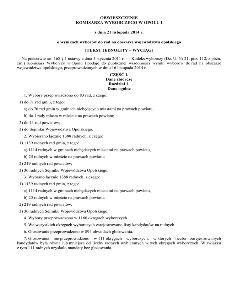 OBWIESZCZENIE KOMISARZA WYBORCZEGO W OPOLU I z dnia 21 listopada 2014 r. o wynikach wyborów do rad na obszarze województwa opolskiego [TEKST JEDNOLITY – WYCIĄG] Na podstawie art. 168 § 1 ustawy z dnia 5 stycznia 2011 r. — Kodeks wyborczy (Dz. U. Nr 21, poz. 112, z późn. zm.) Komisarz Wyborczy w Opolu I podaje do publicznej wiadomości wyniki wyborów do rad na obszarze województwa opolskiego, przeprowadzonych w dniu 16 listopada 2014 r. CZĘŚĆ I. Dane zbiorcze Rozdział 1. Dane ogólne 1. Wybory przeprowadzono do 83 rad, z czego: 1) do 71 rad gmin, z tego: a) do 70 rad gmin w gminach niebędących miastami na prawach powiatu, b) do 1 rady miasta w mieście na prawach powiatu; 2) do 11 rad powiatów; 3) do Sejmiku Województwa Opolskiego. 2. Wybierano łącznie 1388 radnych, z czego: 1) 1139 radnych rad gmin, z tego: a) 1114 radnych w gminach niebędących miastami na prawach powiatu, b) 25 radnych w mieście na prawach powiatu; 2) 219 radnych rad powiatów; 3) 30 radnych Sejmiku Województwa Opolskiego. 3. Wybrano łącznie 1388 radnych, z czego: 1) 1139 radnych rad gmin, z tego: a) 1114 radnych w gminach niebędących miastami na prawach powiatu, b) 25 radnych w mieście na prawach powiatu; 2) 219 radnych rad powiatów; 3) 30 radnych Sejmiku Województwa Opolskiego. 4. Wybory przeprowadzono w 1166 okręgach wyborczych. 5. We wszystkich okręgach wyborczych zarejestrowano listy kandydatów na radnych. 6. Głosowanie przeprowadzono w 894 obwodach głosowania. 7. Głosowania nie przeprowadzono w 111 okręgach wyborczych, w których liczba zarejestrowanych kandydatów była równa lub mniejsza od liczby radnych wybieranych w tych okręgach wyborczych. W związku z tym 111 radnych uzyskało mandaty bez głosowania. CZĘŚĆ II. Szczegółowe wyniki wyborów DZIAŁ I. Wybory do rad gmin w gminach niebędących miastami na prawach powiatu Rozdział 26. Wybory do Rady Gminy Komprachcice Dane o liczbie mandatów uzyskanych przez poszczególne komitety wyborcze: Komitet Wyborczy Wyborców Nasz Samorząd 7 Komitet Wyborczy Wyborców Mniejszość Niemiecka 5 Komitet Wyborczy Stowarzyszenie na Rzecz Rozwoju Wsi Ochodze 2 Komitet Wyborczy Wyborców Aktywni Gminy Komprachcice 1 Radnymi zostali wybrani: Lp. Nazwisko i imię-imiona 1. AUGUSTYNIAK Sławomir 2. BODZIOCH Anna 3. DYDZIK Łukasz 4. 5. FELGER Florian Patryk GWIZDAK Maria Marcela 6. KREMER Józef Michał 7. NEUMANN Maria Marta 8. PAWLETA Daniel Paweł 9. PAWLETA Paweł 10. PIECHACZEK Damian Sebastian 11. PURUL Piotr Jan 12. 13. SZOPA Krzysztof TRYBUŁA Andrzej Adam 14. WENCEL Waldemar Edward 15. ZYZIK Agnieszka Jolanta Oznaczenie listy Komitet Wyborczy Stowarzyszenie na Rzecz Rozwoju Wsi Ochodze Komitet Wyborczy Wyborców Nasz Samorząd Komitet Wyborczy Stowarzyszenie na Rzecz Rozwoju Wsi Ochodze Komitet Wyborczy Wyborców Nasz Samorząd Komitet Wyborczy Wyborców Nasz Samorząd Komitet Wyborczy Wyborców Mniejszość Niemiecka Komitet Wyborczy Wyborców Mniejszość Niemiecka Komitet Wyborczy Wyborców Mniejszość Niemiecka Komitet Wyborczy Wyborców Mniejszość Niemiecka Komitet Wyborczy Wyborców Nasz Samorząd Komitet Wyborczy Wyborców Aktywni Gminy Komprachcice Komitet Wyborczy Wyborców Nasz Samorząd Komitet Wyborczy Wyborców Nasz Samorząd Komitet Wyborczy Wyborców Mniejszość Niemiecka Komitet Wyborczy Wyborców Nasz Samorząd DZIAŁ III. Wybory do rad powiatów Rozdział 9. Wybory do Rady Powiatu Opolskiego Dane o liczbie mandatów uzyskanych przez poszczególne komitety wyborcze uczestniczące w podziale mandatów: KWW Mniejszość Niemiecka KW Platforma Obywatelska RP 14 6 KWW Nasz Samorząd 3 Komitet Wyborczy PSL 1 KW Prawo i Sprawiedliwość 1 Radnymi z list uczestniczących w podziale mandatów zostali wybrani: Lp. 1. 2. 3. 4. 5. 6. 7. 8. 9. 10. 11. 12. 13. 14. 15. 16. 17. 18. 19. 20. 21. 22. 23. 24. 25. Nazwisko i imię-imiona CEBULA Krzysztof Paweł CICHOS Krystian Marcin DENDERA Konrad GÓRSKI Kazimierz Stanisław GRODZIECKA-MAKULSKA Agnieszka Ludmiła GRYC Antoni Józef HALUPCZOK Norbert Franciszek KARPA Jan KOTOŃSKA Zofia Maria KRZESIŃSKI Jan KUBÓW Przemysław Wojciech LAKWA Henryk Ryszard MOHLEK Rudolf Edward PŁOSZAJ Leonarda SMOLAREK Paweł Piotr STELMACH Sybilla SZAFRAŃSKI Piotr Józef ŚWIERC Joachim Alfred TRYCHAN Alicja Teresa WARZECHA Stefan Jerzy WITTEK Monika Jadwiga WOJTASIK Helena Dorota WRÓBEL Henryk Leon WYSDAK Krzysztof Wiktor ZAPIÓR Henryk Tadeusz Oznaczenie listy KWW Mniejszość Niemiecka KWW Mniejszość Niemiecka KWW Nasz Samorząd KW Platforma Obywatelska RP KW Platforma Obywatelska RP KWW Mniejszość Niemiecka KWW Mniejszość Niemiecka KWW Nasz Samorząd KW Platforma Obywatelska RP Komitet Wyborczy PSL KW Prawo i Sprawiedliwość KWW Mniejszość Niemiecka KWW Mniejszość Niemiecka KW Platforma Obywatelska RP KWW Mniejszość Niemiecka KWW Mniejszość Niemiecka KW Platforma Obywatelska RP KWW Mniejszość Niemiecka KW Platforma Obywatelska RP KWW Mniejszość Niemiecka KWW Mniejszość Niemiecka KWW Nasz Samorząd KWW Mniejszość Niemiecka KWW Mniejszość Niemiecka KWW Mniejszość Niemiecka DZIAŁ IV. Wybory do Sejmiku Województwa Opolskiego Dane o liczbie mandatów uzyskanych przez poszczególne komitety wyborcze uczestniczące w podziale mandatów: KW Platforma Obywatelska RP 9 Komitet Wyborczy PSL 8 KWW Mniejszość Niemiecka 7 KW Prawo i Sprawiedliwość 5 KKW SLD Lewica Razem 1 Radnymi z list uczestniczących w podziale mandatów zostali wybrani: Lp. 1. 2. 3. 4. 5. 6. 7. 8. 9. 10. 11. 12. 13. 14. 15. 16. 17. 18. 19. 20. 21. 22. 23. 24. 25. 26. 27. 28. 29. 30. Nazwisko i imię-imiona BUŁA Andrzej BYCZKOWSKI Dariusz Paweł CZAJA Herbert Wincenty CZOCHARA Katarzyna Beata DONITZA Ryszard Hubert FORNAL Leszek Janusz JASTRZEMBSKI Antoni Piotr KASIURA Andrzej KOLEK Roman Jacek KOŁODZIEJ Hubert Jerzy KONOPKA Antoni Jacek KOSTUŚ Tomasz Tadeusz KOTYŚ Józef Franciszek KRAJCZY Norbert Jan KUCHCZYŃSKI Ryszard Bogusław KUREK Elżbieta NIEDŹWIECKI Jerzy Józef NOWOSIELSKA