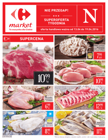 NIE PRZEGAP! SUPEROFERTA TYGODNIA oferta handlowa ważna od 13.04 do 19.04.2016 SUPERCENA Flaki wołowe gotowane krojone 500 g, 15,98/kg 799 opak. Karkówka wieprzowa bez kości 10 99 kg 1099 kg Skrzydło, podudzie z indyka Boczek wieprzowy 699 1299 kg bez kości kg filet mrożony glazura 35 % Filety śledziowe à la matias ekstra* 899 1199 Mintaj* kg carrefour.pl Filet z uda kurczaka kg *Oferta dotyczy sklepów z działem wędlin, serów i ryb w sprzedaży tradycyjnej. produkt krajowy Gruszki kraj pochodzenia Holandia 399 kg Ogórki krótkie 599 kg Winogrona białe bezpestkowe kraj pochodzenia Indie 999 kg Pomidory cherry 250 g, 11,96/kg kraj pochodzenia Hiszpania 299 opak. Ziemniaki młode kraj pochodzenia Cypr 2 99 kg Orzechy ziemne niesolone 1 kg 999 opak. Pączek z nadzieniem Chleb razowy, ze słonecznikiem 475 g, 5,66/kg 269 szt. 099 szt. Oferta ważna do wyczerpania zapasów. Ceny towarów podane są w PLN. Zdjęcia towarów mogą odbiegać od rzeczywistości. Nie prowadzimy sprzedaży hurtowej. Za ewentualne błędy w druku przepraszamy. carrefour.pl Znajdź swój sklep z aktualną ofertą gazetki. 1S15BvC