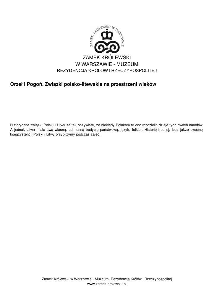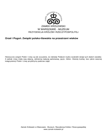 ZAMEK KRÓLEWSKI W WARSZAWIE - MUZEUM REZYDENCJA KRÓLÓW I RZECZYPOSPOLITEJ Orzeł i Pogoń. Związki polsko-litewskie na przestrzeni wieków Historyczne związki Polski i Litwy są tak oczywiste, że niekiedy Polakom trudno rozdzielić dzieje tych dwóch narodów. A jednak Litwa miała swą własną, odmienną tradycję państwową, język, folklor. Historię trudnej, lecz jakże owocnej koegzystencji Polski i Litwy przybliżymy podczas zajęć. Zamek Królewski w Warszawie - Muzeum. Rezydencja Królów i Rzeczypospolitej www.zamek-krolewski.pl