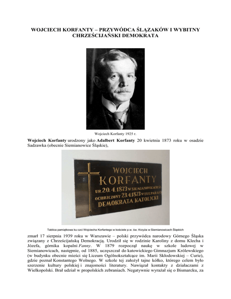 WOJCIECH KORFANTY – PRZYWÓDCA ŚLĄZAKÓW I WYBITNY CHRZEŚCIJAŃSKI DEMOKRATA Wojciech Korfanty 1925 r. Wojciech Korfanty urodzony jako Adalbert Korfanty 20 kwietnia 1873 roku w osadzie Sadzawka (obecnie Siemianowice Śląskie), Tablica pamiątkowa ku czci Wojciecha Korfantego w kościele p.w. św. Krzyża w Siemianowicach Śląskich zmarł 17 sierpnia 1939 roku w Warszawie – polski przywódca narodowy Górnego Śląska związany z Chrześcijańską Demokracją. Urodził się w rodzinie Karoliny z domu Klecha i Józefa, górnika kopalni Fanny. W 1879 rozpoczął naukę w szkole ludowej w Siemianowicach, następnie, od 1885, uczęszczał do katowickiego Gimnazjum Królewskiego (w budynku obecnie mieści się Liceum Ogólnokształcące im. Marii Skłodowskiej – Curie), gdzie poznał Konstantego Wolnego. W szkole tej założył tajne kółko, którego celem było szerzenie kultury polskiej i znajomości literatury. Nawiązał kontakty z działaczami z Wielkopolski. Brał udział w propolskich zebraniach. Negatywnie wyrażał się o Bismarcku, za co został relegowany 14 sierpnia 1895 z klasy maturalnej. Szkołę średnią ukończył w grudniu 1895, po interwencji Józefa Kościelskiego, posła do Reichstagu z Wielkopolski , jako ekstern i jeszcze w tym samym roku rozpoczął studia na politechnice w Charlottenburgu. Tablica pamiątkowa w murach Uniwersytetu Wrocławskiego Jesienią 1896 przeniósł się na Królewski Uniwersytet we Wrocławiu (Königliche Universität zu Breslau). Mieszkał w pokoju wynajętym przy Ottostraße 19 (dziś ul. Kazimierza Jagiellończyka), studiował na Wydziale Filozoficznym i zaliczył dwa semestry roku akademickiego 1896/1897. Przerwał studia na dwa lata, podczas których jako korepetytor u litewskiego arystokraty Witolda Jundziłły zarobił pieniądze na dalsze studia. Podjął studia na tym samym wydziale, miał m.in. zajęcia z ekonomii politycznej u profesora Wernera Sombarta, z którym utrzymywał kontakty jeszcze przez wiele lat. Mieszkał w tym czasie w pensjonacie przy Neue Junkerstrasse 5c, (ul. Jana Kilińskiego). W maju 1901 przeniósł się na ostatni semestr do Berlina, gdzie w sierpniu zakończył studia. Działalność polityczna W latach 1901–1908 był członkiem Ligi Narodowej, w ramach której współpracował z Romanem Dmowskim. Od 1901 był redaktorem naczelnym Górnoślązaka. W 1902 przebywał w więzieniu we Wronkach za publikację artykułów pt. Do Niemców i Do moich braci Górnoślązaków. W latach 1903–1912 i 1918 poseł do Reichstagu oraz pruskiego Landtagu (1903–1918), gdzie przystąpił do Koła Polskiego, podczas gdy śląscy Polacy przystępowali do tej pory do klubu parlamentarnego Niemieckiej Partii Centrum. W 1905 Korfanty zainicjował w Katowicach wydawanie organu prasowego górnośląskiej endecji p.t. "Polak", którego był redaktorem naczelnym oraz właścicielem. Pismo wychodziło trzy razy w tygodniu. W czerwcu 1918 wygrał wybory uzupełniające do Reichstagu niemal dwukrotną przewagą. Konkurując z Benno Nehlertem, zyskał nawet poparcie Niemców, mimo że opowiadał się za oderwaniem od Cesarstwa Niemieckiego Śląska, Wielkopolski i części Pomorza. 25 października 1918 wystąpił w Reichstagu z głośnym żądaniem przyłączenia do państwa polskiego wszystkich ziem polskich zaboru pruskiego oraz Górnego Śląska. 24 maja 1909 zawiązało się w Poznaniu Polskie Towarzystwo Demokratyczne, którego celem miało być zespolenie żywiołów demokratycznych ku obronie bytu narodowego oraz pracy nad rozwojem żywiołu polskiego w Rzeszy niemieckiej. Do rady głównej weszli z Poznania m.in.: Antoni Chłapowski, Bernard Chrzanowski, Jan Zabłocki, ze Śląska poseł Wojciech Korfanty, a z wychodźstwa Stanisław Kochowicz. W latach 1918–1919 był członkiem Naczelnej Rady Ludowej stanowiącej rząd Wielkopolski podczas powstania wielkopolskiego. W 1920 był Polskim Komisarzem Plebiscytowym na Górnym Śląsku. Wielokrotnie występował publicznie na wiecach, agitując za Polską. W jednym ze swoich wystąpień rzekomo obiecał każdemu rolnikowi krowę za oddanie głosu za Polską. Od tego wydarzenia sprawa zyskała nazwę "krowy Korfantego”. Po niekorzystnej dla Polaków interpretacji wyników plebiscytu, przeprowadzonego zresztą w atmosferze wzajemnego zastraszenia, terroru oraz obustronnej manipulacji (np. po stronie niemieckiej sprowadzenie 180 000 wyborców niezwiązanych bezpośrednio ze Śląskiem), proklamował i stanął na czele III powstania śląskiego. W tym momencie pojawiają się pierwsze poważniejsze kontrowersje związane z jego osobą. Albowiem Korfanty nie wierzył w szanse powodzenia powstania, widząc w nim jedynie zbrojną manifestację ludu górnośląskiego, która miała polegać na zwróceniu uwagi Komisji Międzysojuszniczej mającej dokonać podziału terenu plebiscytowego między Polskę a Niemcy. Dlatego też zarządził wstrzymanie walk jeszcze w czasie, gdy inicjatywa na froncie należała do Polaków. Obrońcy Korfantego wskazują, że Polacy mieli przewagę w starciach z nacjonalistycznymi bojówkami, ale nie mieliby żadnych szans z regularną armią niemiecką, zaś ostateczną decyzję w sprawie Śląska i tak podjęła Komisja Międzysojusznicza niezależnie od wyniku walk, które mogły stanowić jedynie posiłkowy argument. Jednak utrata inicjatywy powstańców na froncie nastąpiła dopiero po decyzjach dyktatora. W lipcu 1921 opuścił Śląsk, desygnując na stanowisko swego następcy Józefa Rymera, który wkrótce został przewodniczącym Naczelnej Rady Ludowej na Górnym Śląsku. Pomnik Wojciecha Korfantego w Katowicach W odrodzonej Polsce w latach 1922–1930 sprawował mandat posła na Sejm I i II kadencji. Związany był z Chrześcijańską Demokracją (ChD). W obliczu niepowodzenia misji stworzenia gabinetu Artura Śliwińskiego, 14 lipca 1922 został desygnowany przez Komisję Główną Sejmu RP na premiera rządu. Jednak wobec protestu