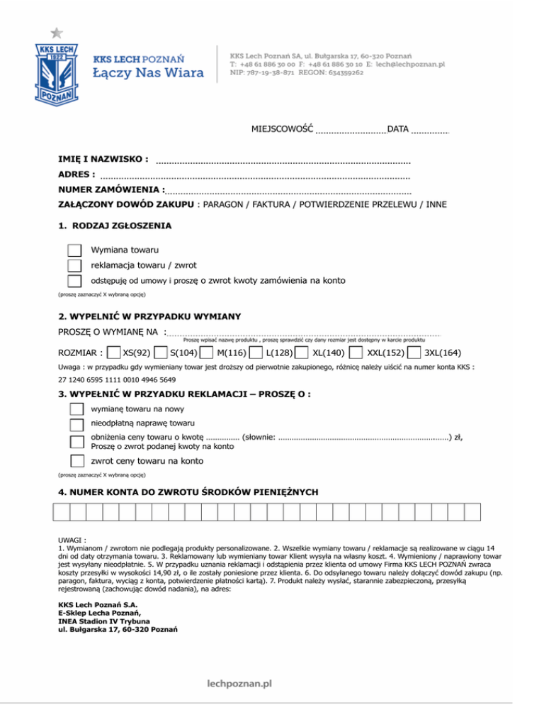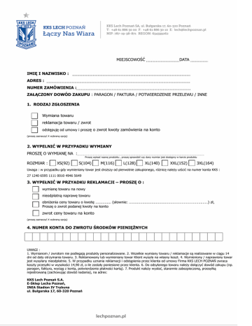MIEJSCOWOŚĆ DATA IMIĘ I NAZWISKO : ADRES : NUMER ZAMÓWIENIA : ZAŁĄCZONY DOWÓD ZAKUPU : PARAGON / FAKTURA / POTWIERDZENIE PRZELEWU / INNE 1. RODZAJ ZGŁOSZENIA Wymiana towaru reklamacja towaru / zwrot odstępuję od umowy i proszę o zwrot kwoty zamówienia na konto (proszę zaznaczyć X wybraną opcję) 2. WYPELNIĆ W PRZYPADKU WYMIANY PROSZĘ O WYMIANĘ NA : Proszę wpisać nazwę produktu , proszę sprawdzić czy dany rozmiar jest dostępny w karcie produktu ROZMIAR : XS(92) S(104) M(116) L(128) XL(140) XXL(152) 3XL(164) Uwaga : w przypadku gdy wymieniany towar jest droższy od pierwotnie zakupionego, różnicę należy uiścić na numer konta KKS : 27 1240 6595 1111 0010 4946 5649 3. WYPEŁNIĆ W PRZYADKU REKLAMACJI – PROSZĘ O : wymianę towaru na nowy nieodpłatną naprawę towaru obniżenia ceny towaru o kwotę …………… (słownie: …………………………………………………………….……) zł, Proszę o zwrot podanej kwoty na konto zwrot ceny towaru na konto (proszę zaznaczyć X wybraną opcję) 4. NUMER KONTA DO ZWROTU ŚRODKÓW PIENIĘŻNYCH UWAGI : 1. Wymianom / zwrotom nie podlegają produkty personalizowane. 2. Wszelkie wymiany towaru / reklamacje są realizowane w ciągu 14 dni od daty otrzymania towaru. 3. Reklamowany lub wymieniany towar Klient wysyła na własny koszt. 4. Wymieniony / naprawiony towar jest wysyłany nieodpłatnie. 5. W przypadku uznania reklamacji i odstąpienia przez klienta od umowy Firma KKS LECH POZNAŃ zwraca koszty przesyłki w wysokości 14,90 zł, o ile zostały poniesione przez klienta. 6. Do odsyłanego towaru należy dołączyć dowód zakupu (np. paragon, faktura, wyciąg z konta, potwierdzenie płatności kartą). 7. Produkt należy wysłać, starannie zabezpieczoną, przesyłką rejestrowaną (zachowując dowód nadania), na adres: KKS Lech Poznań S.A. E-Sklep Lecha Poznań, INEA Stadion IV Trybuna ul. Bułgarska 17, 60-320 Poznań
