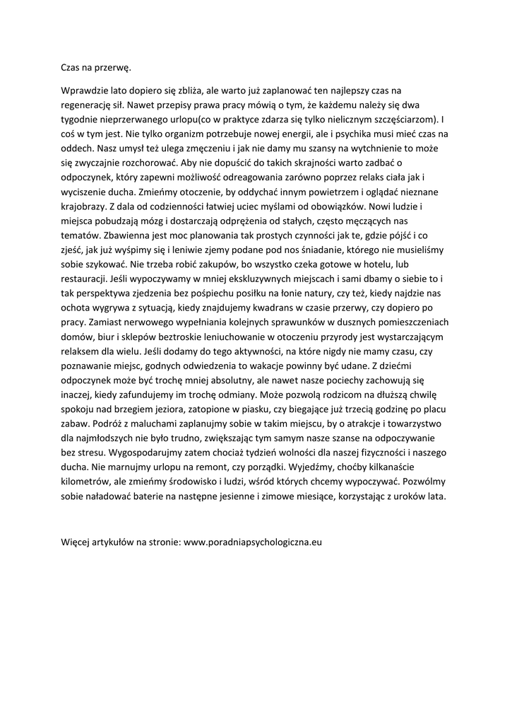 Czas na przerwę. Wprawdzie lato dopiero się zbliża, ale warto już zaplanować ten najlepszy czas na regenerację sił. Nawet przepisy prawa pracy mówią o tym, że każdemu należy się dwa tygodnie nieprzerwanego urlopu(co w praktyce zdarza się tylko nielicznym szczęściarzom). I coś w tym jest. Nie tylko organizm potrzebuje nowej energii, ale i psychika musi mieć czas na oddech. Nasz umysł też ulega zmęczeniu i jak nie damy mu szansy na wytchnienie to może się zwyczajnie rozchorować. Aby nie dopuścić do takich skrajności warto zadbać o odpoczynek, który zapewni możliwość odreagowania zarówno poprzez relaks ciała jak i wyciszenie ducha. Zmieńmy otoczenie, by oddychać innym powietrzem i oglądać nieznane krajobrazy. Z dala od codzienności łatwiej uciec myślami od obowiązków. Nowi ludzie i miejsca pobudzają mózg i dostarczają odprężenia od stałych, często męczących nas tematów. Zbawienna jest moc planowania tak prostych czynności jak te, gdzie pójść i co zjeść, jak już wyśpimy się i leniwie zjemy podane pod nos śniadanie, którego nie musieliśmy sobie szykować. Nie trzeba robić zakupów, bo wszystko czeka gotowe w hotelu, lub restauracji. Jeśli wypoczywamy w mniej ekskluzywnych miejscach i sami dbamy o siebie to i tak perspektywa zjedzenia bez pośpiechu posiłku na łonie natury, czy też, kiedy najdzie nas ochota wygrywa z sytuacją, kiedy znajdujemy kwadrans w czasie przerwy, czy dopiero po pracy. Zamiast nerwowego wypełniania kolejnych sprawunków w dusznych pomieszczeniach domów, biur i sklepów beztroskie leniuchowanie w otoczeniu przyrody jest wystarczającym relaksem dla wielu. Jeśli dodamy do tego aktywności, na które nigdy nie mamy czasu, czy poznawanie miejsc, godnych odwiedzenia to wakacje powinny być udane. Z dziećmi odpoczynek może być trochę mniej absolutny, ale nawet nasze pociechy zachowują się inaczej, kiedy zafundujemy im trochę odmiany. Może pozwolą rodzicom na dłuższą chwilę spokoju nad brzegiem jeziora, zatopione w piasku, czy biegające już trzecią godzinę po placu zabaw. Podróż z maluchami zaplanujmy sobie w takim miejscu, by o atrakcje i towarzystwo dla najmłodszych nie było trudno, zwiększając tym samym nasze szanse na odpoczywanie bez stresu. Wygospodarujmy zatem chociaż tydzień wolności dla naszej fizyczności i naszego ducha. Nie marnujmy urlopu na remont, czy porządki. Wyjedźmy, choćby kilkanaście kilometrów, ale zmieńmy środowisko i ludzi, wśród których chcemy wypoczywać. Pozwólmy sobie naładować baterie na następne jesienne i zimowe miesiące, korzystając z uroków lata. Więcej artykułów na stronie: www.poradniapsychologiczna.eu