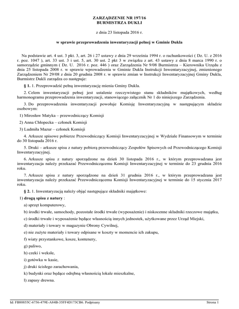 ZARZĄDZENIE NR 197/16 BURMISTRZA DUKLI z dnia 23 listopada 2016 r. w sprawie przeprowadzenia inwentaryzacji pełnej w Gminie Dukla Na podstawie art. 4 ust. 3 pkt. 3, art. 26 i 27 ustawy z dnia 29 września 1994 r. o rachunkowości ( Dz. U. z 2016 r. poz. 1047 ), art. 33 ust. 3 i ust. 5, art. 30 ust. 2 pkt 3 w związku z art. 43 ustawy z dnia 8 marca 1990 r. o samorządzie gminnym ( Dz. U. 2016 r. poz. 446 ) oraz Zarządzenia Nr 9/08 Burmistrza – Kierownika Urzędu z dnia 25 listopada 2008 r. w sprawie wprowadzenia w Gminie Dukla Instrukcji Inwentaryzacyjnej, zmienionego Zarządzeniem Nr 29/08 z dnia 20 grudnia 2008 r. w sprawie zmian w Instrukcji Inwentaryzacyjnej Gminy Dukla, Burmistrz Dukli zarządza co następuje: § 1. 1. Przeprowadzić pełną inwentaryzację mienia Gminy Dukla. 2. Celem inwentaryzacji pełnej jest ustalenie rzeczywistego stanu składników majątkowych, według harmonogramu przeprowadzenia inwentaryzacji, stanowiącego załącznik Nr 1 do niniejszego Zarządzenia. 3. Do przeprowadzenia inwentaryzacji powołuje Komisję Inwentaryzacyjną w następującym składzie osobowym: 1) Mirosław Matyka – przewodniczący Komisji 2) Anna Chłopecka – członek Komisji 3) Ludmiła Mazur – członek Komisji 4. Arkusze spisowe pobierze Przewodniczący Komisji Inwentaryzacyjnej w Wydziale Finansowym w terminie do 30 listopada 2016 r. 5. Druki – arkusze spisu z natury pobiorą przewodniczący Zespołów Spisowych od Przewodniczącego Komisji Inwentaryzacyjnej. 6. Arkusze spisu z natury sporządzone na dzień 30 listopada 2016 r., w którym przeprowadzana jest inwentaryzacja należy przekazać Przewodniczącemu Komisji Inwentaryzacyjnej w terminie do 23 grudnia 2016 roku. 7. Arkusze spisu z natury sporządzone na dzień 31 grudnia 2016 r., w którym przeprowadzana jest inwentaryzacja należy przekazać Przewodniczącemu Komisji Inwentaryzacyjnej w terminie do 15 stycznia 2017 roku. § 2. 1. Inwentaryzacją należy objąć następujące składniki majątkowe: 1) drogą spisu z natury : a) sprzęt komputerowy, b) środki trwałe, samochody, pozostałe środki trwałe (wyposażenie) i niskocenne składniki rzeczowe majątku, c) środki trwałe i wyposażenie będące własnością innych jednostek, użytkowane przez Urząd Miejski, d) materiały i towary w magazynie Obrony Cywilnej, e) nie zużyte materiały i towary odpisane w koszty w momencie ich zakupu, f) wiaty przystankowe, kosze, kontenery, g) paliwo, h) czeki i weksle, i) gotówka w kasie, j) druki ścisłego zarachowania, k) budynki oraz będące odrębną własnością lokale mieszkalne, l) zapasy drewna. Id: FB88855C-6756-479E-A84B-35FF4D173CB6. Podpisany Strona 1 2) drogą weryfikacji danych z ksiąg rachunkowych z odpowiednimi dokumentami : a) wartości niematerialne i prawne – programy komputerowe, b) inwestycje niezakończone, c) środki trwałe – grunty, prawo wieczystego użytkowania gruntów, trwały zarząd, d) budowle – drogi, place, chodniki, ulice, parkingi, oświetlenie, składowisko odpadów, e) budowle – kanalizacja deszczowa, kanalizacja sanitarna, oczyszczalnia, wodociągi, przepompownie, agregaty, f) studnie, zbiorniki – w tym p.poż. oraz baseny p.poż., ogrodzenia oraz pozostałe urządzenia komunalne nie objęte w innych polach spisowych znajdujące się na terenie administracyjnym Gminy Dukla, g) należności i zobowiazania publiczno – prawne, h) należności sporne i wątpliwe, i) należności od osób nie prowadzących ksiąg rachunkowych, j) należności i zobowiązania wobec pracowników, k) zobowiązania, l) kapitały, fundusze i fundusze specjalne, rozliczenia międzyokresowe, m) własne składniki majątkowe powierzone kontrahentom - sprzęt komputerowy zakupiony w ramach POIG (osoby fizyczne). 3) poprzez uzyskanie pisemnego potwierdzenia sald : a) własne składniki majątkowe powierzone kontrahentom, w tym sprzęt komputerowy zakupiony w ramach POIG (jednostki budżetowe), b) środki pieniężne zgromadzone na rachunkach bankowych, c) akcje, udziały w obcych podmiotach gospodarczych, d) pożyczki i kredyty, e) salda należności z wyłączeniem ujętych w pkt 1, ppkt 2, lit. g, h, i 2. Celem sprawnego przeprowadzenia inwentaryzacji powołuje Zespoły Spisowe w składzie co najmniej trzyosobowym i określa pola spisowe do przeprowadzenia inwentaryzacji według załącznika Nr 1 do niniejszego Zarządzenia. 3. Zobowiązuje Komisję Inwentaryzacyjną oraz Zespoły do: 1) przeprowadzenia inwentaryzacji przy czynnym udziale osób materialnie odpowiedzialnych, 2) zapewnienie prawidłowego przebiegu inwentaryzacji, ustalenie przyczyn powstania różnic inwentaryzacyjnych i postawienia wniosku o sposobie ich rozliczenia, 3) przestrzegania obowiązujących przepisów o inwentaryzacji oraz zasad i sposobów wynikających z tych przepisów, 4) przekazania kompletnej dokumentacji inwentaryzacyjnej do Wydziału Finansowego w terminie do 31 stycznia 2017 roku, 5) sporządzenia rozliczenia inwentaryzacji. 4. Inwentaryzację w drodze porównania danych, o których mowa w § 2 pkt 2 przeprowadza zespół spisowy przy udziale pracowników Wydziału merytorycznie odpowiedzialnego oraz Wydziału Finansowego. § 3. Członków Komisji Inwentaryzacyjnej czyni odpowiedzialnymi za właściwe, dokładne i rzetelne przeprowadzenie inwentaryzacji, zgodnie ze stanem faktycznym. § 4. W czasie trwania inwentaryzacji urlopy wypoczynkowe będą udzielane w sposób pozwalający na sprawne przeprowadzenie inwentaryzacji. § 5. Wykonanie zarządzenia powierza Przewodniczącemu Komisji Inwentaryzacyjnej. Id: FB88855C-6756-479E-A84B-35FF4D173CB6. Podpisany Strona 2 § 6. Zarządzenie wchodzi w życie z dniem podjęcia. Burmistrz Andrzej Bytnar Id: FB88855C-6756-479E-A84B-35FF4D173CB6. Podpisany Strona 3 Załącznik nr 1 do Zarządzenia Nr 197/16 Burmistrza Dukli z dnia 23 listopada 2016 r. Harmonogram przeprowadzenia inwentaryzacji Lp. Rodzaj składników majątkowych 1. Sprzęt komputerowy 2. 3. 4. Środki tr